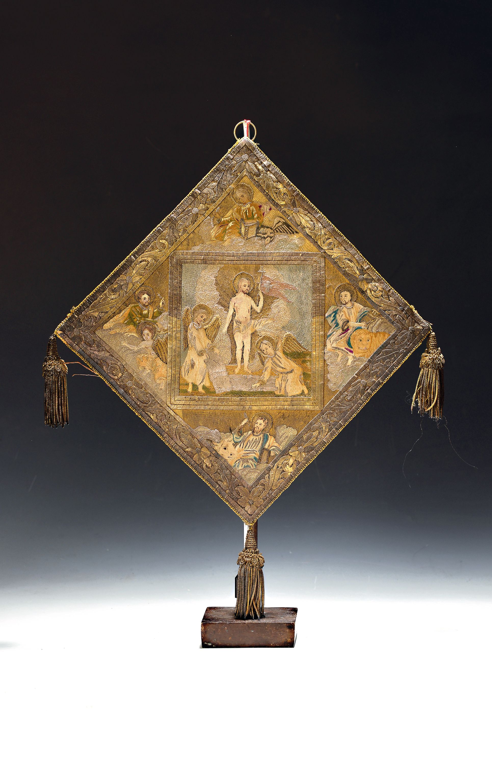Jh., rautenförmiges Tuch, dass an der Hüfte getragen wird, Goldbrokatstickerei,
