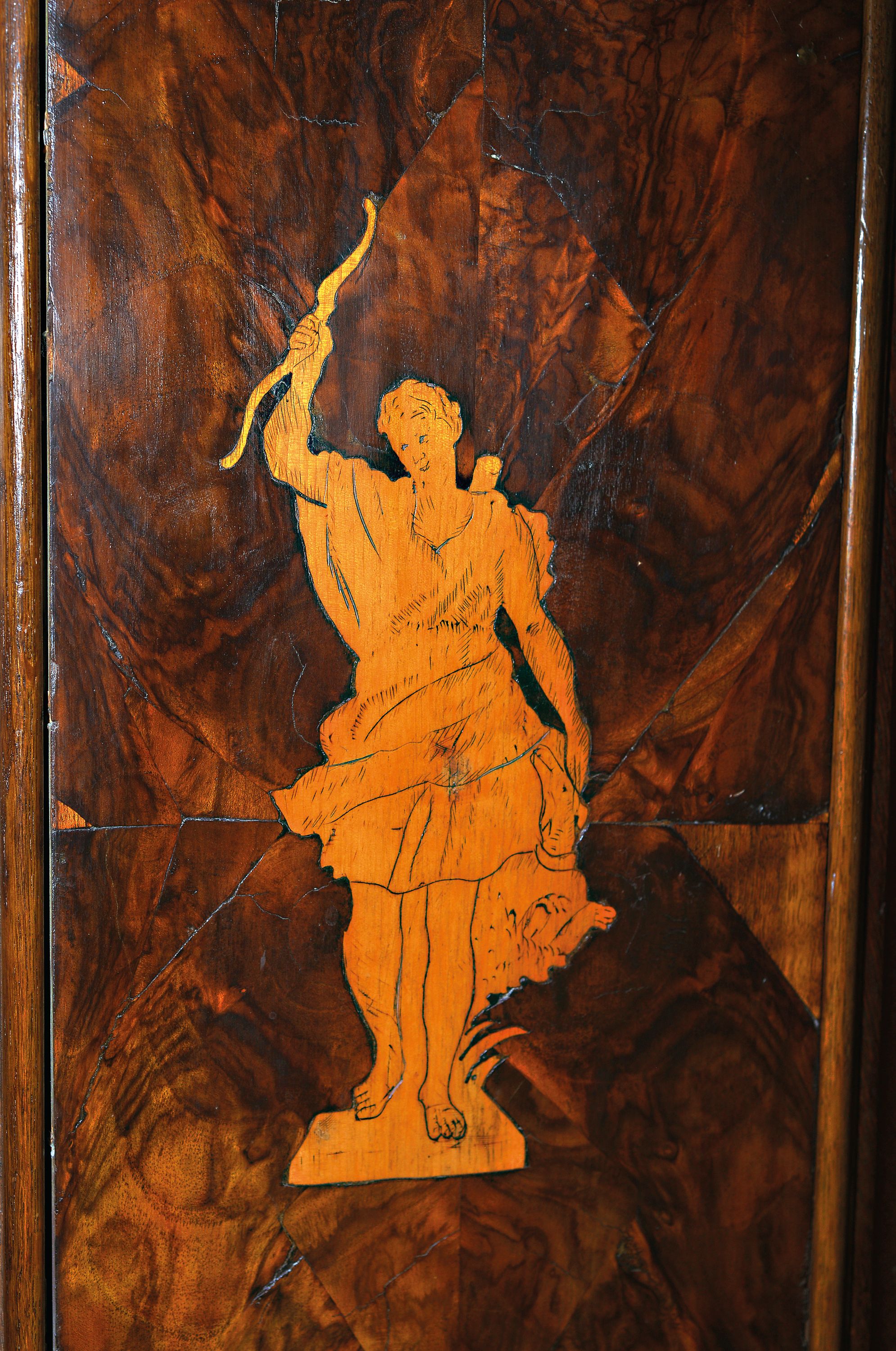 Rundgiebel, mehrfach profiliert, Türen und Seiten mit Maserholz und Pflaumenfurnier,