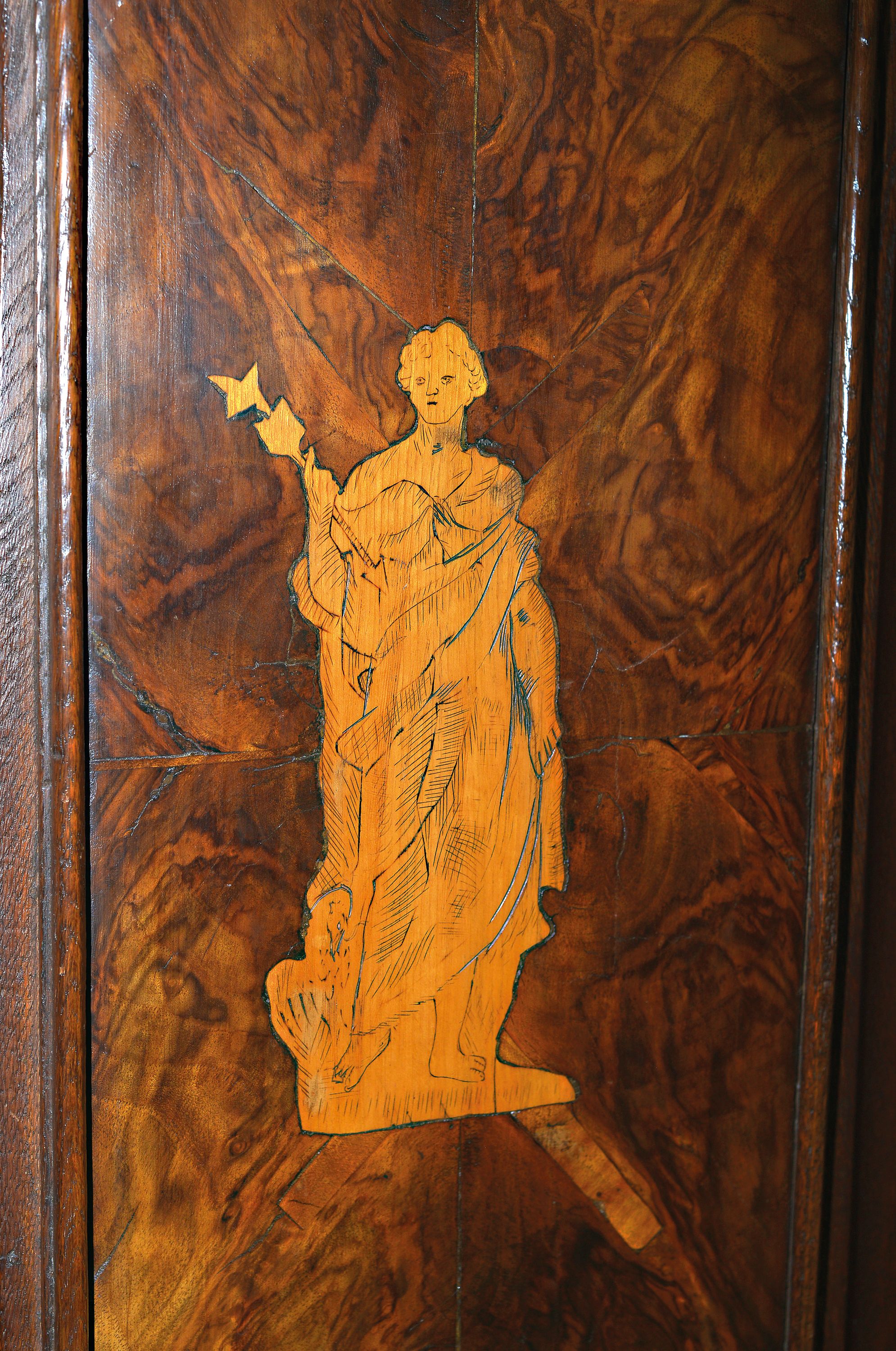 Türen mit aufwendiger figürlicher Marketerie, Seiten kassettiert und mit Reliefschnitzereien,