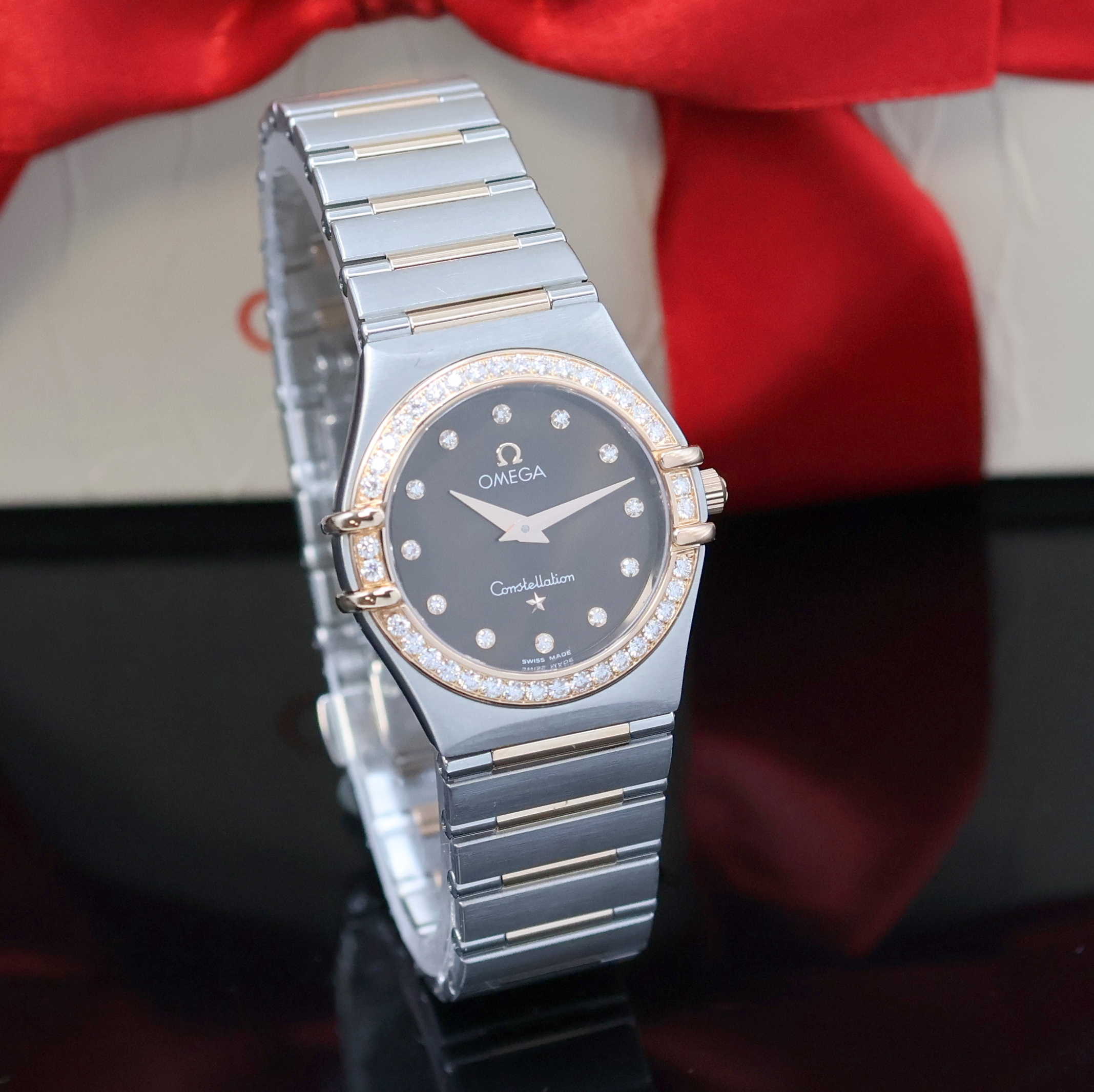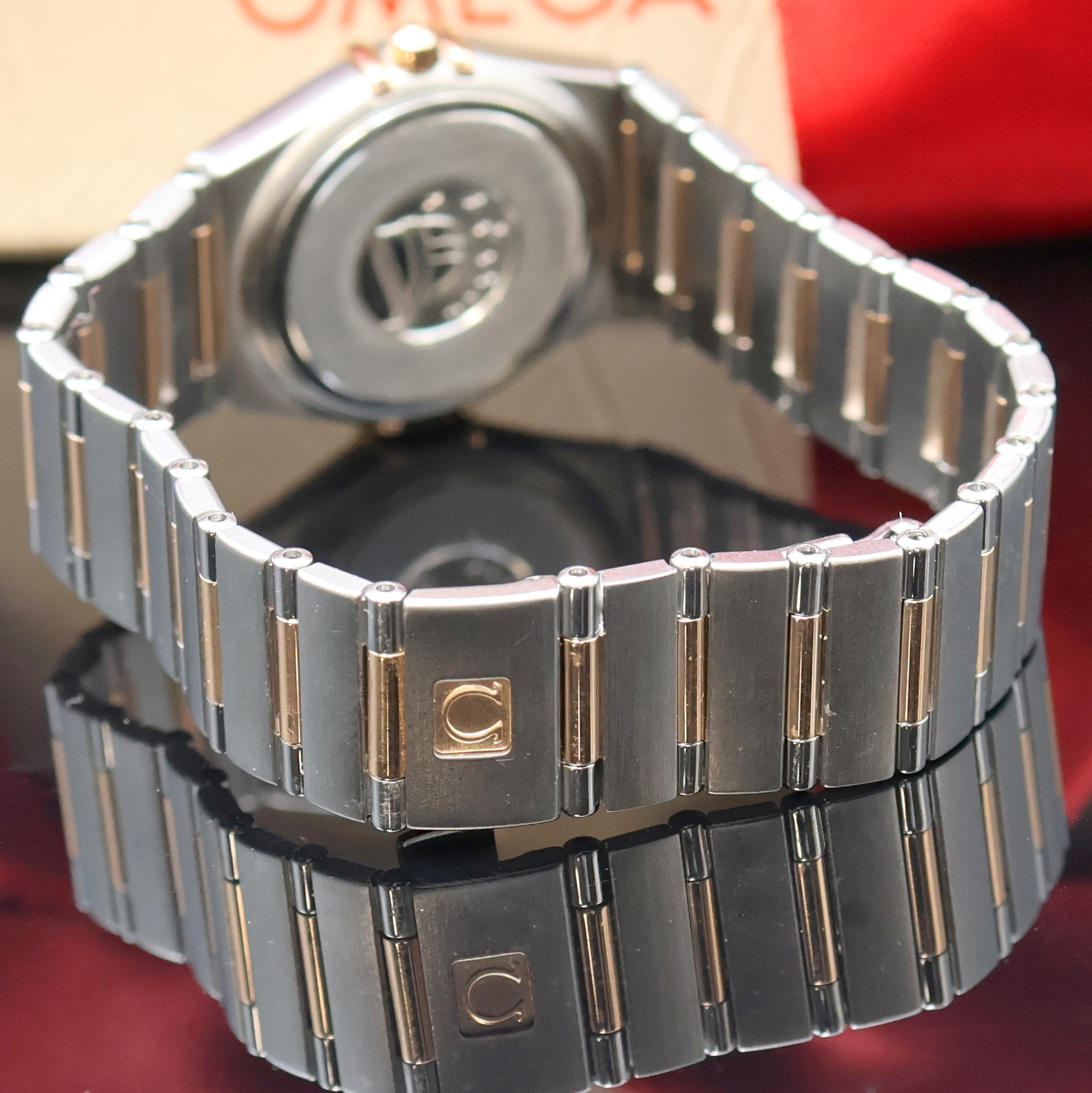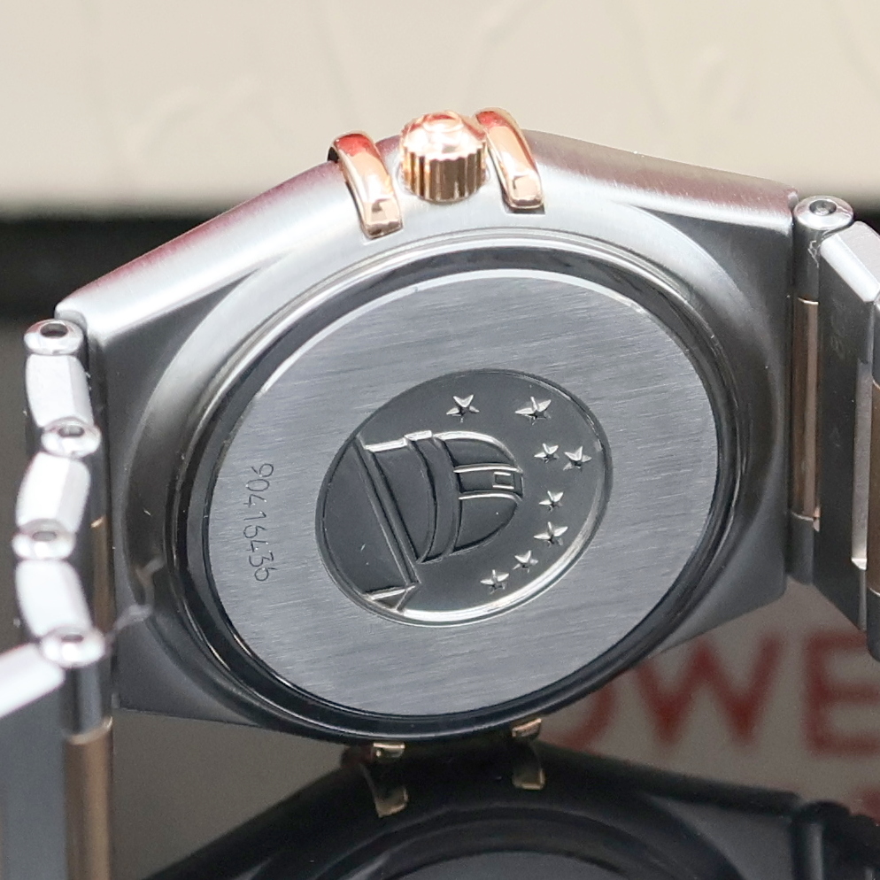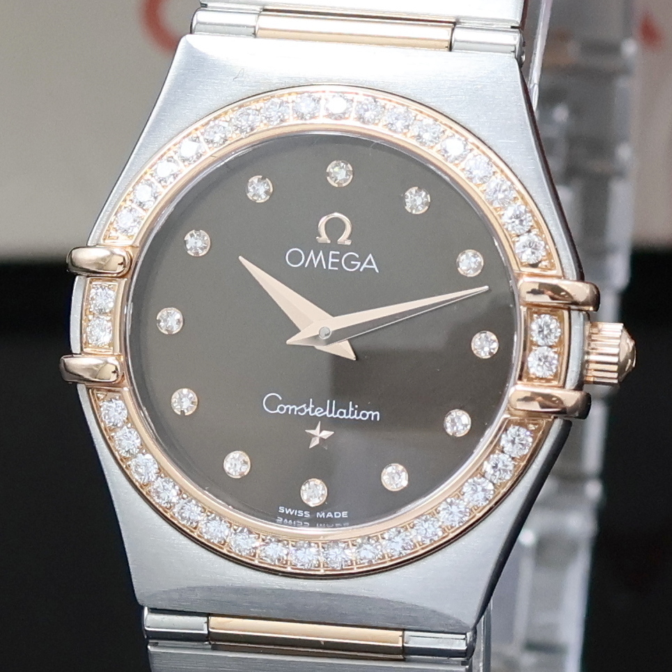 OMEGA nahezu neuwertige Damenarmbanduhr Constellation in Stahl/Rosegold Referenz 1358.60.00, quarz, Lünette wie braunes Zifferbl. m. Brillante bes., Boden aufgedr., Gliederband m. Faltschl., Anz. v. Std. & Min., D. ca. 26 mm, L. ca. 17,5 cm, EZ 1