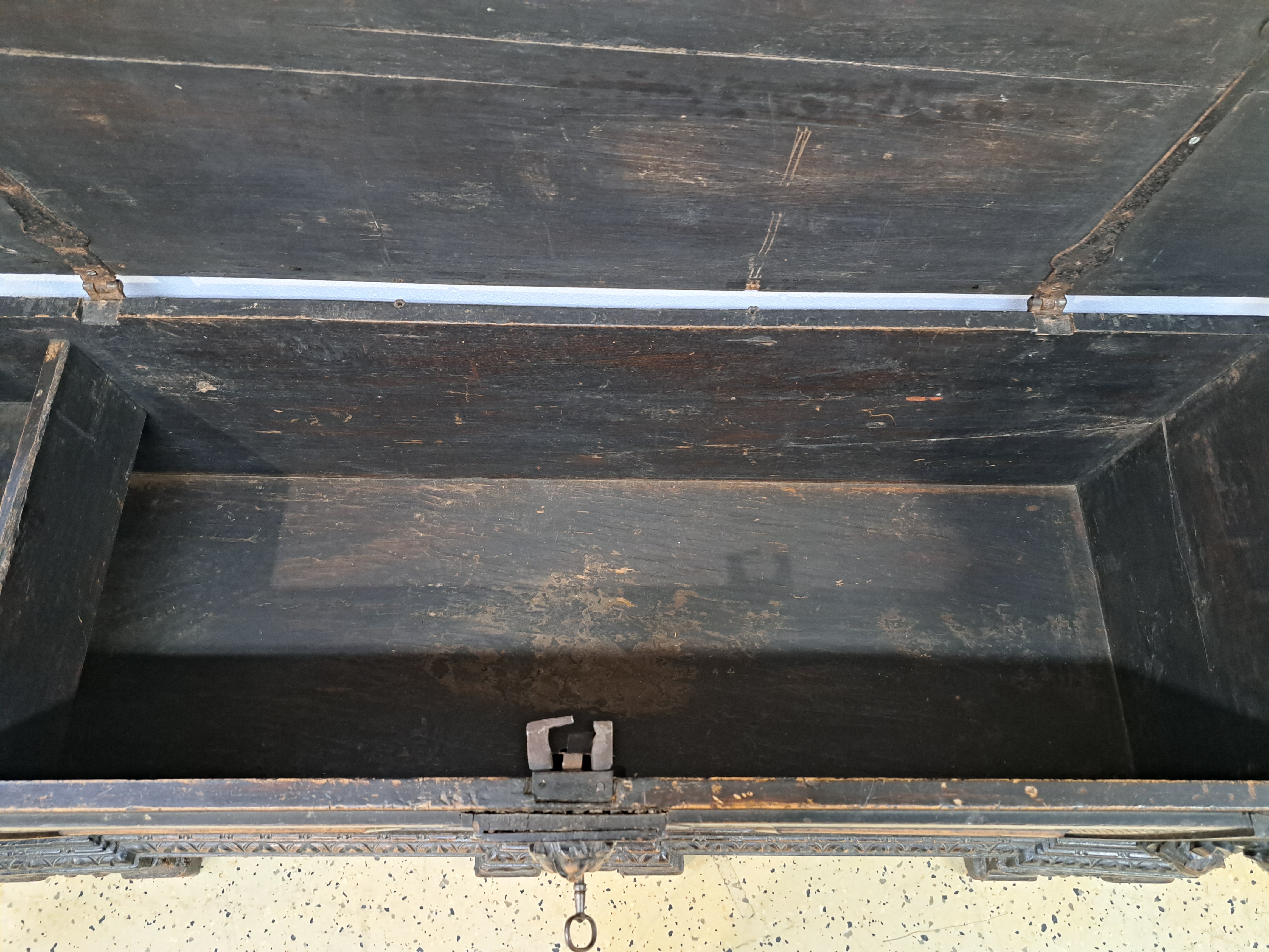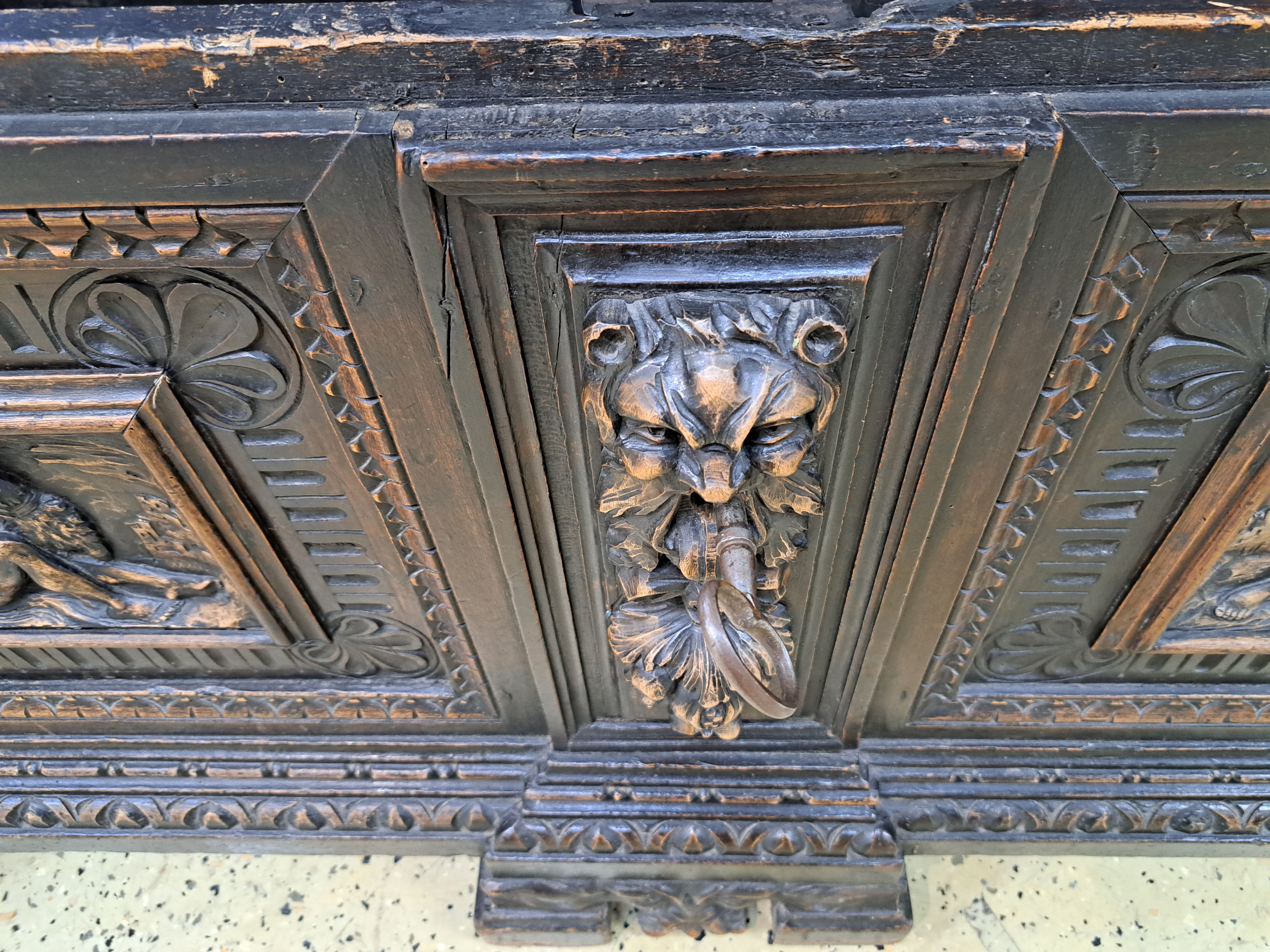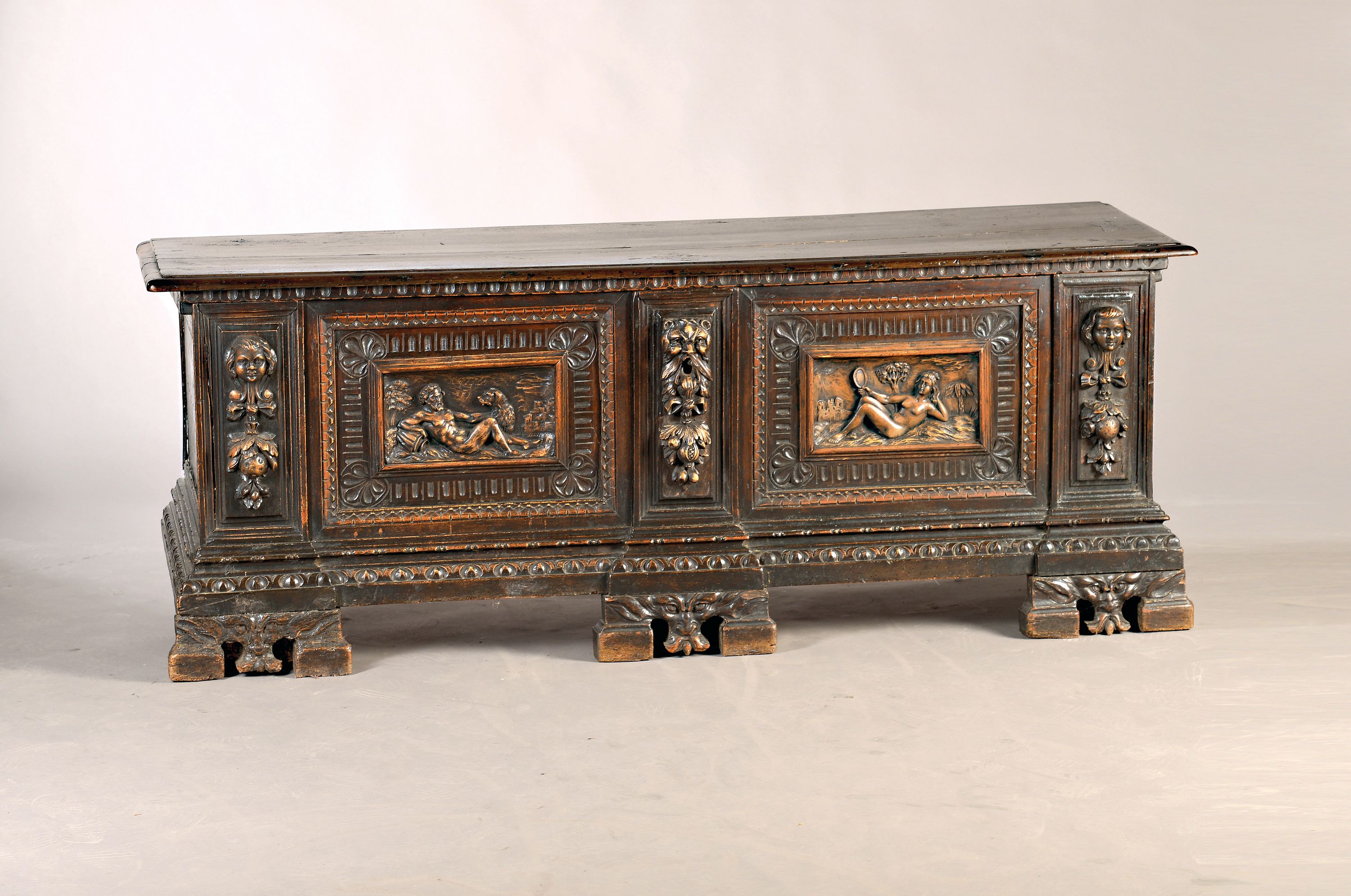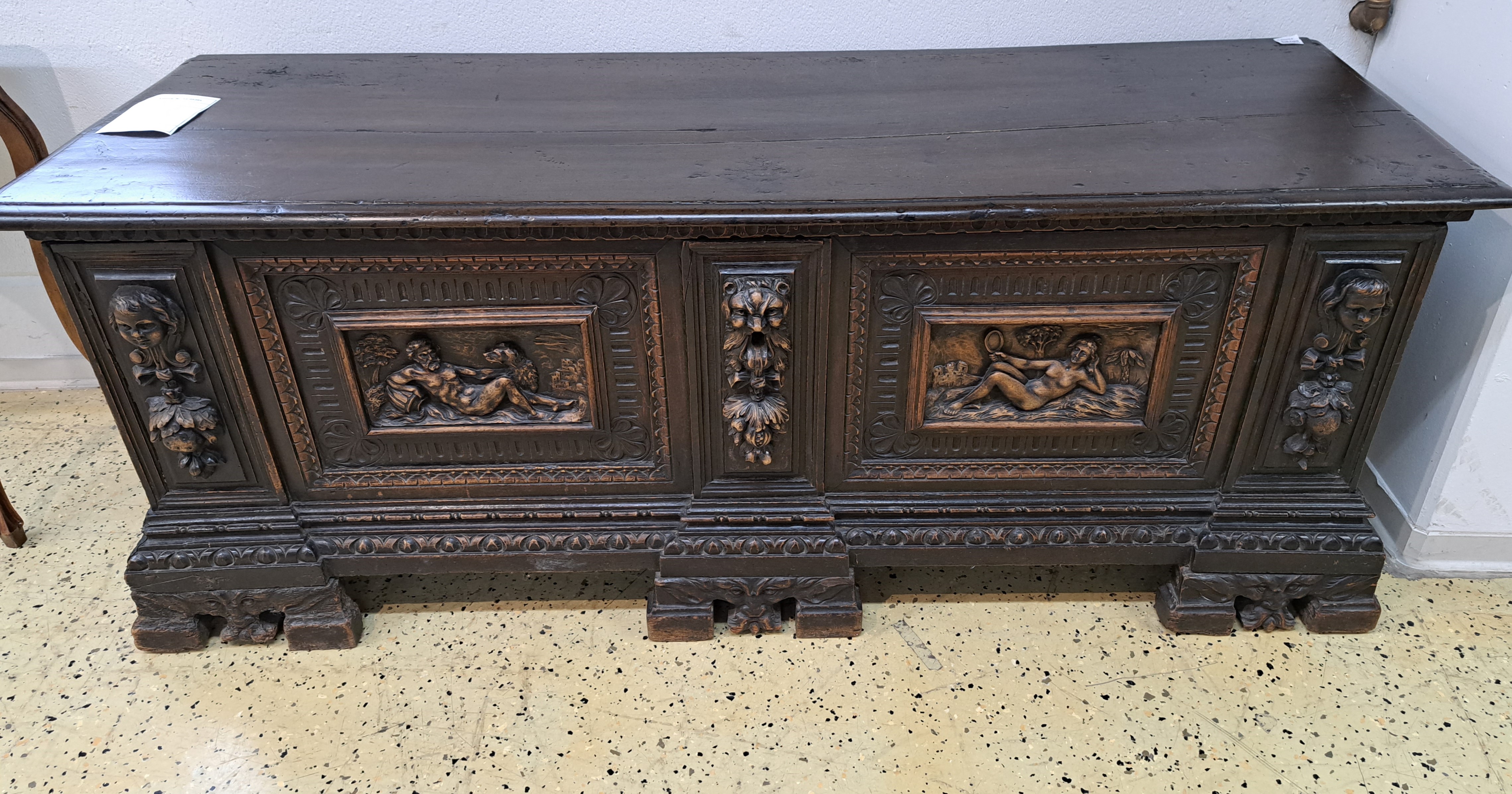 Eichentruhe, im Renaissancestil, 20. Jh., Nussbaum, reich verziert mit geschnitzten