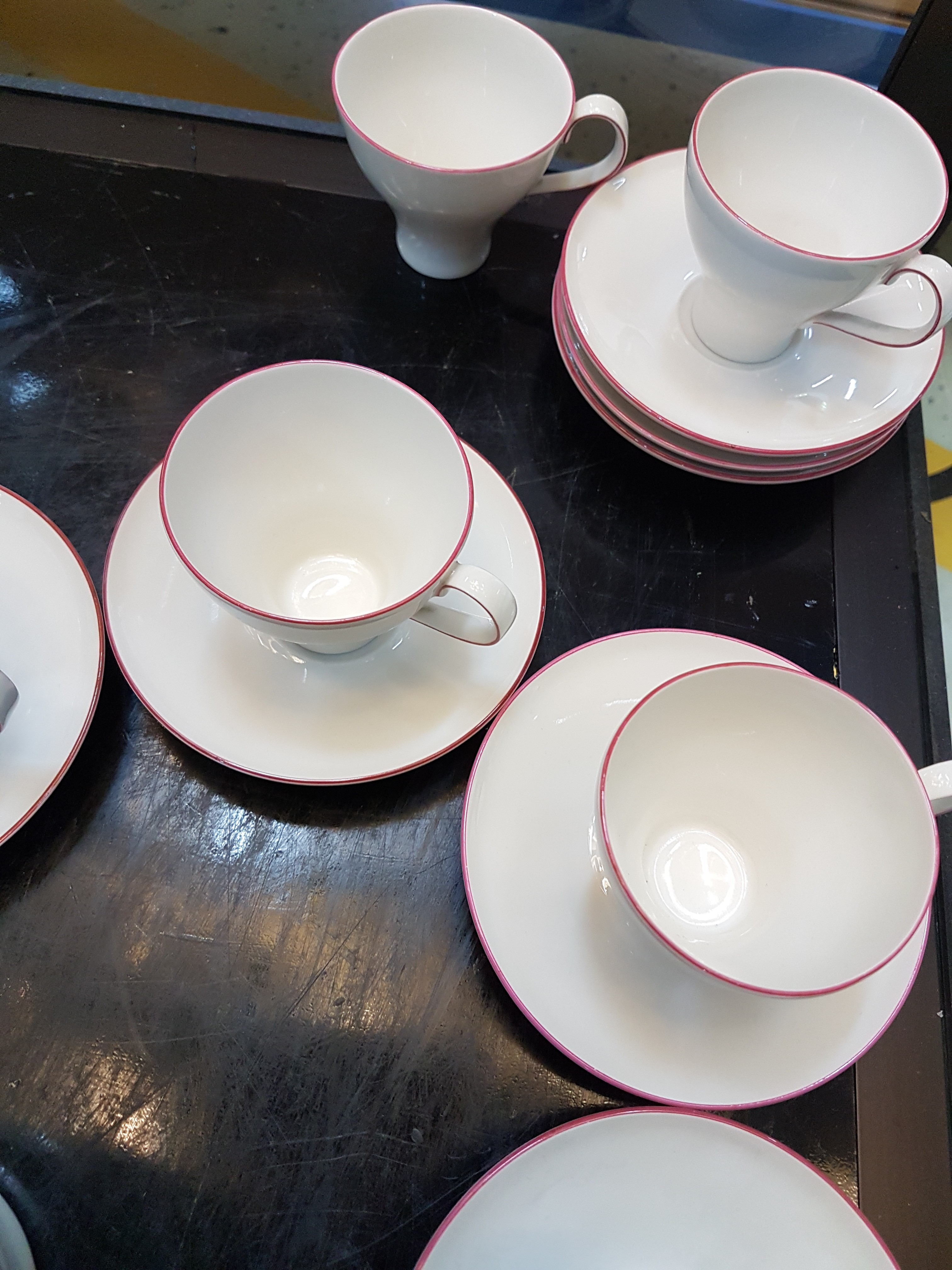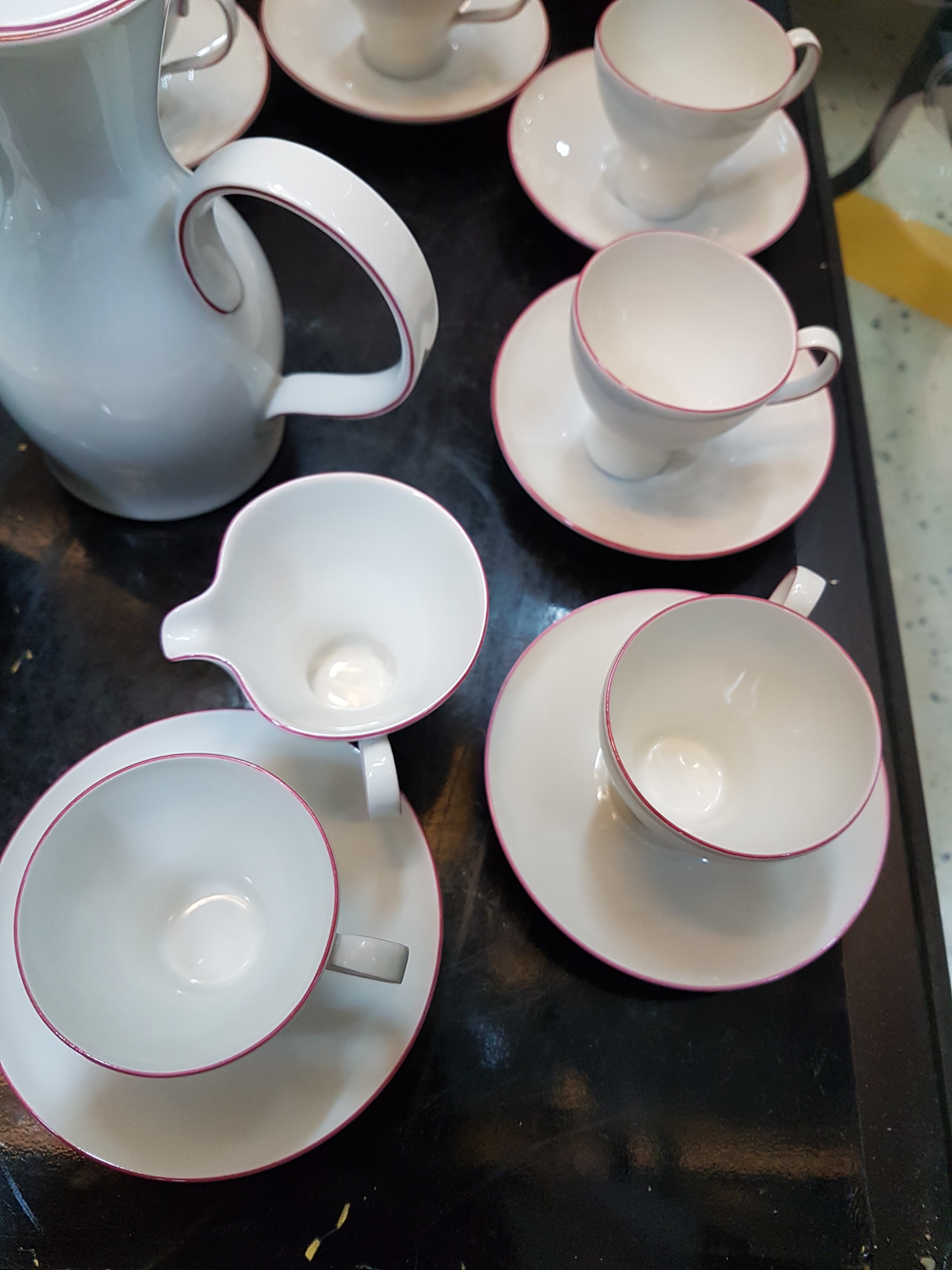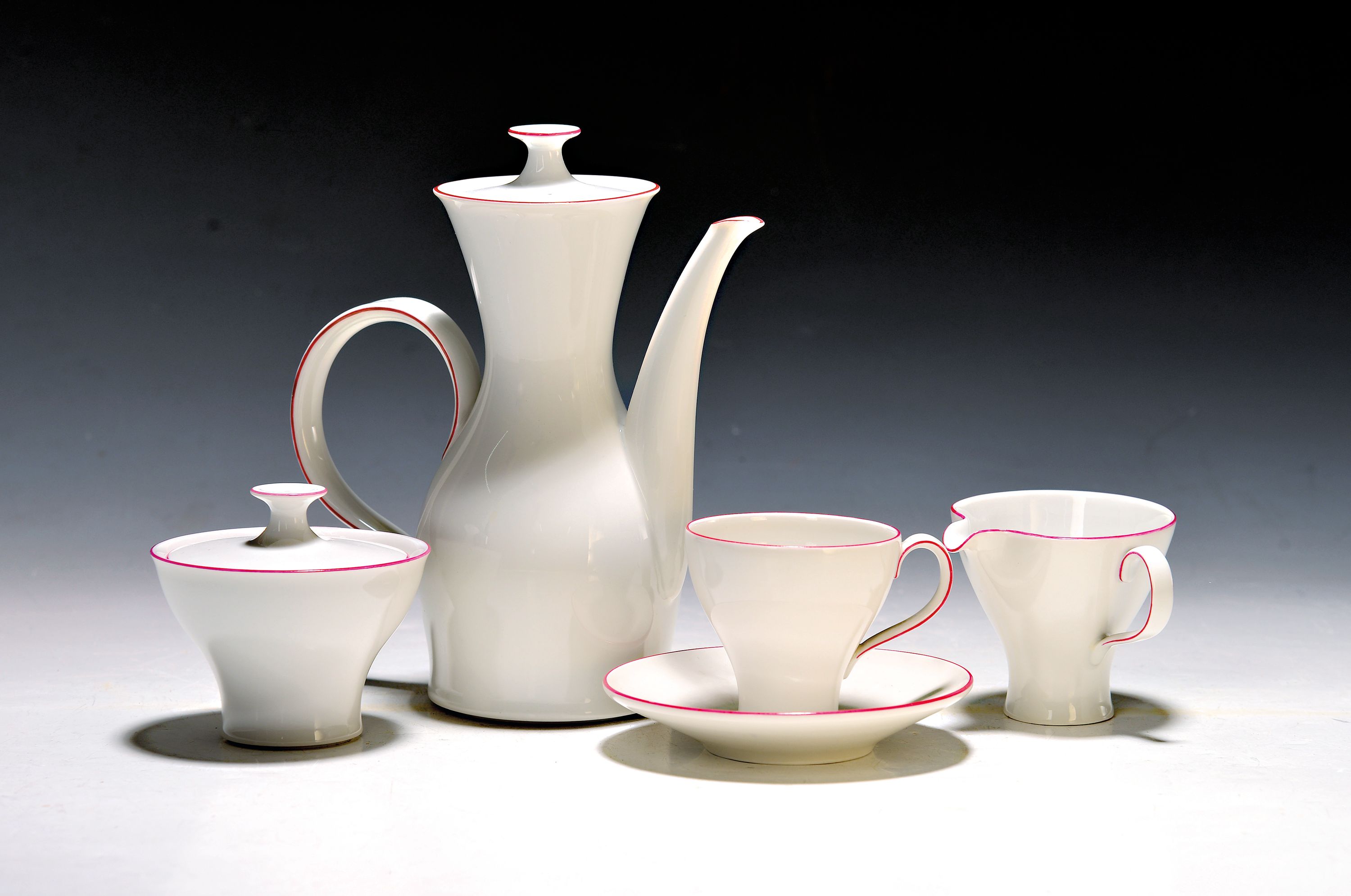 Sahnegießer, Porzellan, weiß, roter Randdekor
