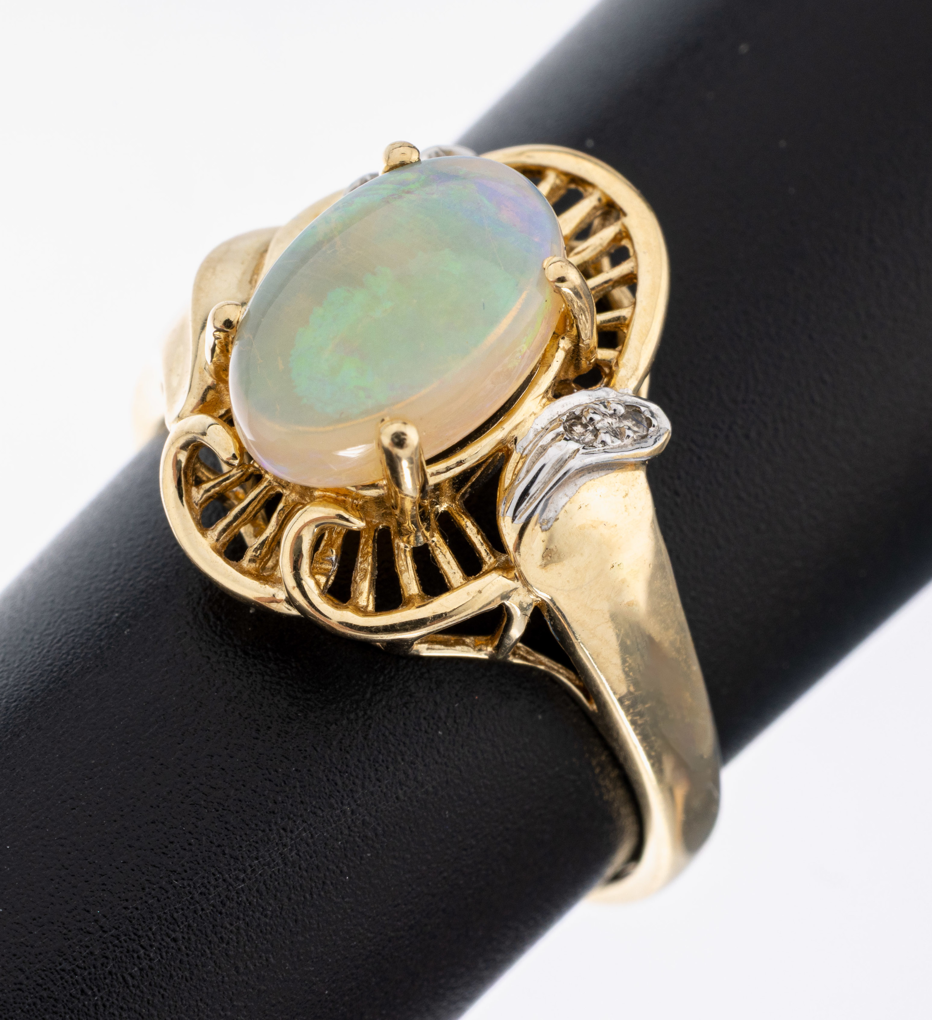 14 kt Gold Opal-Brillant-Ring, GG 585/000, Ringkopf part. durchbrochen gearbeitet,