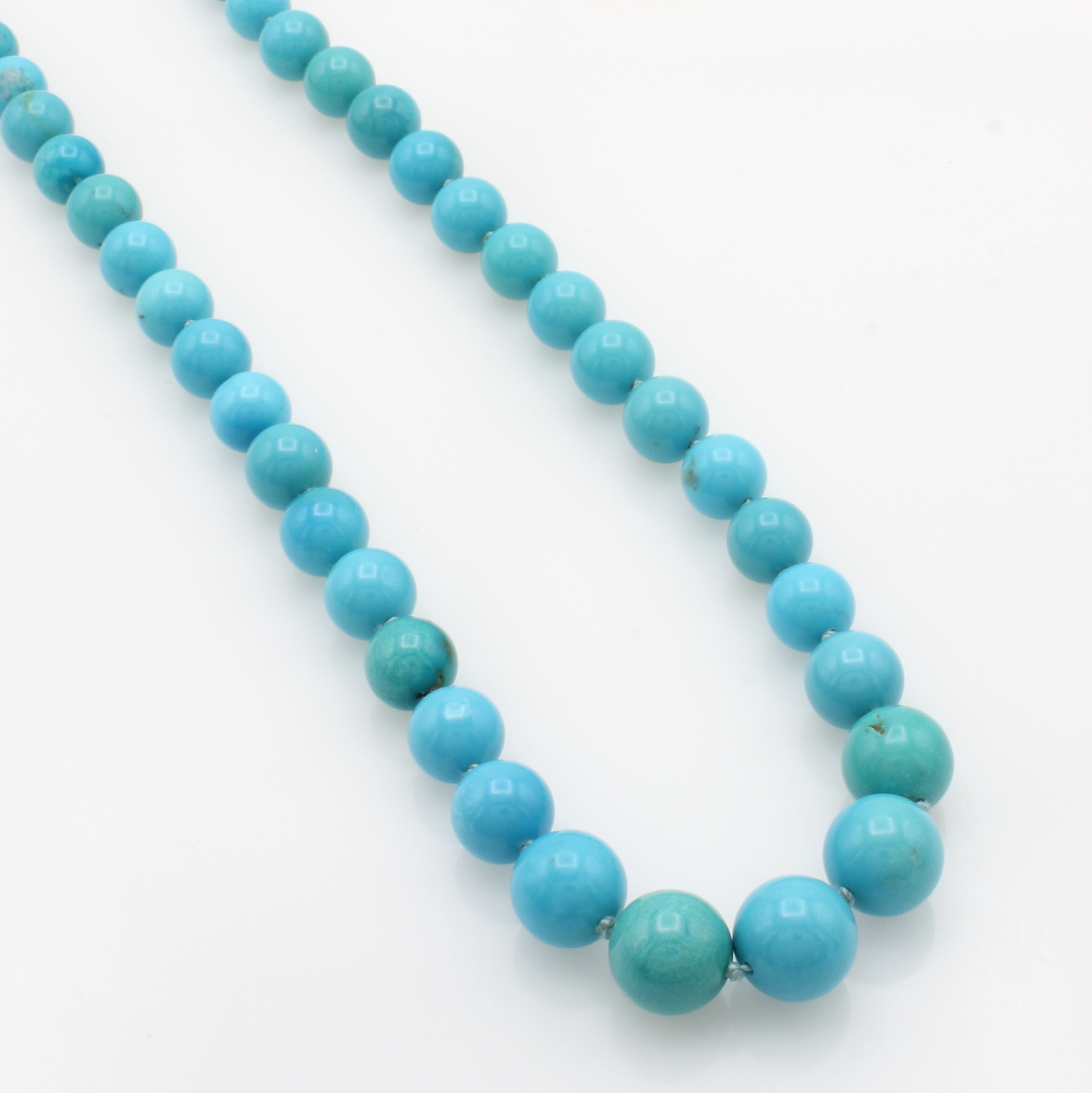 Amerikanische Türkiskette, Federringschl. verg., Türkiskugeln im Verlauf v. 7.5-11 mm, L. ca. 44 cm Schätzpreis: 1360, - EUR