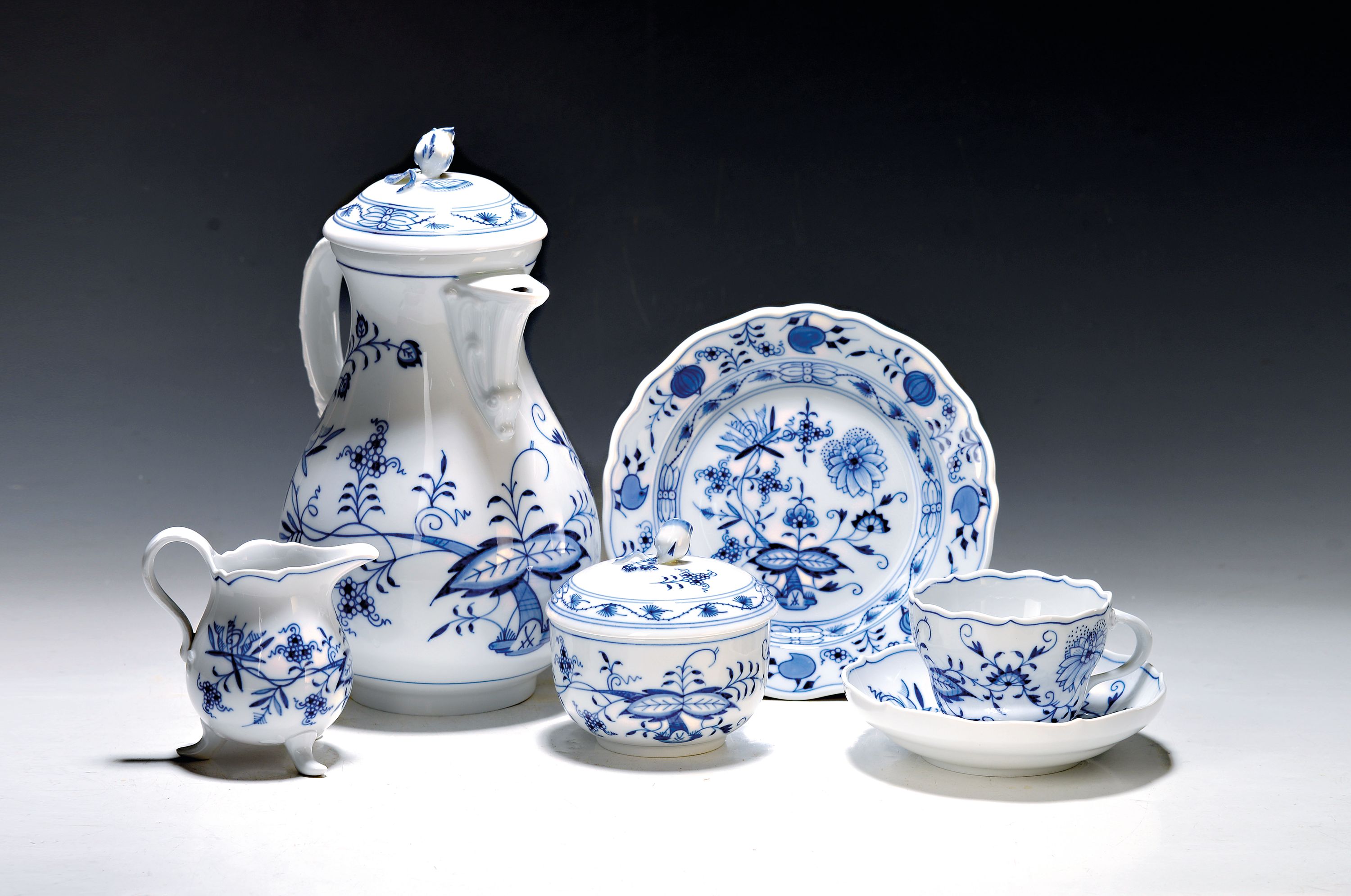 Kaffeeservice, Meissen, 20. Jh., für 6 Personen, Zwiebelmuster, Kaffeekanne, Zuckerdose,