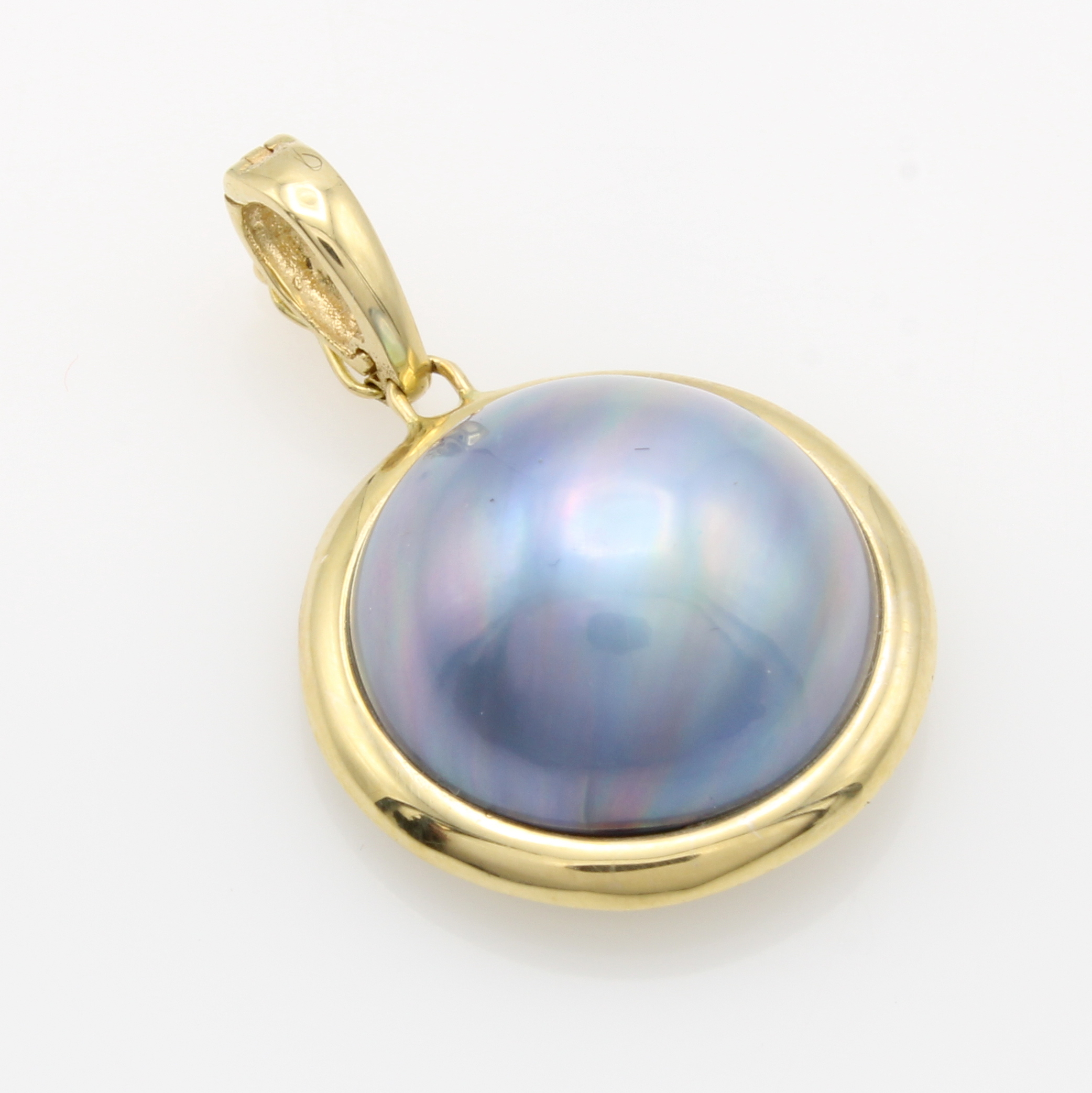 Clipanhänger mit Mabeperle, GG 585/000, graue Mabeperle in glatter Fassung ca. 15 mm Schätzpreis: 490, - EUR