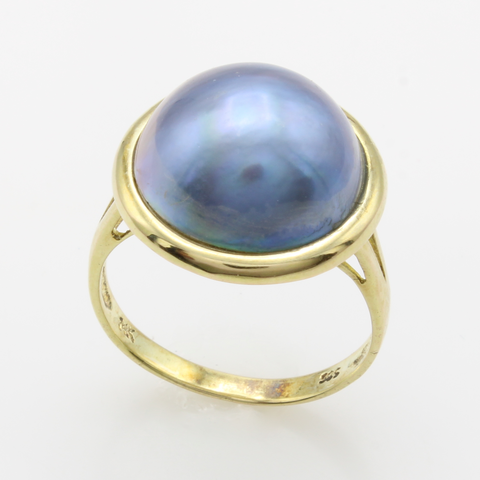 Ring mit Mabeperle, GG 585/000, graue Mabeperle in glatter Fassung ca. 14 mm, RW ca. 56 Schätzpreis: 890, - EUR
