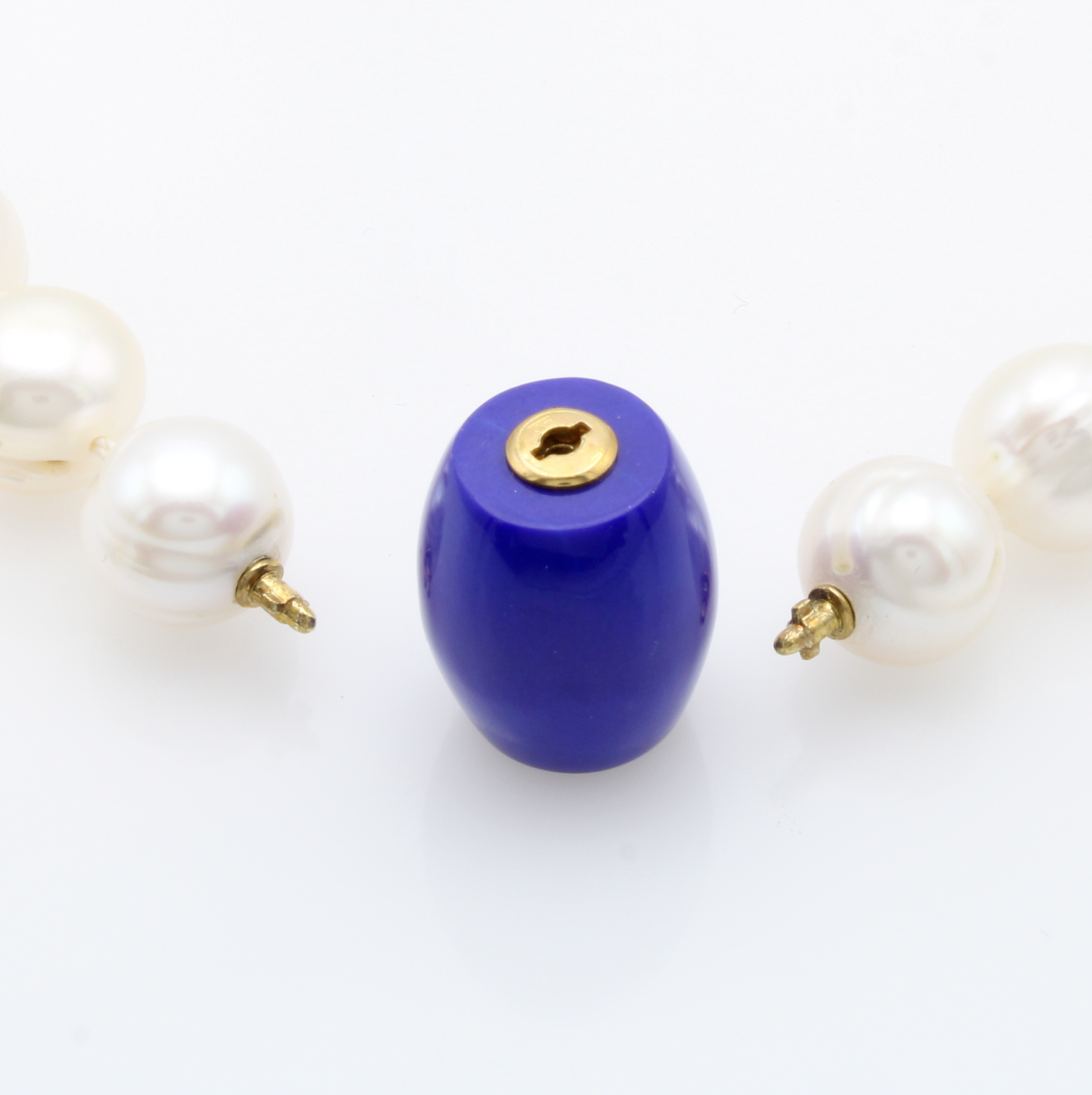 Süßwasserzuchtperlenkette mit Lapislazuli- wechselschließe, GG 585/000, unrunde, weiße Perlen ca. 10-11 mm, tonnenförm. Lapislazuli, L. ca. 48 cm Schätzpreis: 1300, - EUR
