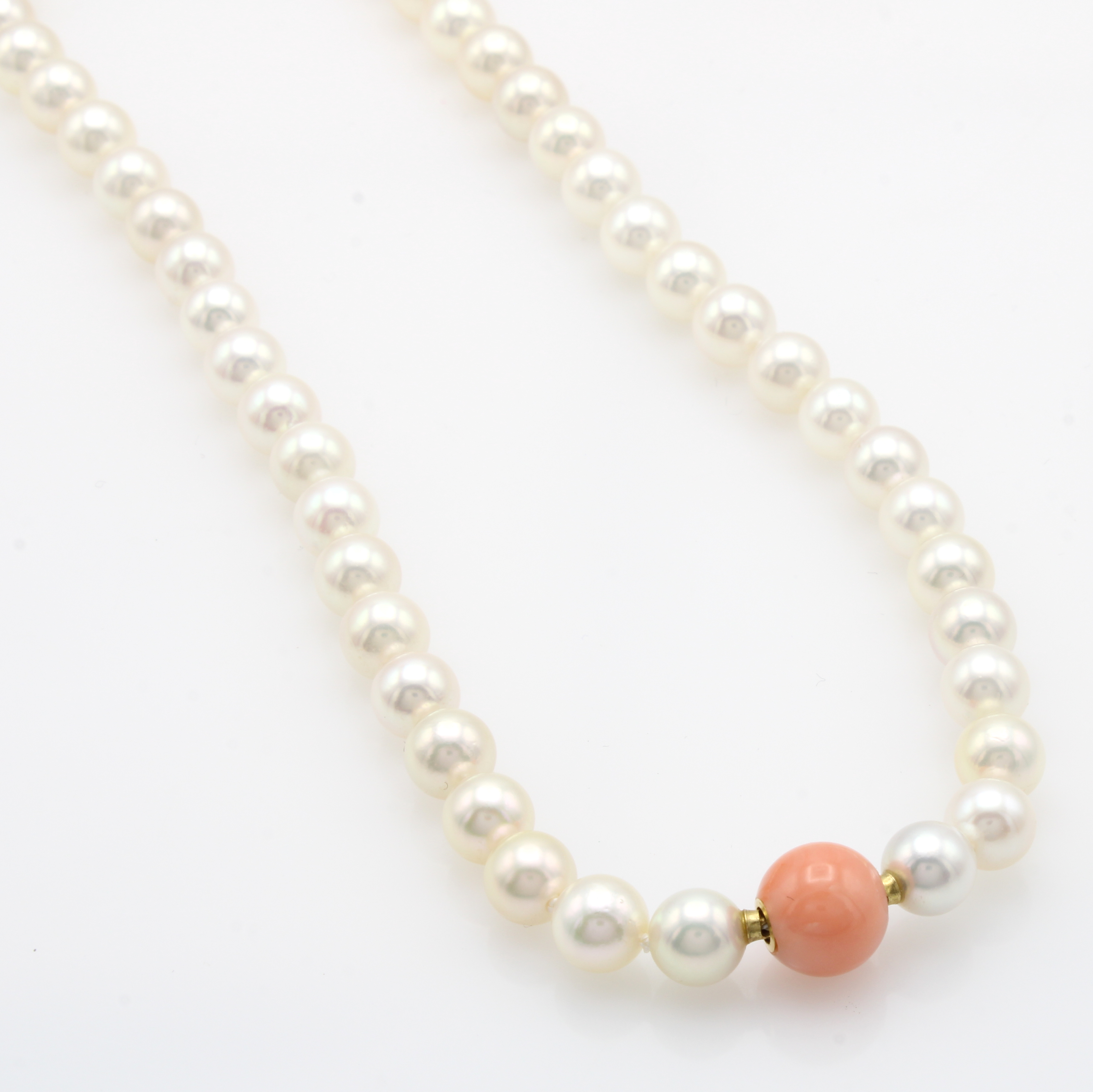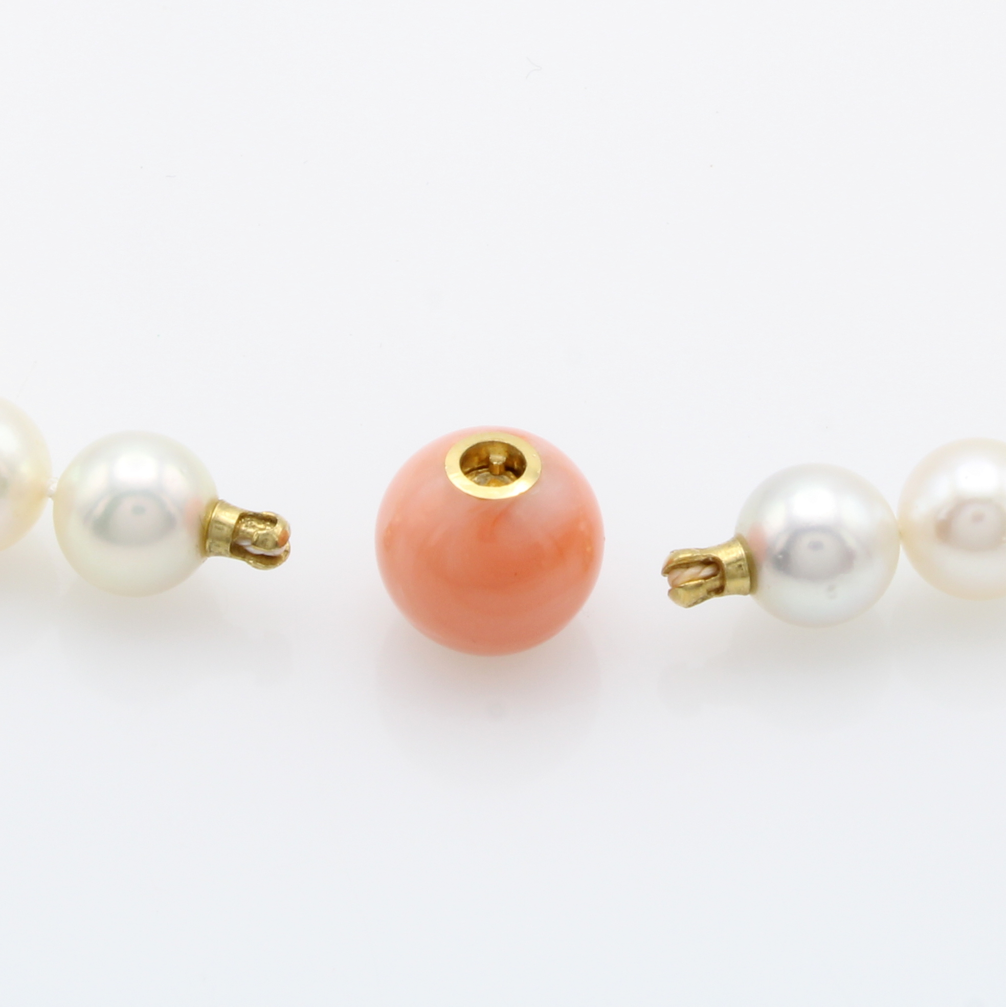 Japanische Zuchtperlenkette mit Korallwechsel-schließe (Fa. Jörg Heinz), GG 585/000, l. cremef. Perlen ca. 7-7.5 mm. Korallkugel ca. 10 mm, L. ca. 38 cm, Versand nur innerh. der EU Schätzpreis: 1880, - EUR