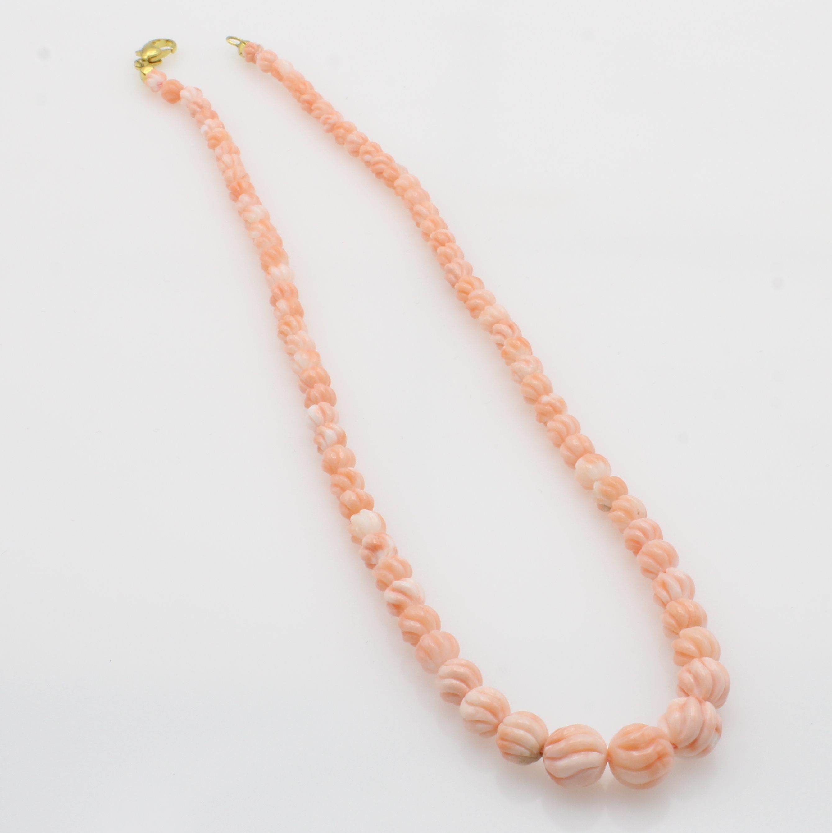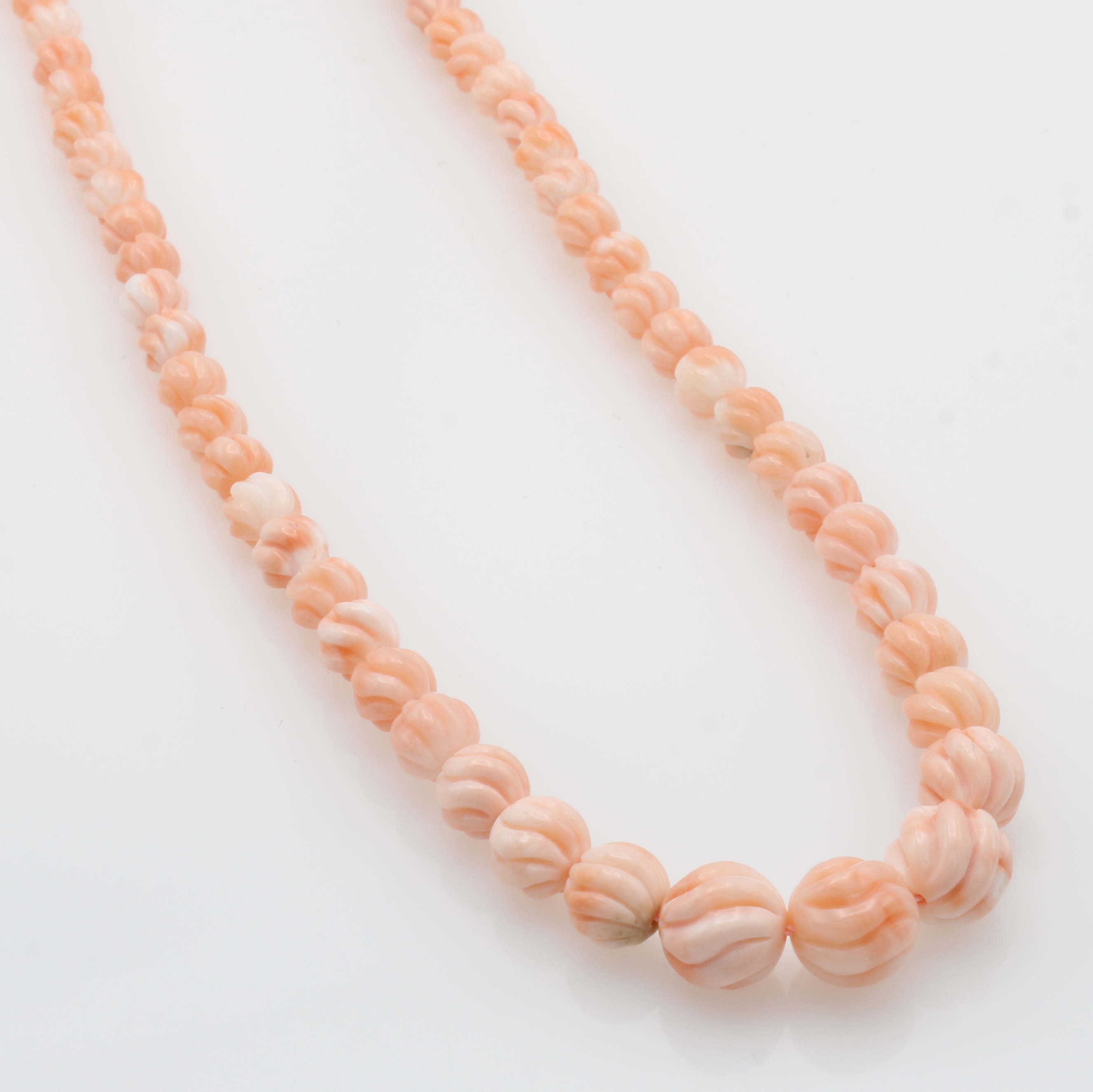 Korallenkette, Karabinerschl. verg., geriefte Korallkugeln im Verlauf v. 5-10 mm, Momo-rosa, Versand nur innerhalb der EU, L. ca. 48 cm Schätzpreis: 1780, - EUR