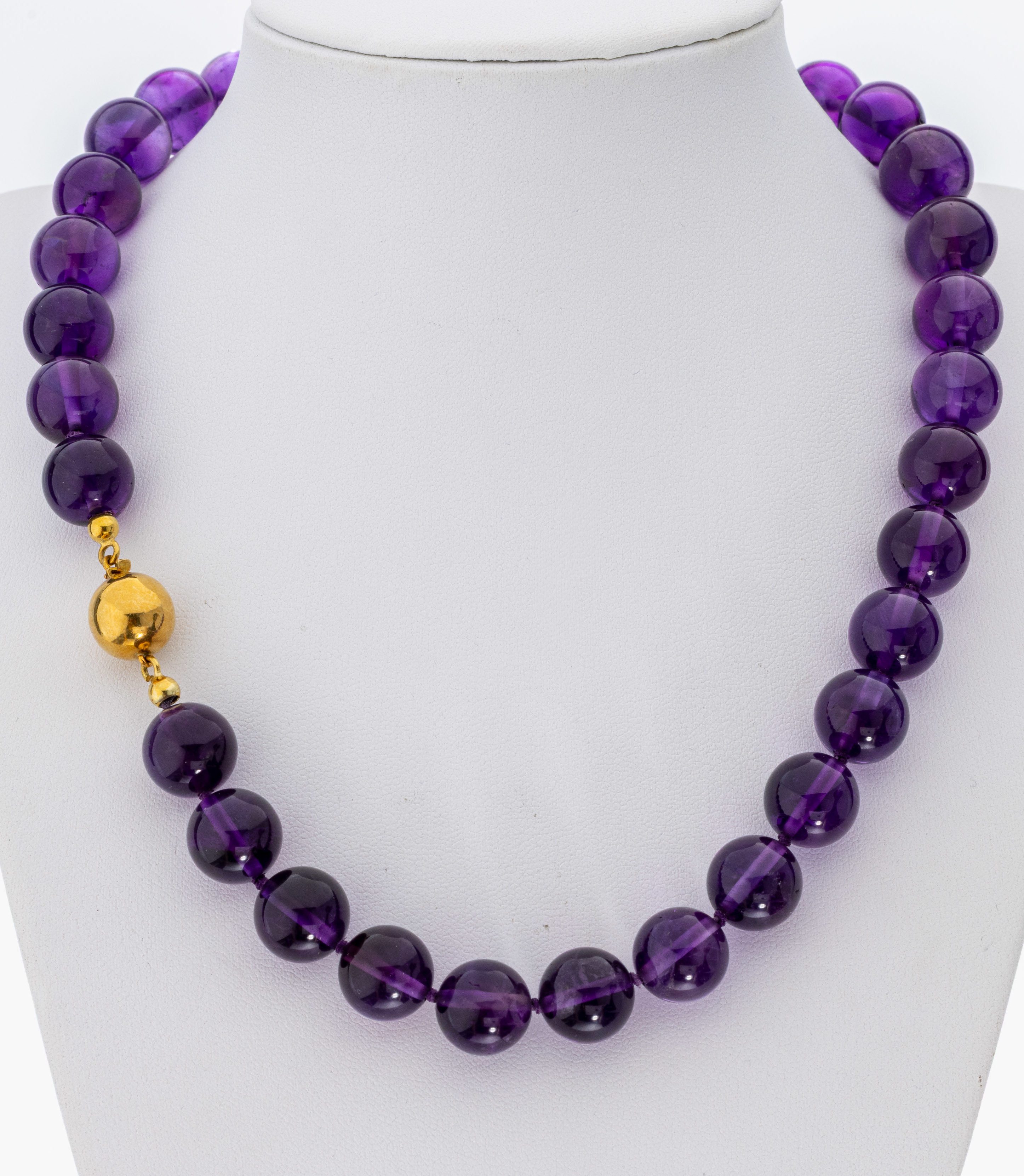 Amethyst-Collier mit 18 kt Gold Schließe, GG 750/000, 33 Amethyst-Kugeln, D. ca.