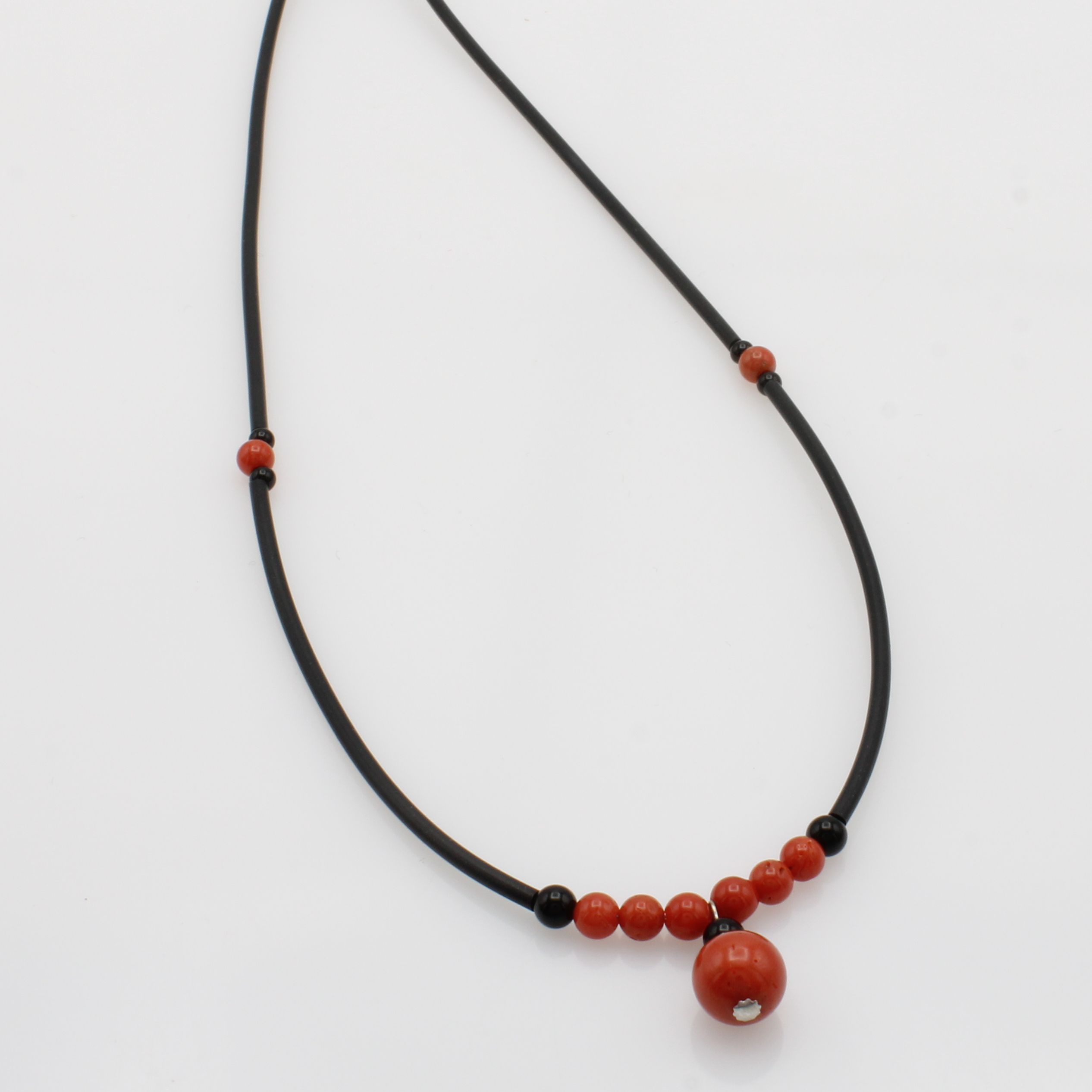 Kautschukkette mit Onyxen und Korallen, Karabinerschl. vers., Korallkugeln ca. 4.5 u. 9.5 mm, Onyxkugeln ca. 3 u. 4 mm, L. ca. 48 cm Schätzpreis: 600, - EUR