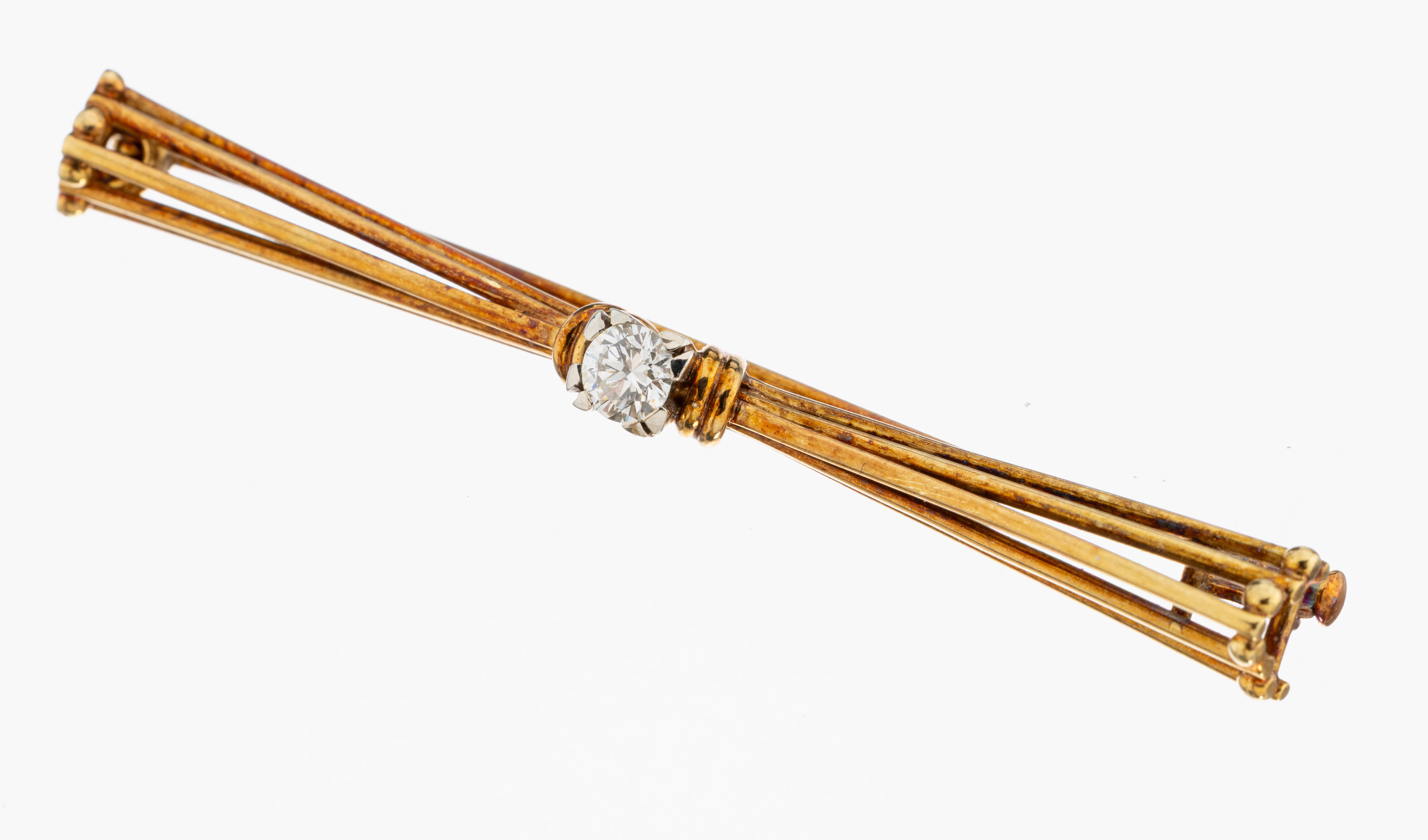 14 kt Gold Brillant-Brosche, GG 585/000, Brillant ca. 0.25 ct Weiß/si, L. ca. 6 cm, ca.5.3 g