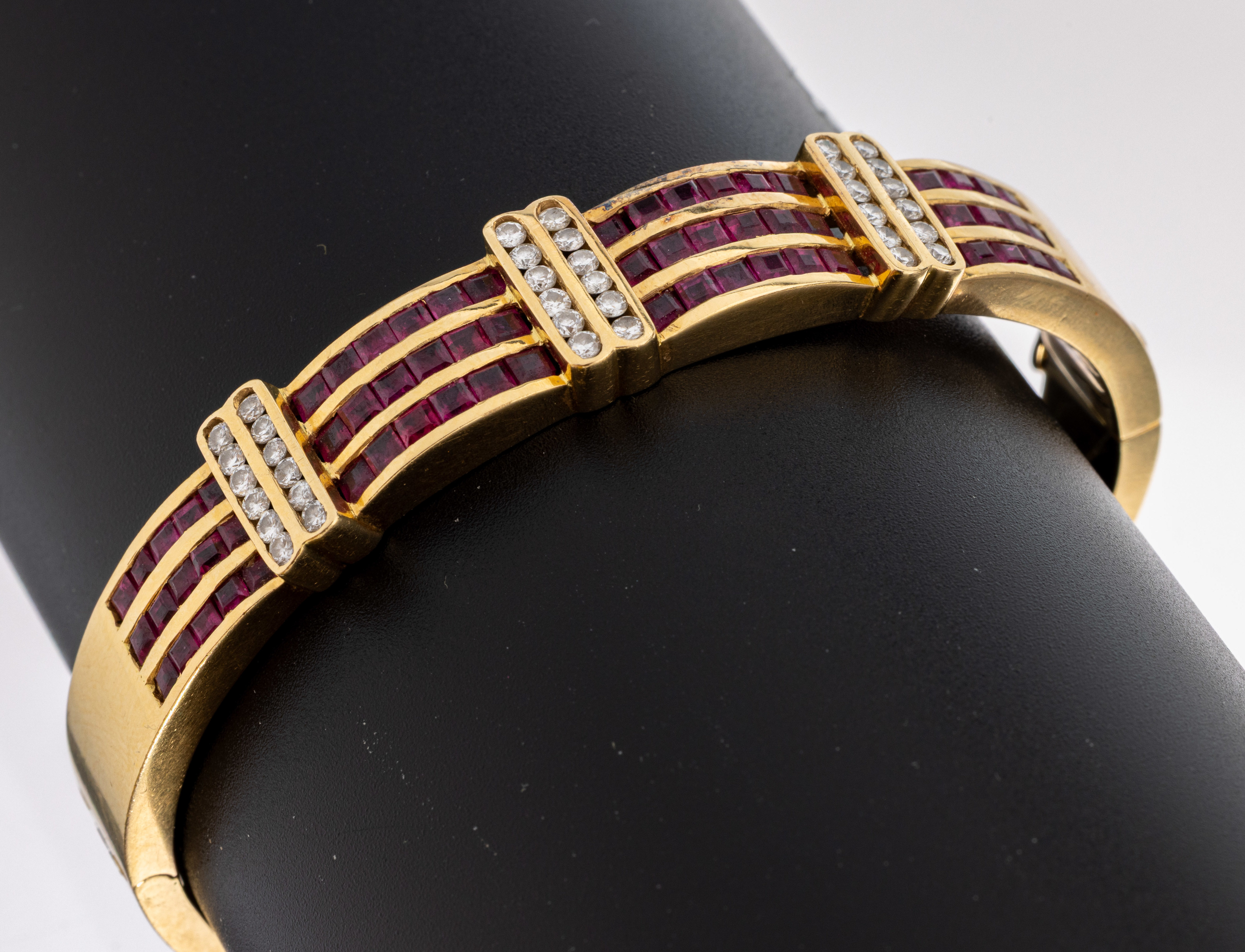 18 kt Gold Rubin-Brillant-Armreif, GG 750/ 000 gefüllt, 66 Rubin-Carrees zus. ca.