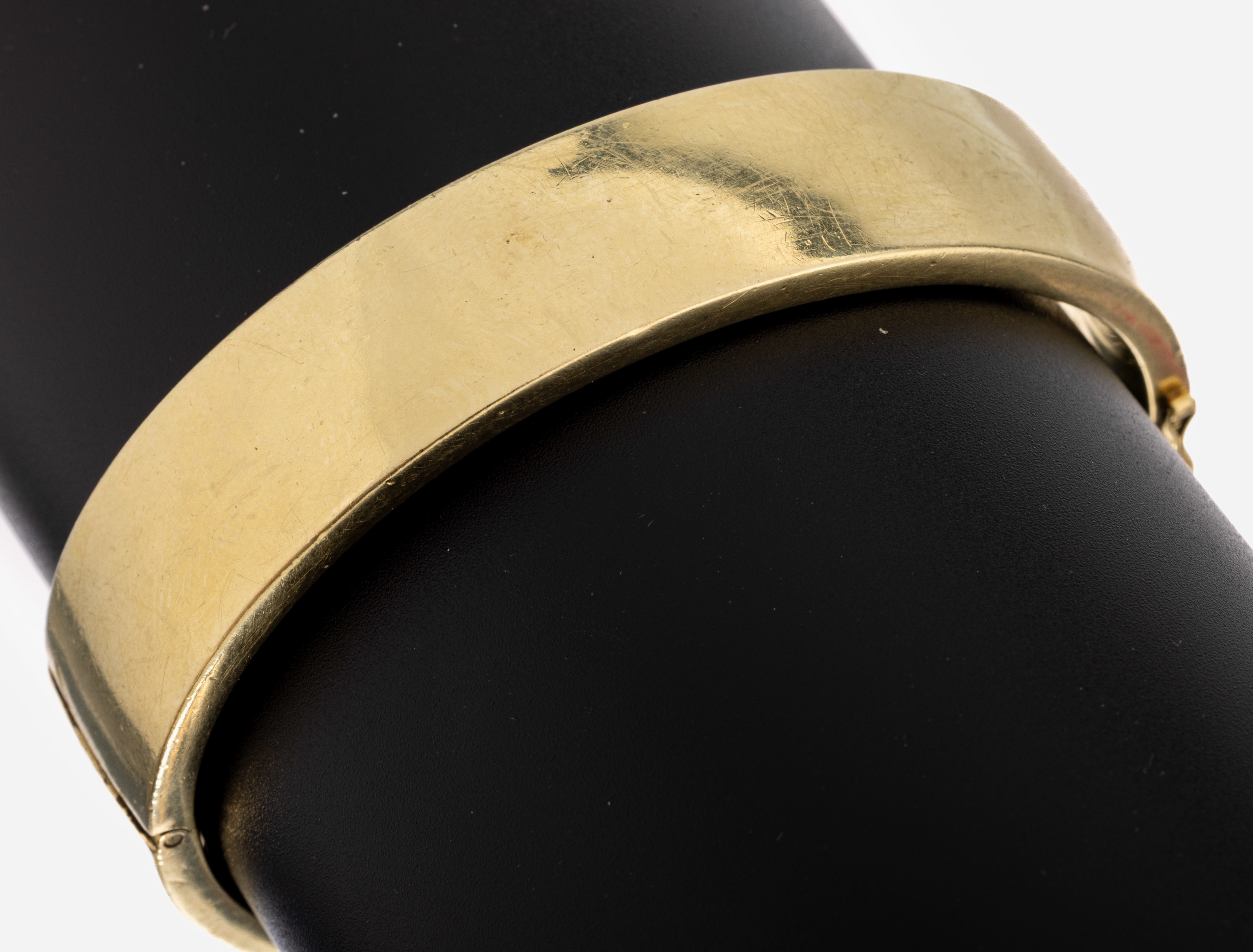 14 kt Gold Armreif, GG 585/000 gepr., gefüllt, D. ca. 6.5 x 5.5 cm, B. ca. 1.5 cm,