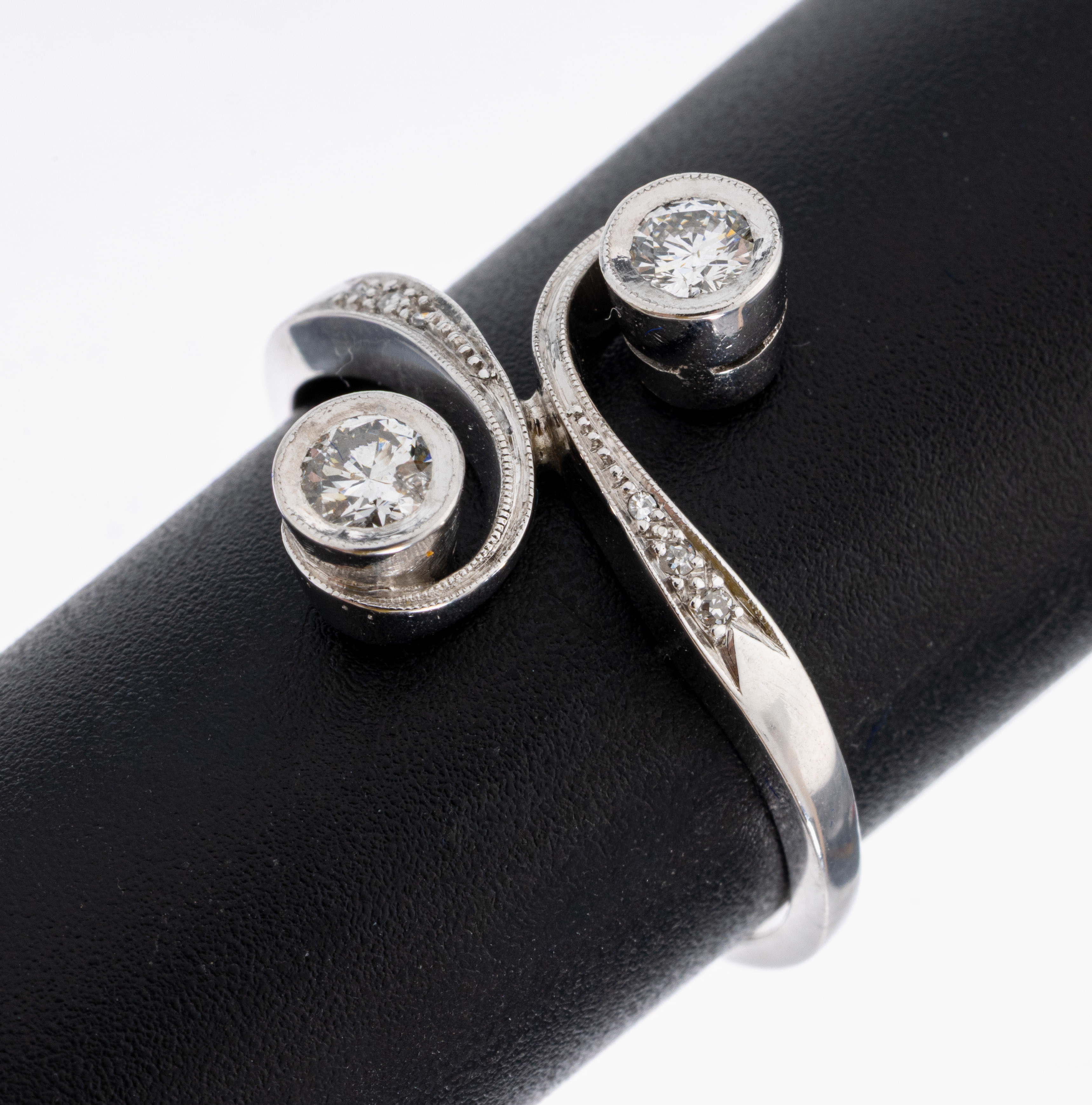 Platin Diamant-Ring, 1930er Jahre, 2 Brillanten und 6 kl. Besatz-Diamanten zus. ca.