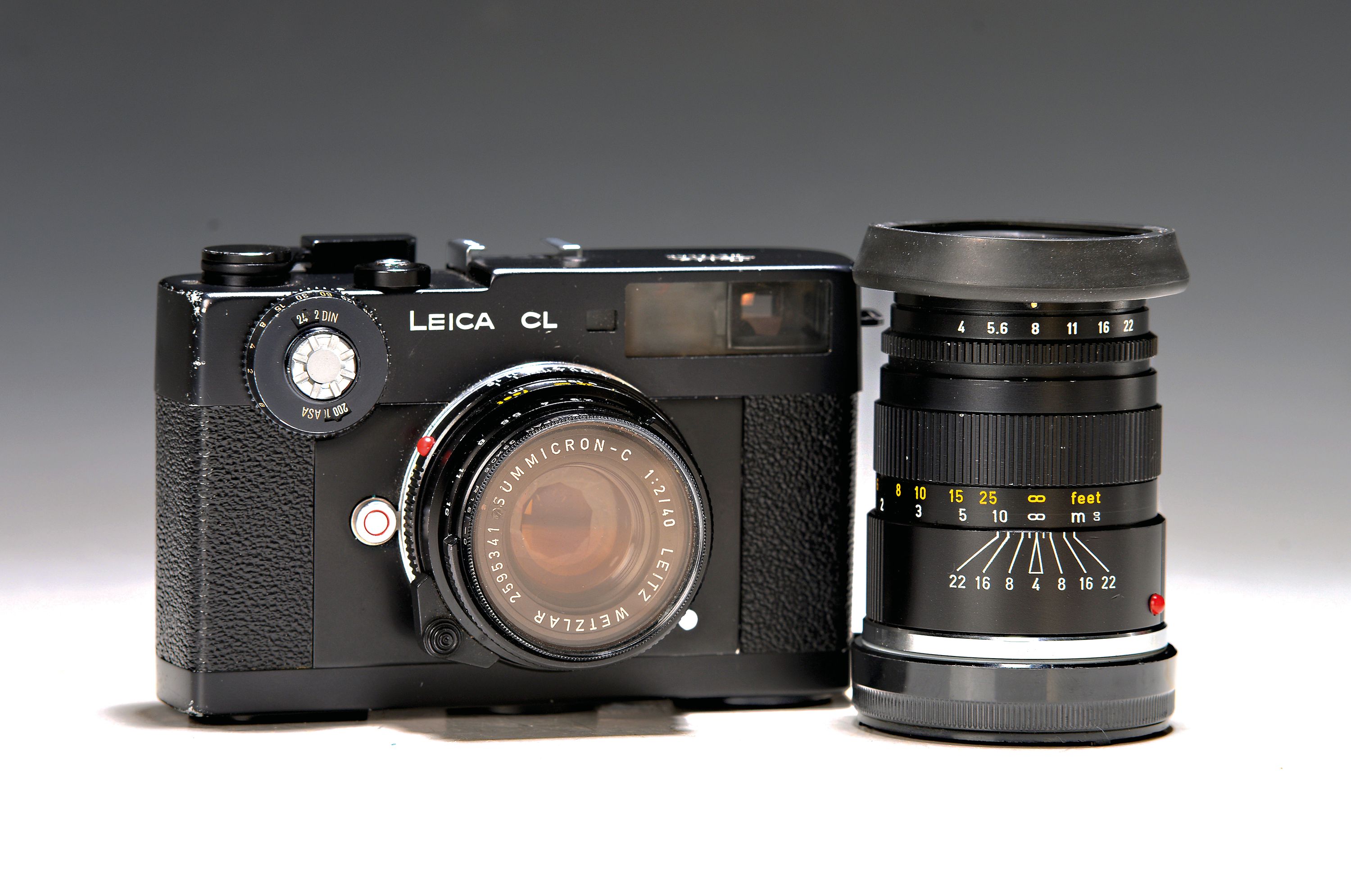 Leica CL Nr. 1329190, Bj. 1974, mit Summicron-C 1:2/40mm und Elmar-C 1:4/90mm; deutliche