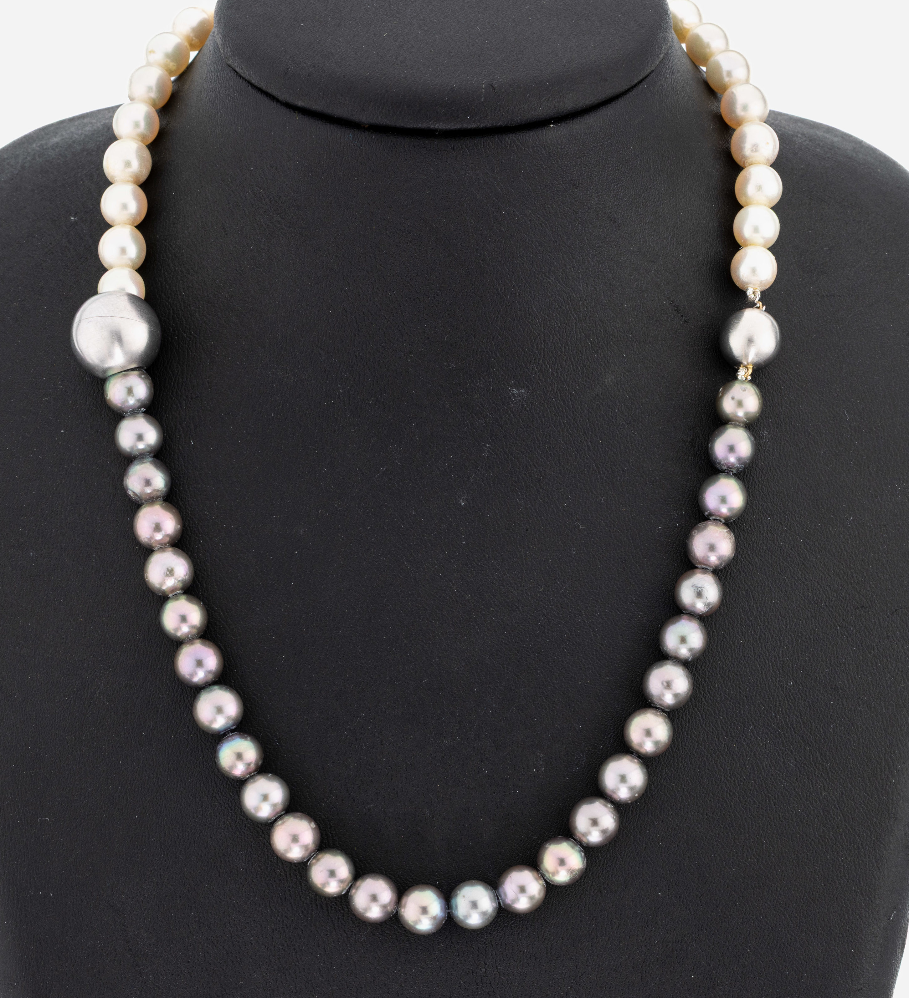 Platin Perl-Brillant-Collier, weiße und graue Zuchtperlen, D. ca. 7 mm, Platinkugel