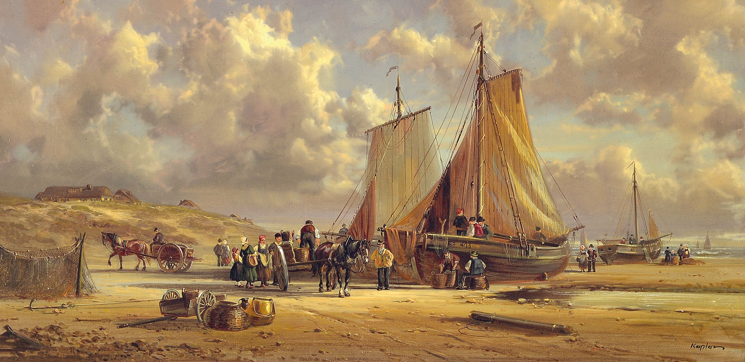 Hubert Kaplan, 1940 München-2024 Egling, Heimkehrende Fischer, am Strand liegende