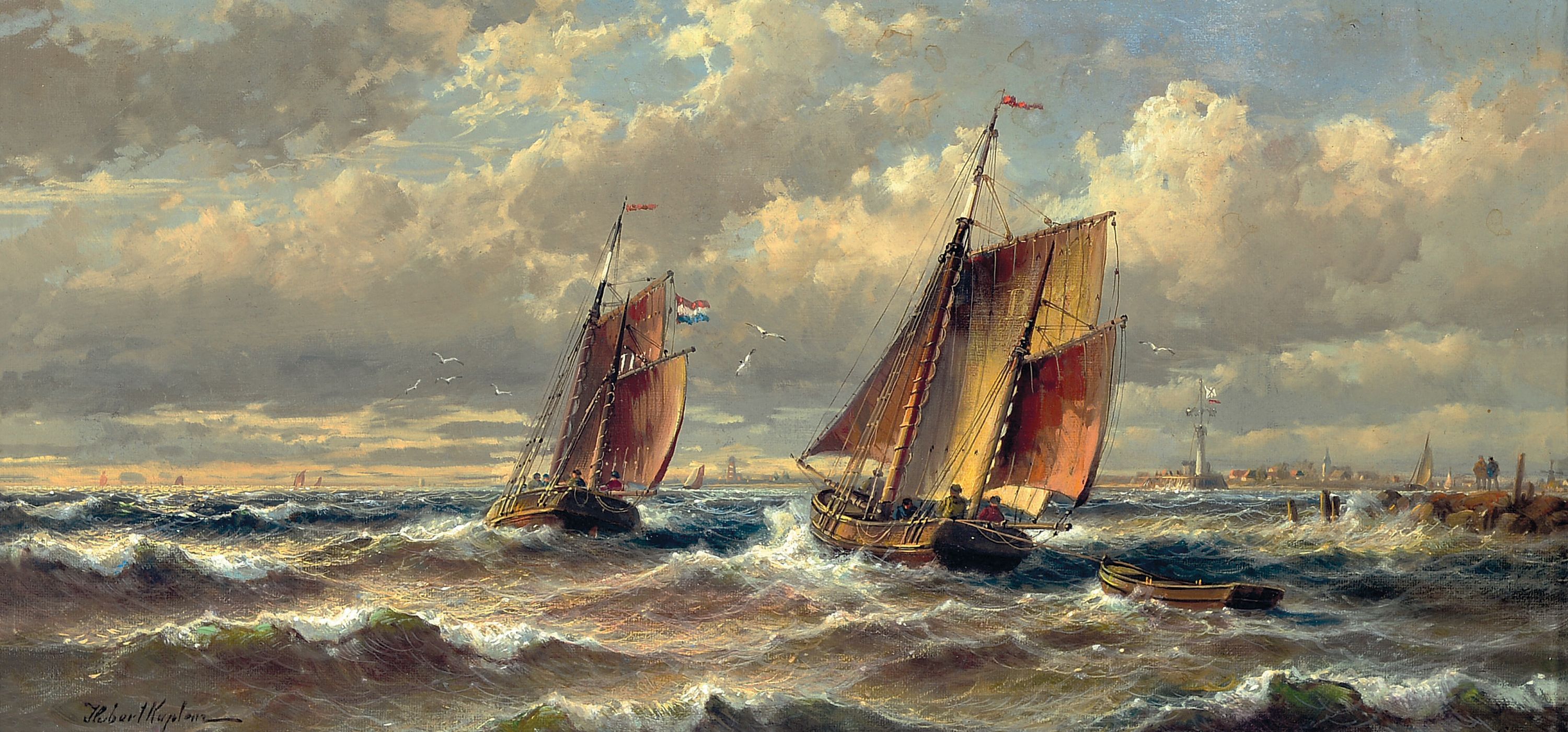 Originalbrief bezeichnet, zwei niederländische Kutter vor Hafensilhouette, bewegte
