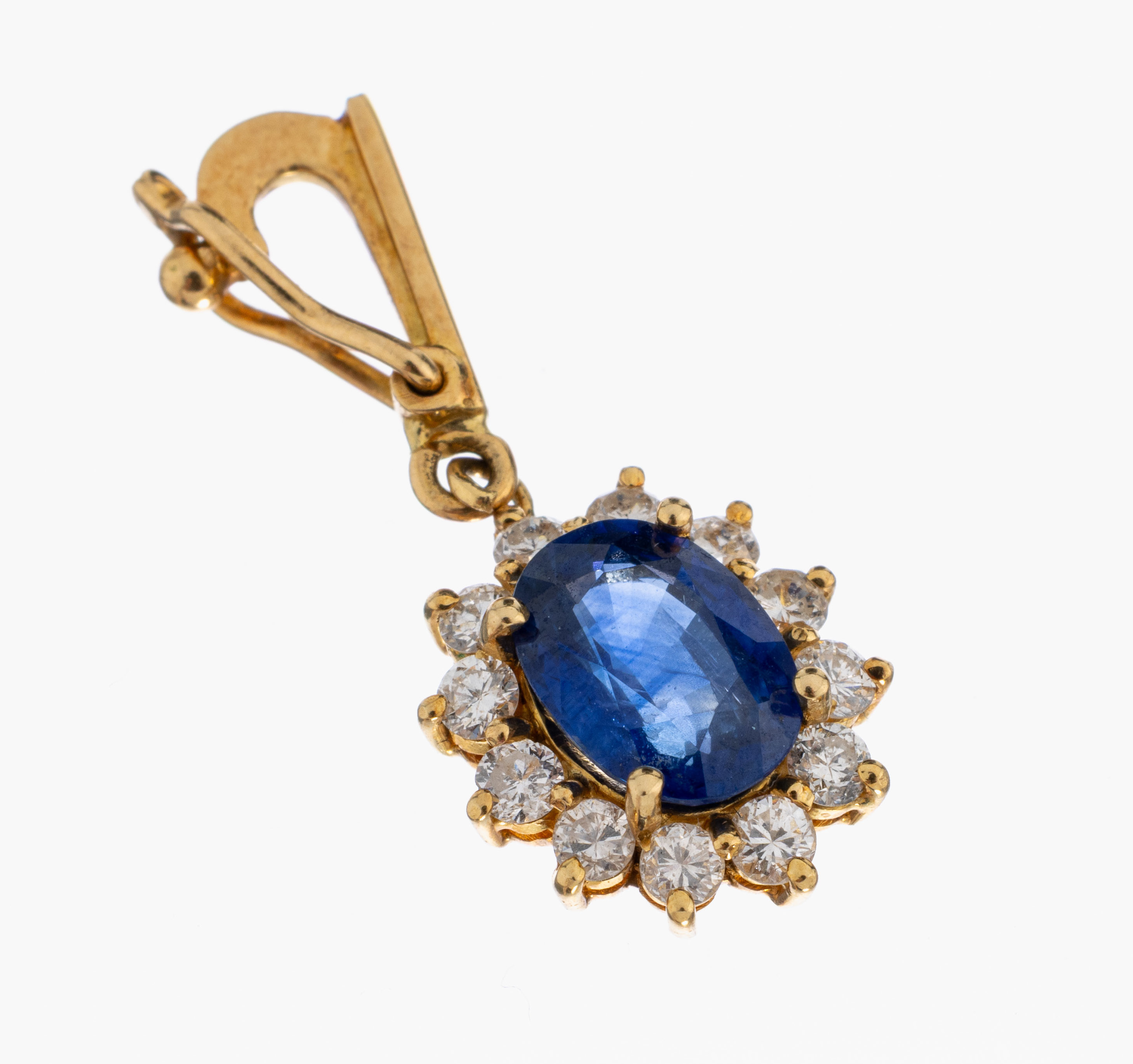 18 kt Gold Saphir-Brillant-Clipanhänger, GG 750/000, mittig ovalfacett. Saphir ca. 1.0 ct, umgeben von Brillanten zus. ca. 0.35 ct feines Weiß-Weiß/vvs-si, ca. 2.2 g
