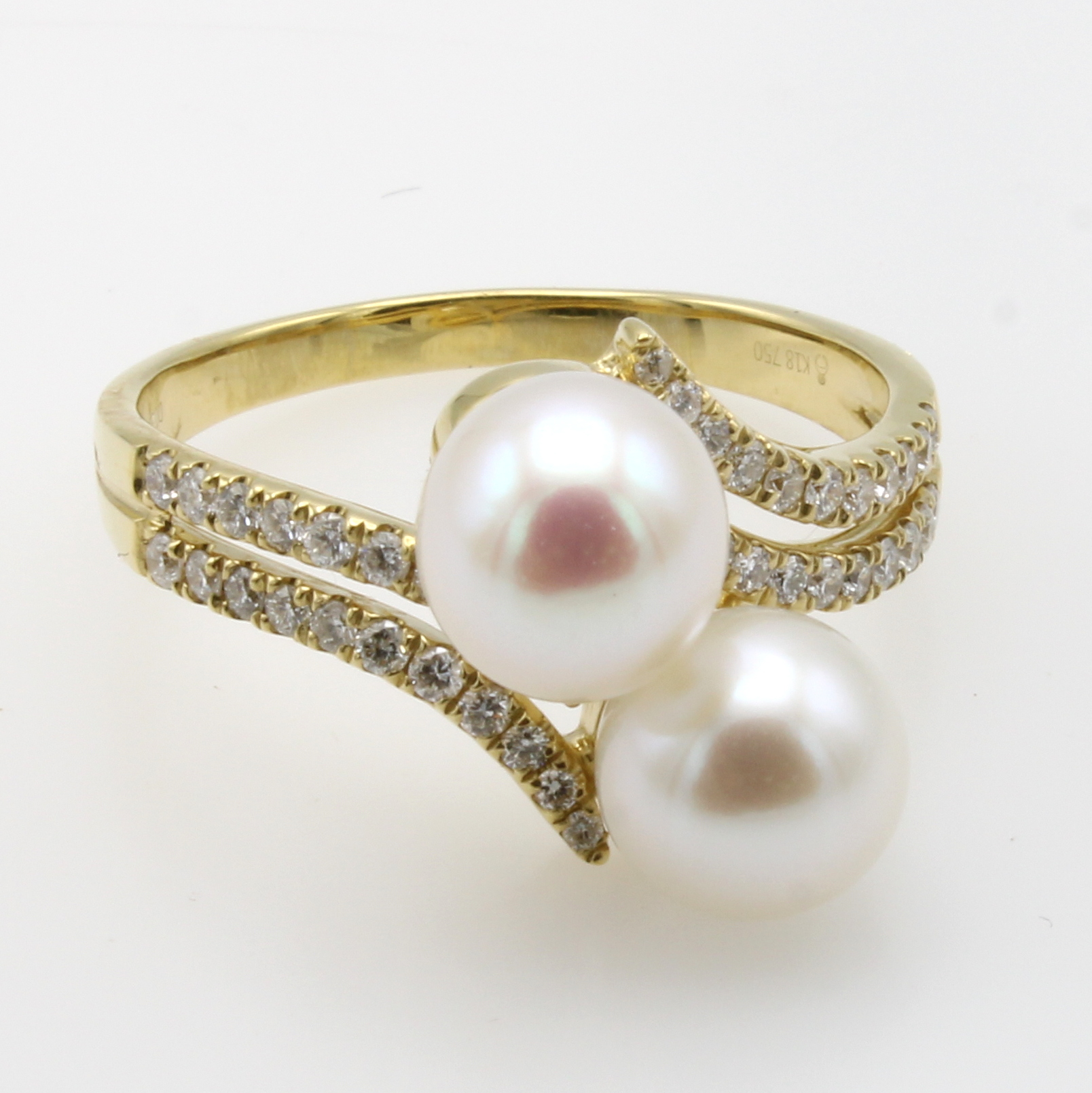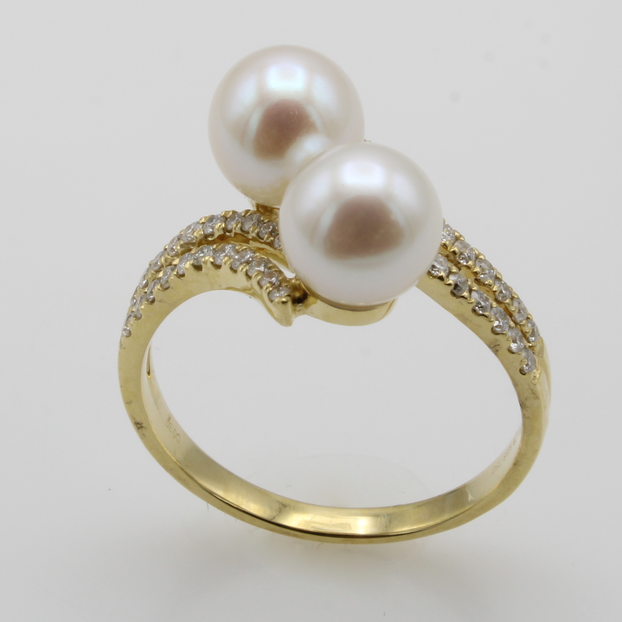 Ring mit Süßwasserzuchtperlen und Brillanten, GG 750/000, 2 weiße Perlen, D. ca. 7.5 mm, 42 Brill. zus. ca. 0.30 ct Weiß/si-p, RW ca. 56 Schätzpreis: 2900, - EUR