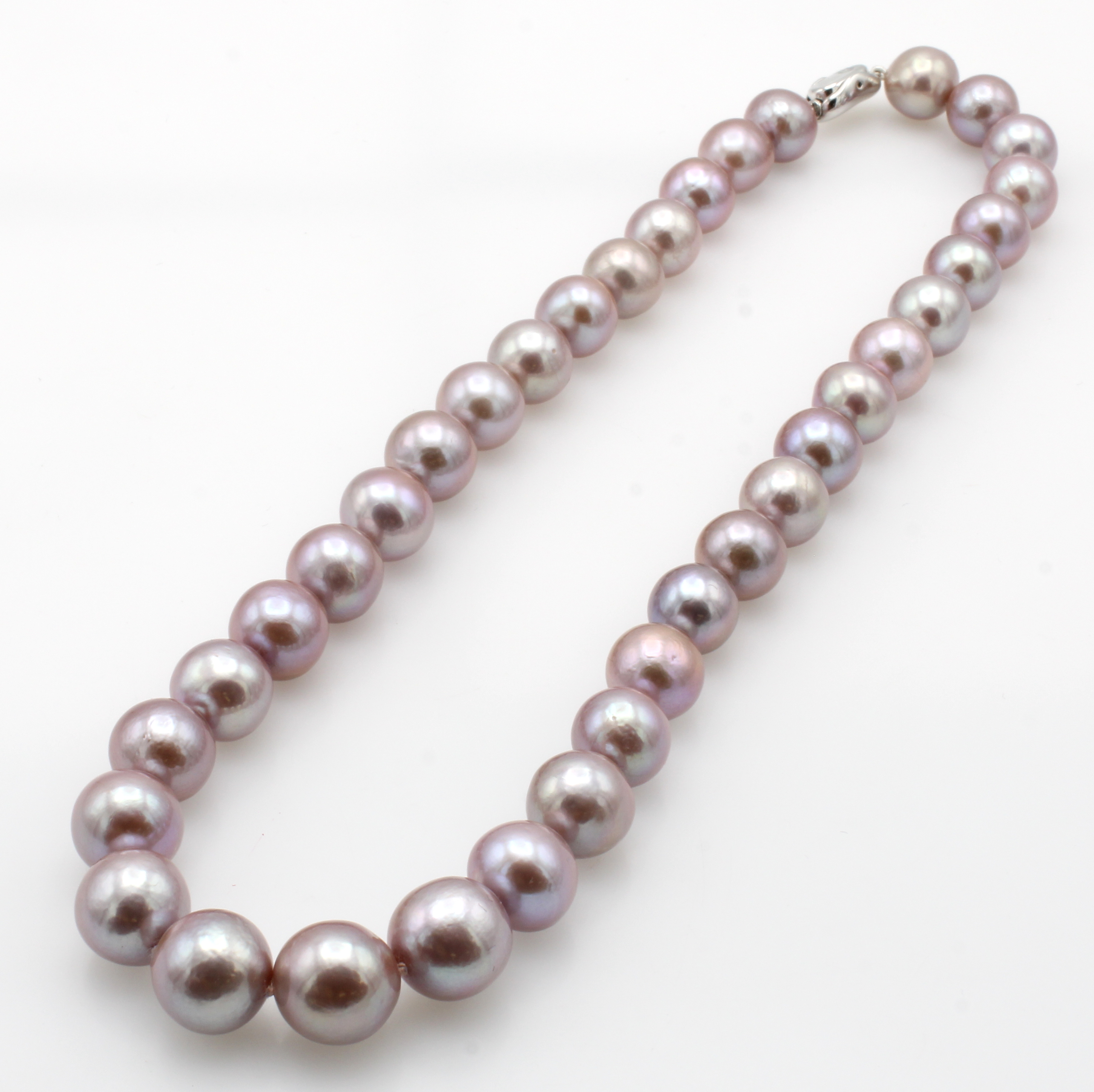 Süßwasserzuchtperlenkette, Druckschließe 925er Silber, lachsfarb. Mingperlen von altrosafarb. Lüster (gef.), D. ca. 10.8-11.7 mm, L. ca. 44 cm Schätzpreis: 1800, - EUR