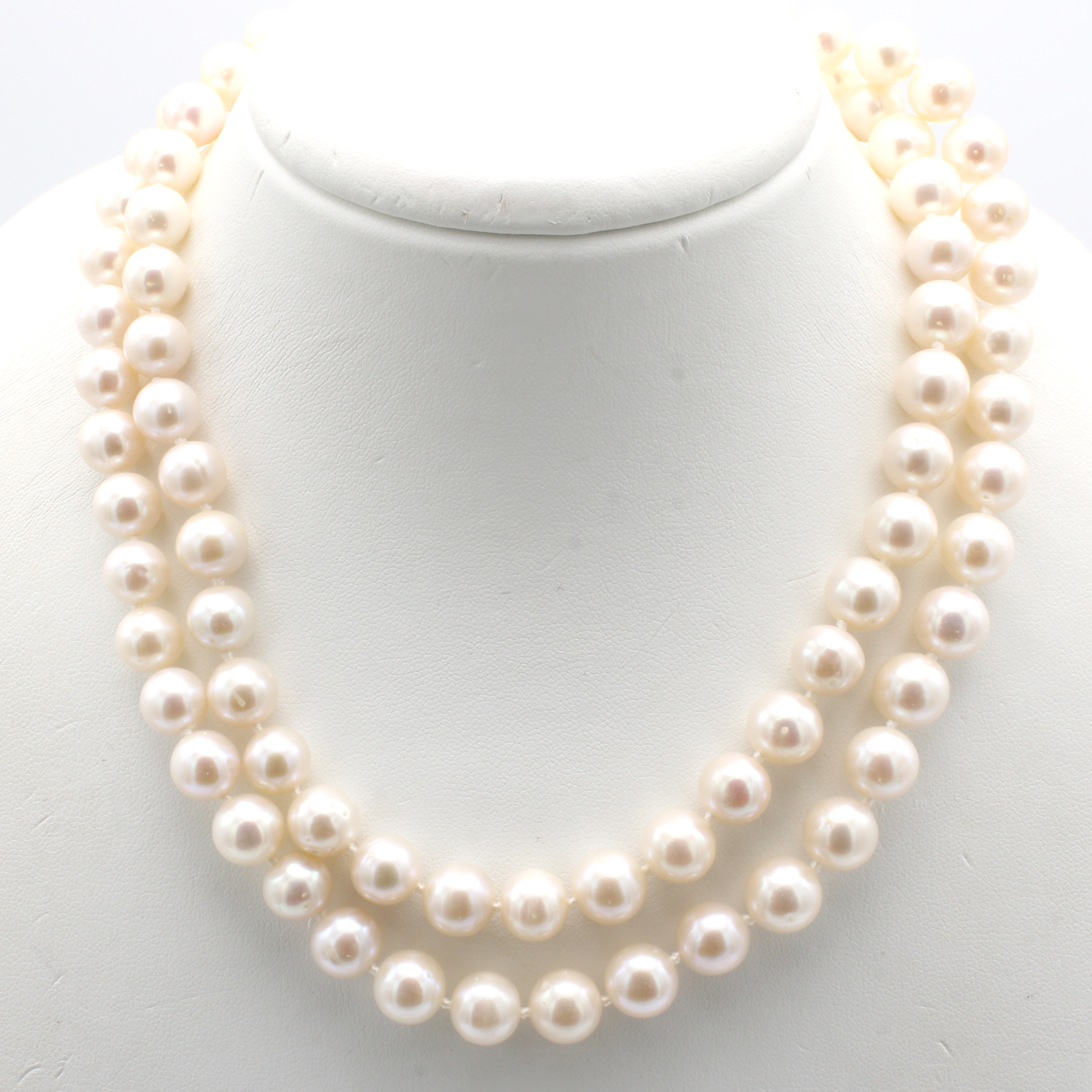 Endlose Süßwasserzuchtperlenkette, weiß- l.roséfarb. Perlen, D. ca. 9 mm, L. ca. 80 cm Schätzpreis: 780, - EUR
