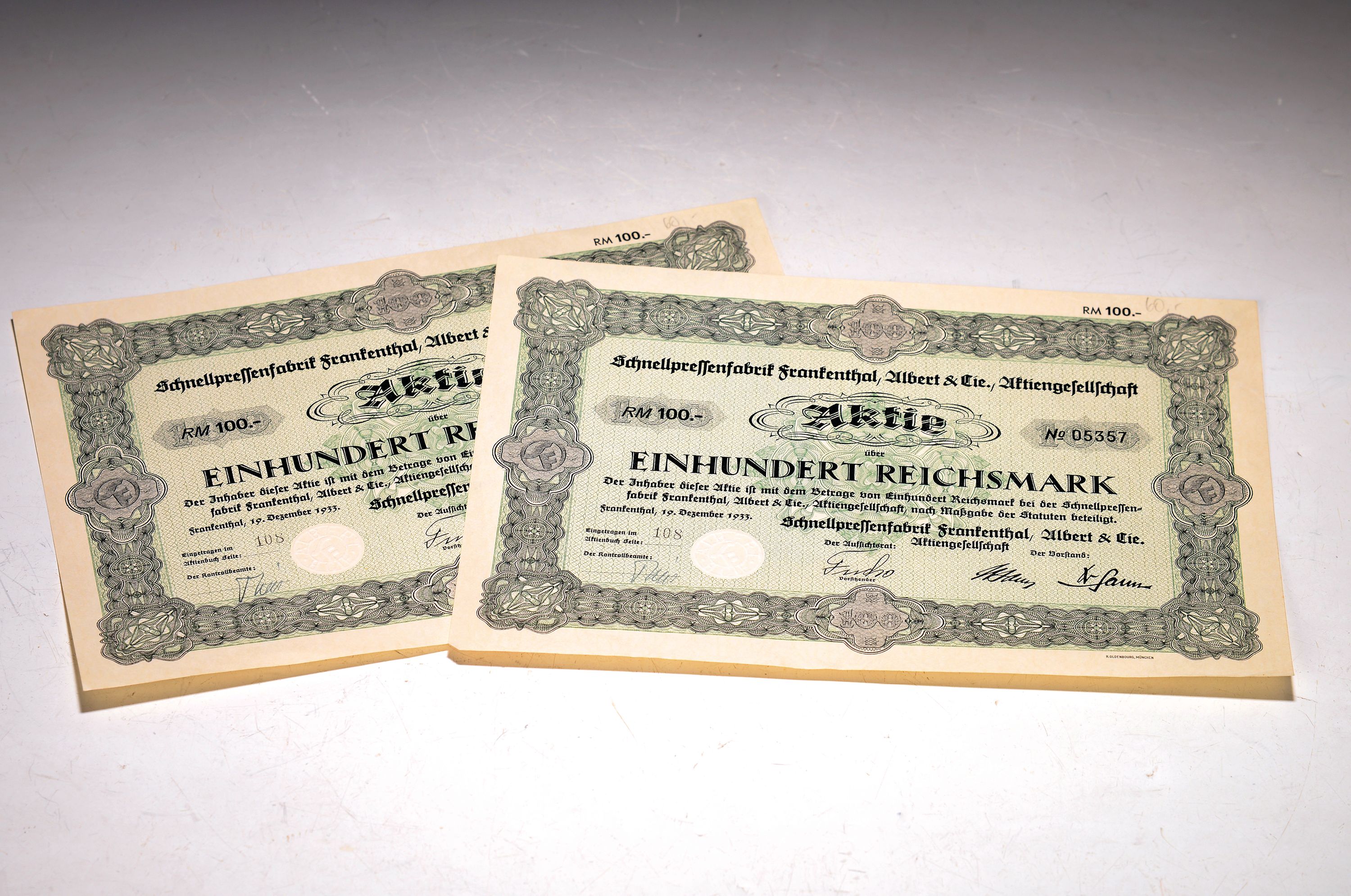 1933, Nennwert 100 RM, nicht entwertet, No. 05357 & 05354, Druck R. Oldenbourg, München,