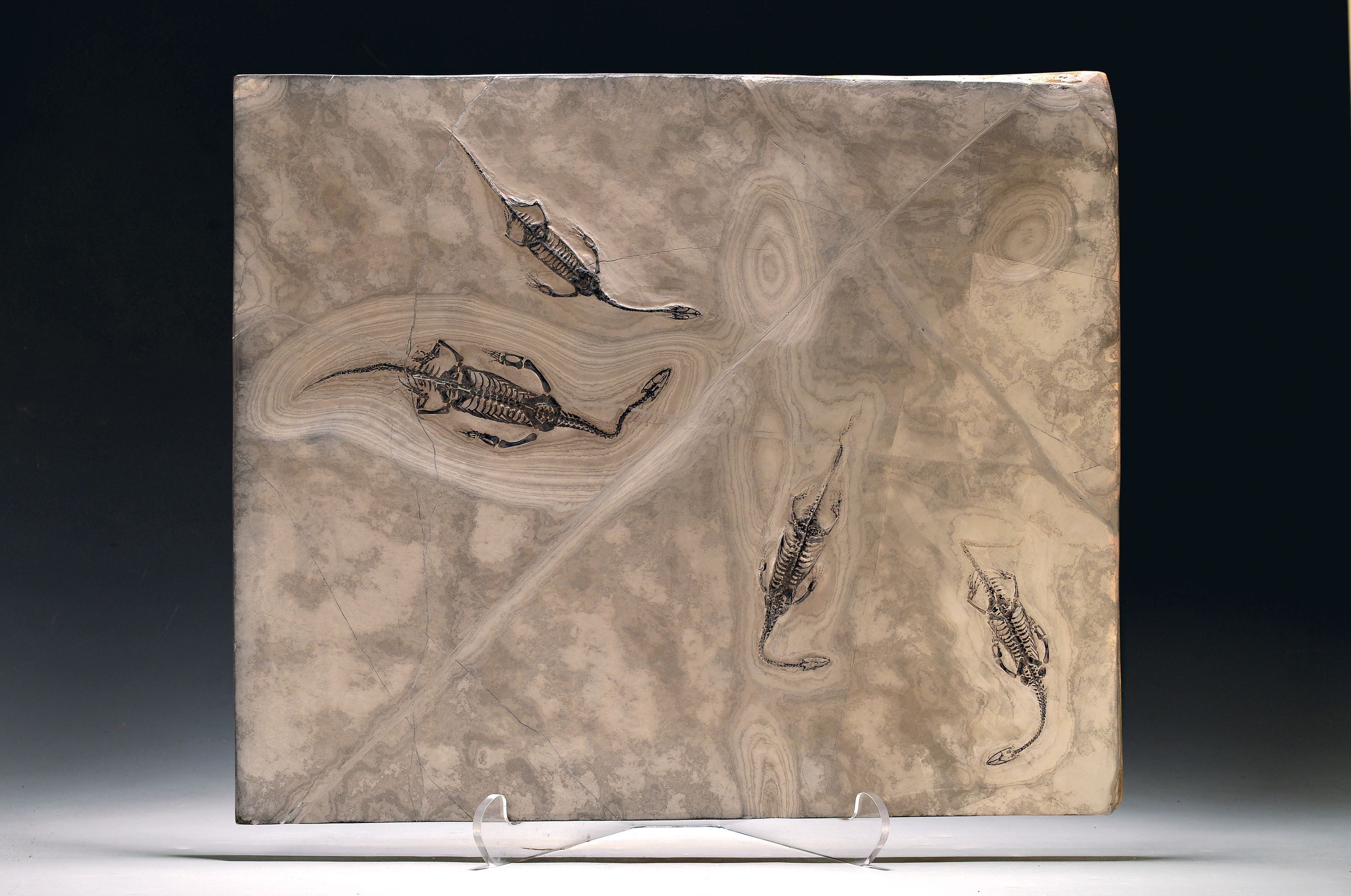Platte mit vier Schwimmsauriern, Keichosaurus hui (Nothosaurus), Guizhou-Provinz