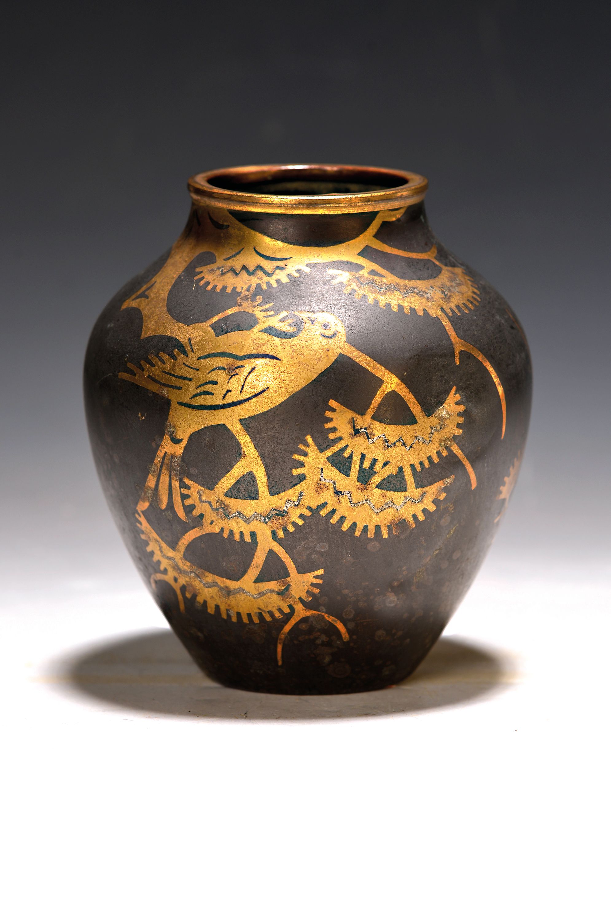 schwarz patiniert, mit Echtgolddekor, H. 13 cm, Bodenmarke, kl. Delle und berieben,