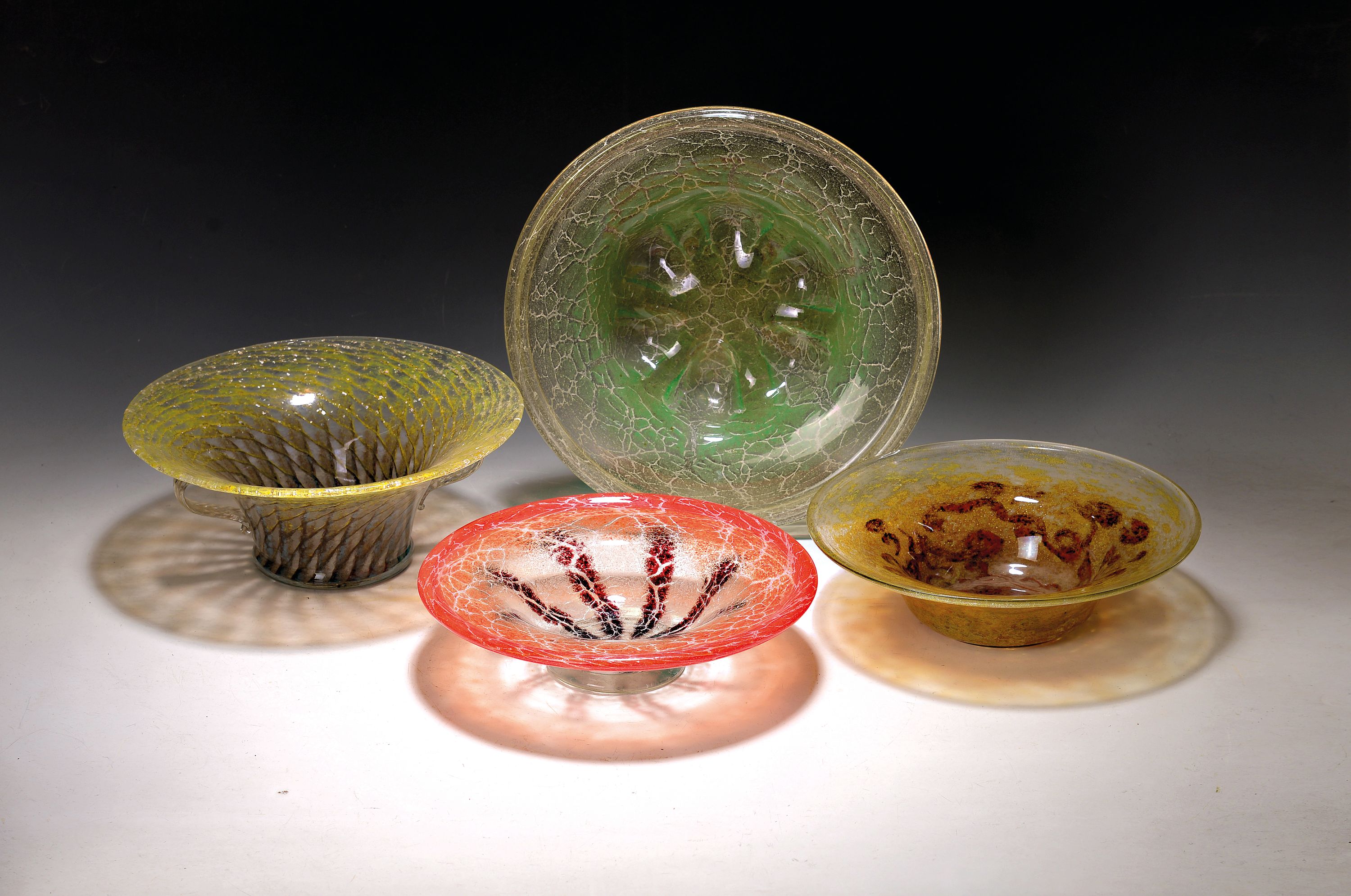 eine Schale Italien, 20.Jh., Glas, 3 Ikora -Schalen in rot, grün und rot/braun D.