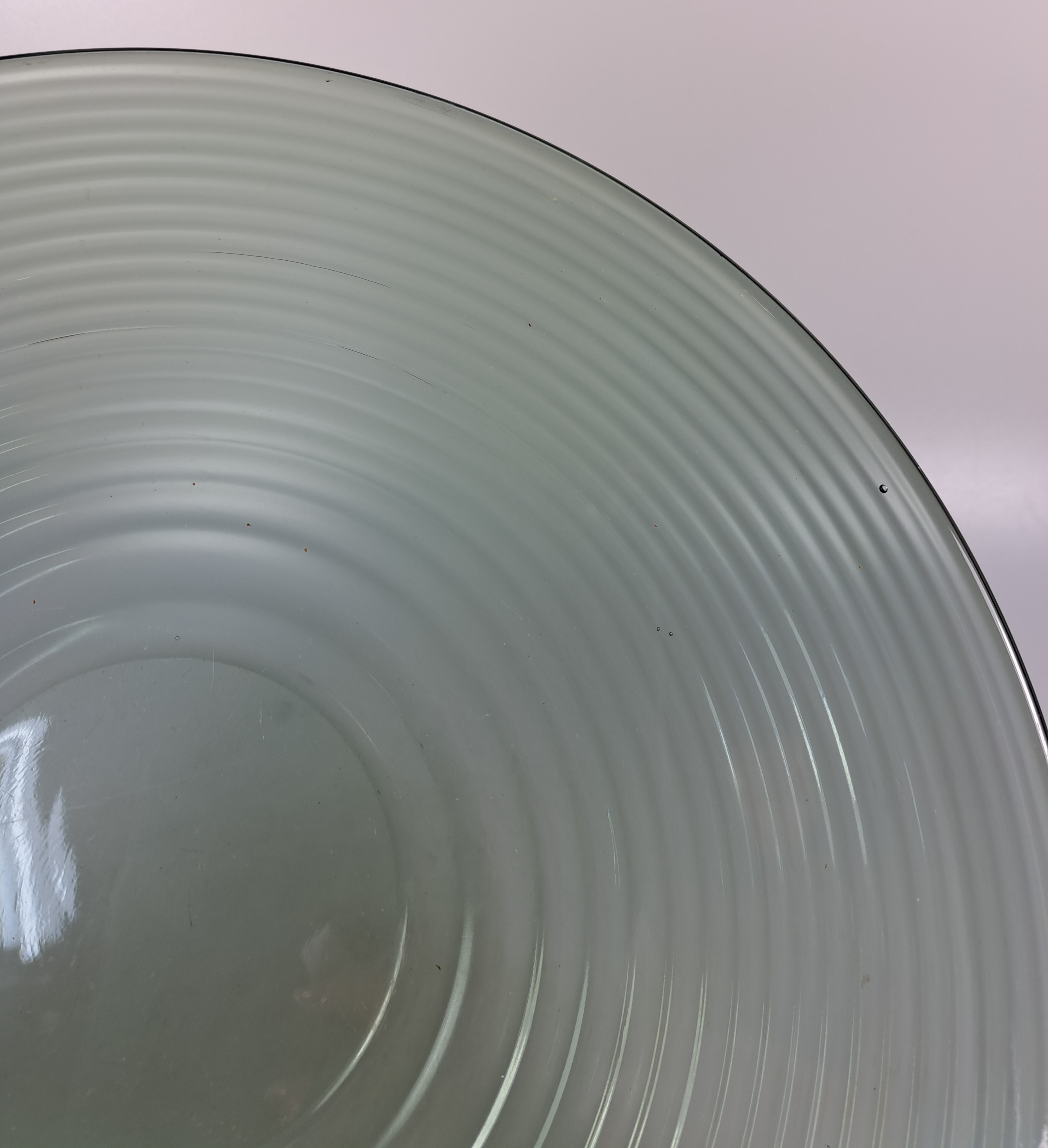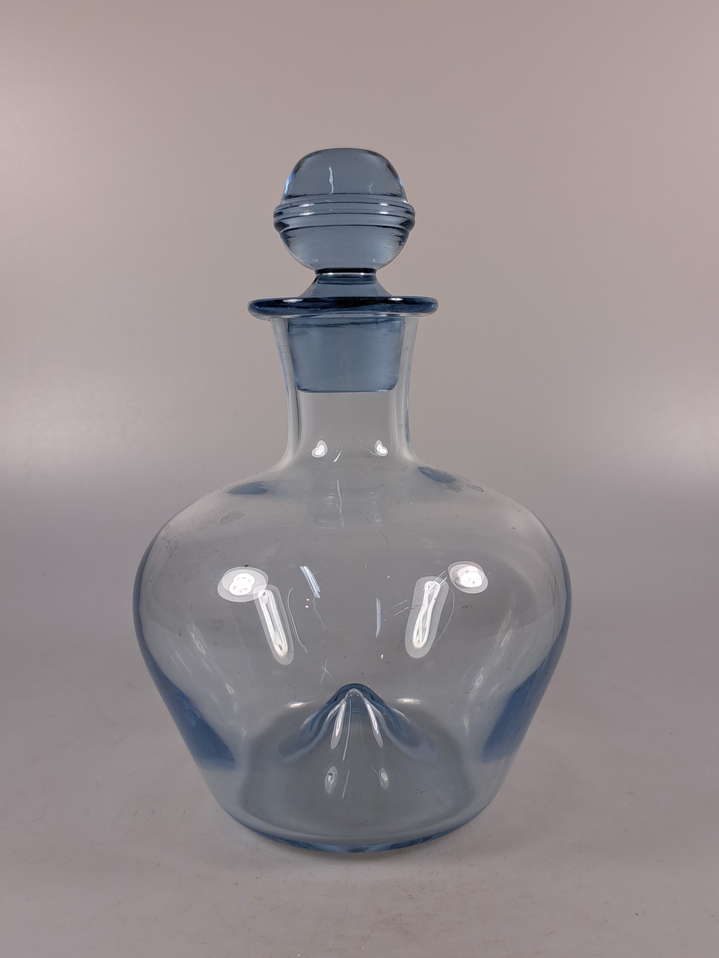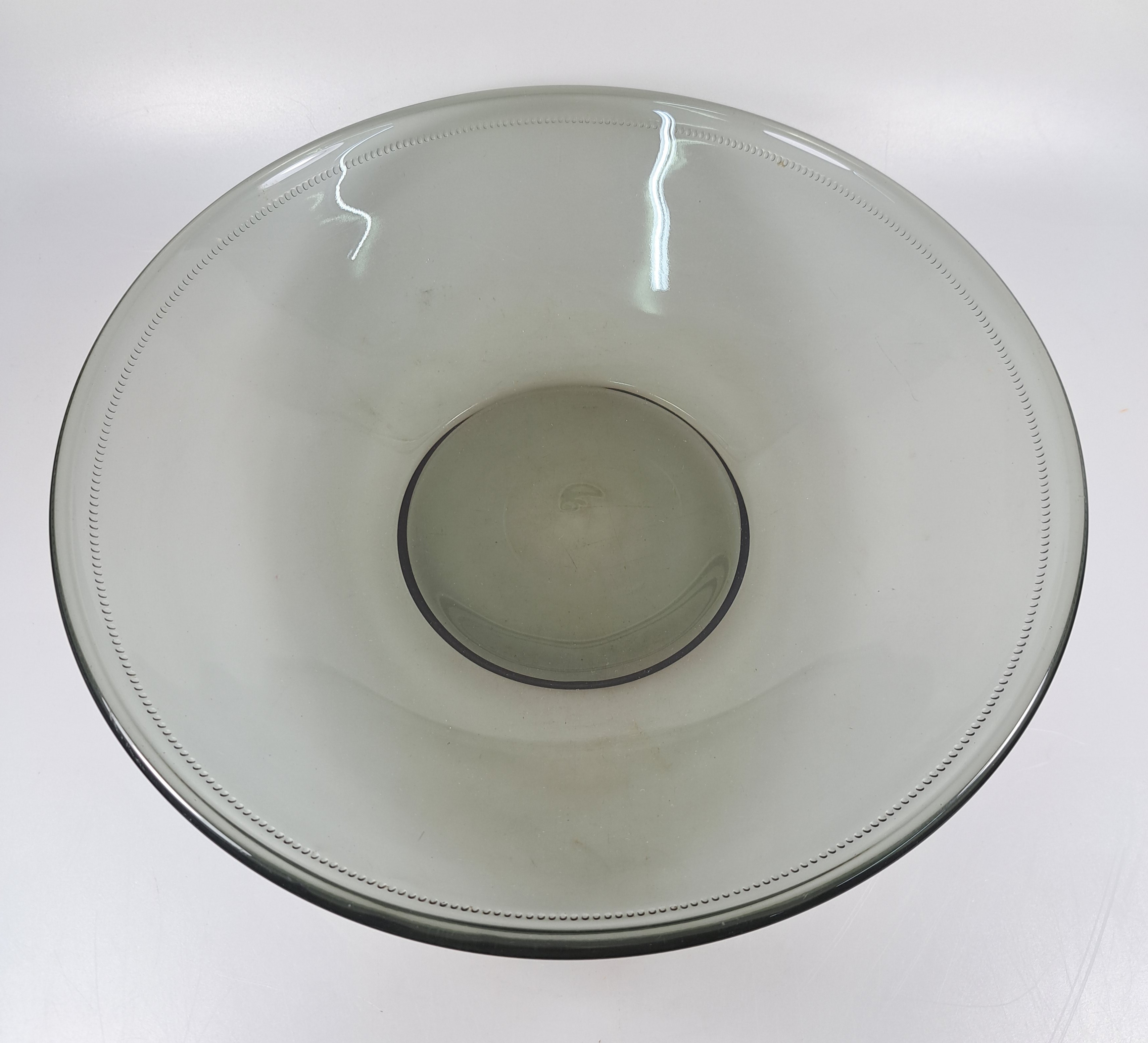 2 große Schalen und ein Dekanter, Entw. Wilhelm Wagenfeld (1900-1990) für WMF Geislingen, 1960er-Jahre, 2 Schalen rauchgrün gefärbtes Glas mit Linien- bzw. Punktdekor, D. 33/34 cm, Dekante mit Stopfen aus blau eingefärbtem Glas H. 20 cm