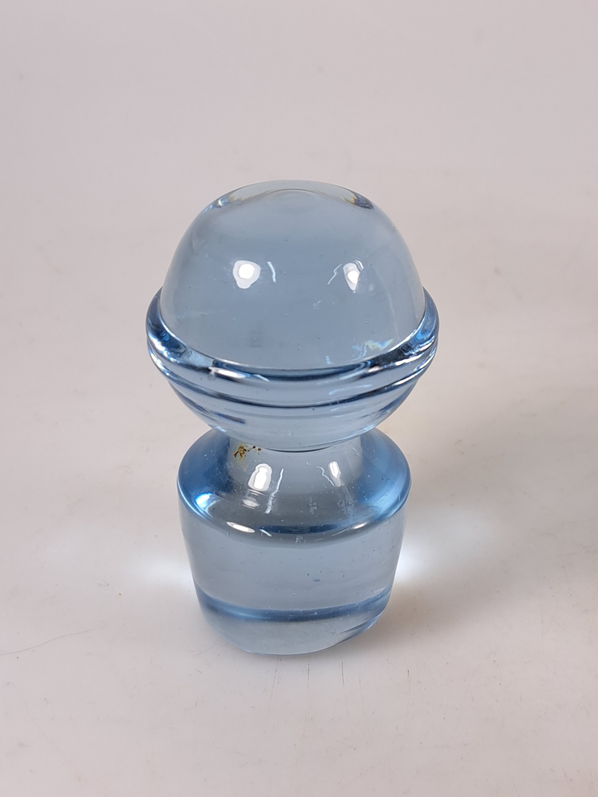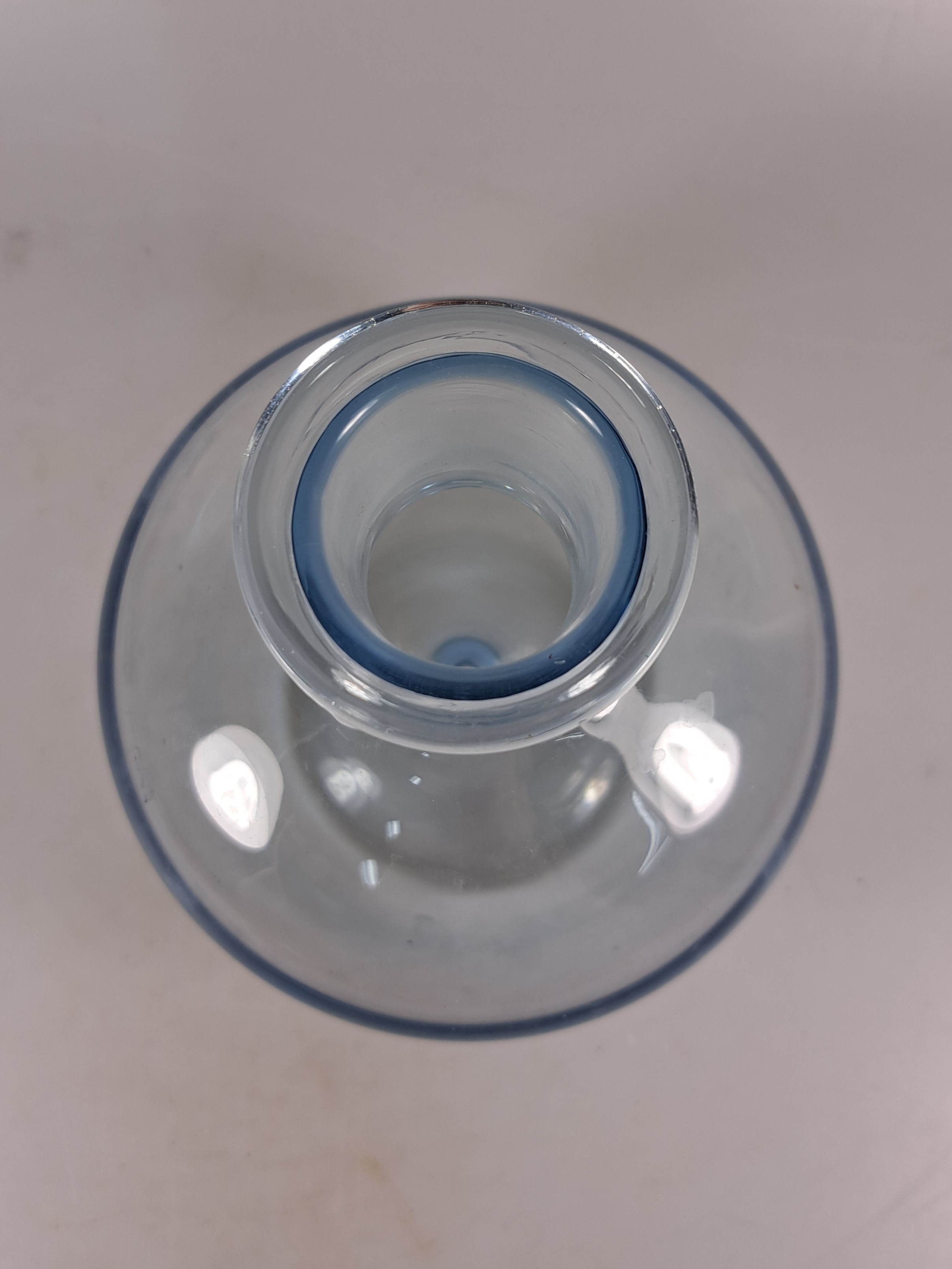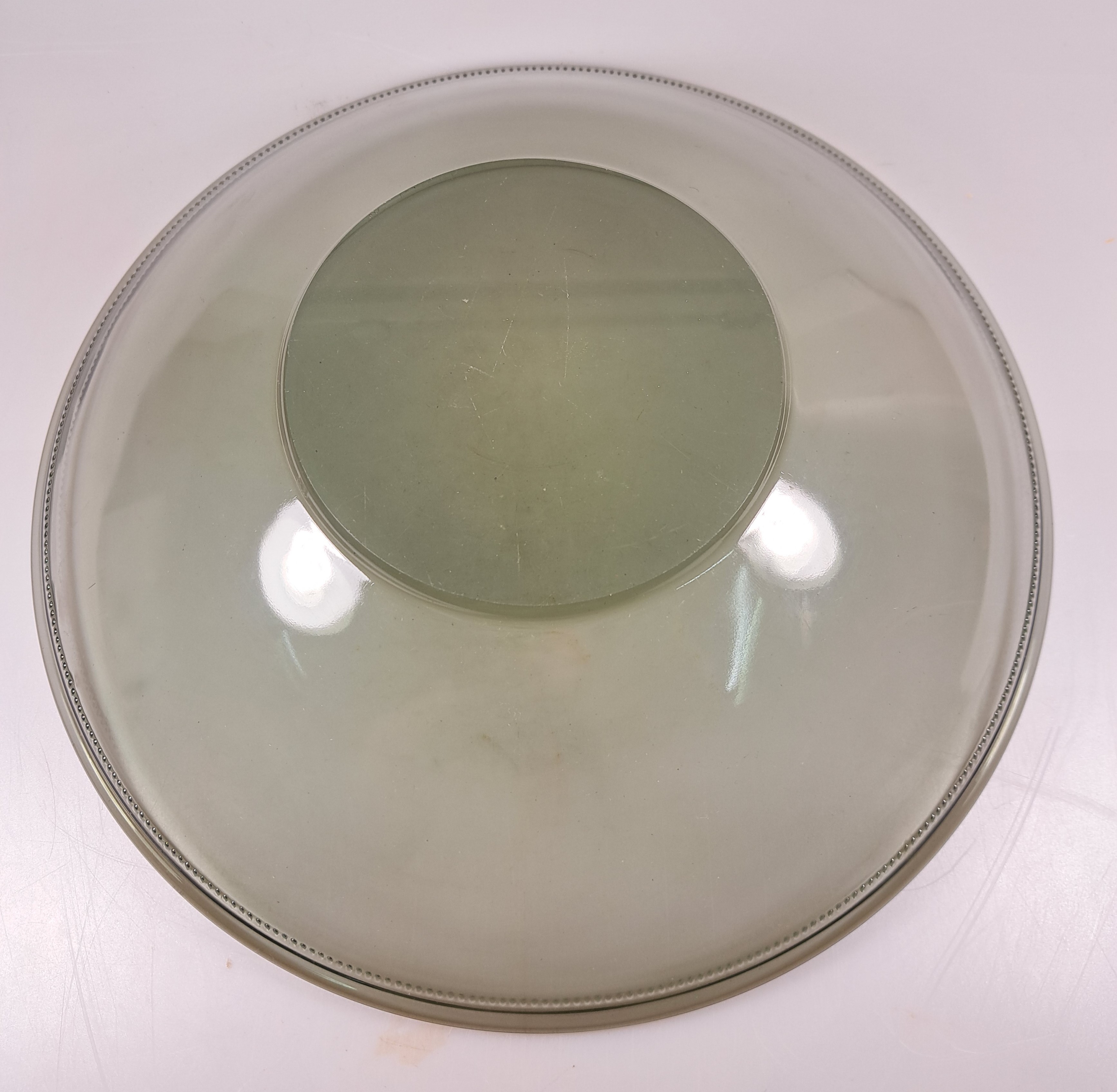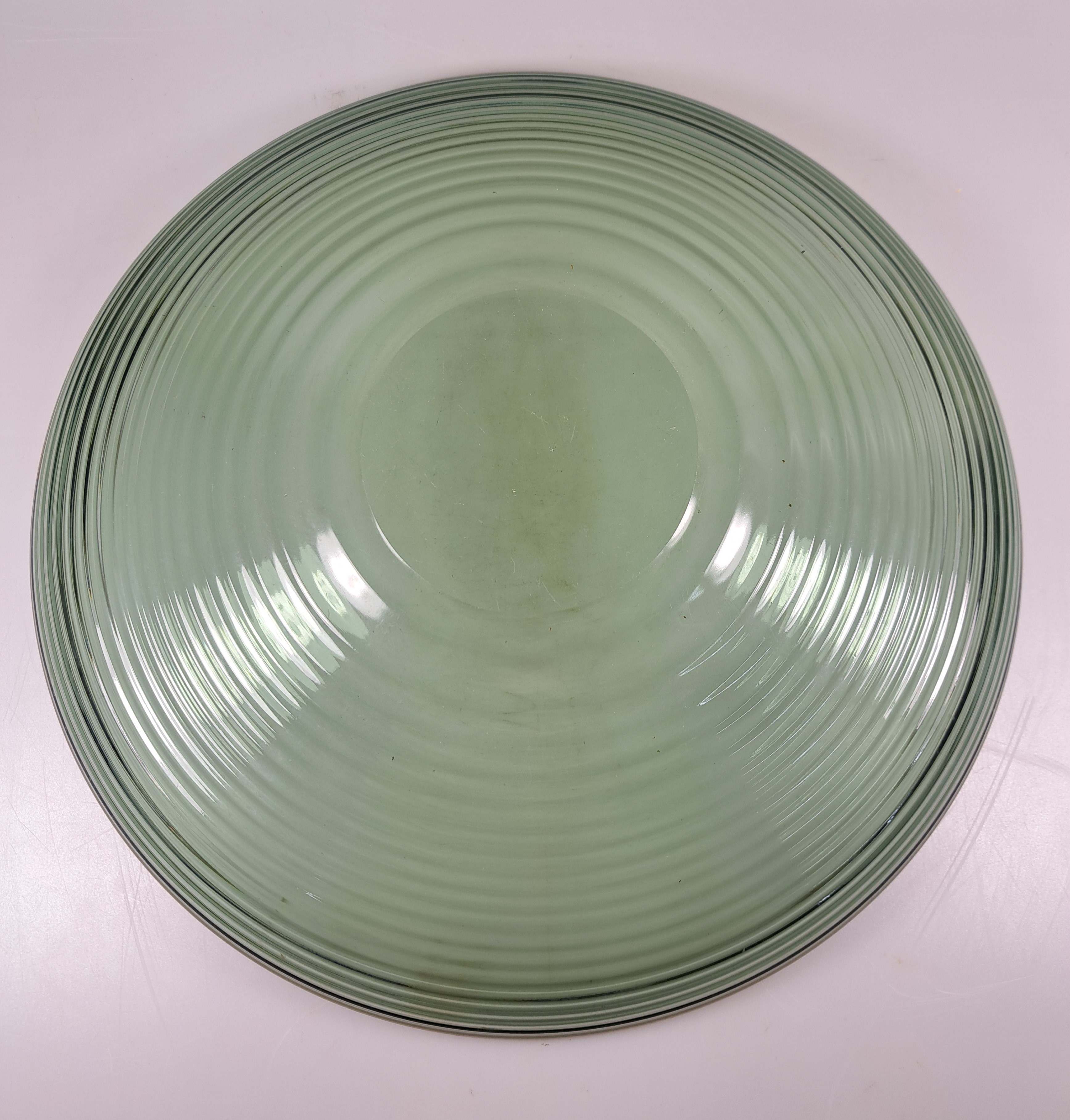 2 große Schalen und ein Dekanter, Entw. Wilhelm Wagenfeld (1900-1990) für WMF Geislingen, 1960er-Jahre, 2 Schalen rauchgrün gefärbtes Glas mit Linien- bzw. Punktdekor, D. 33/34 cm, Dekante mit Stopfen aus blau eingefärbtem Glas H. 20 cm