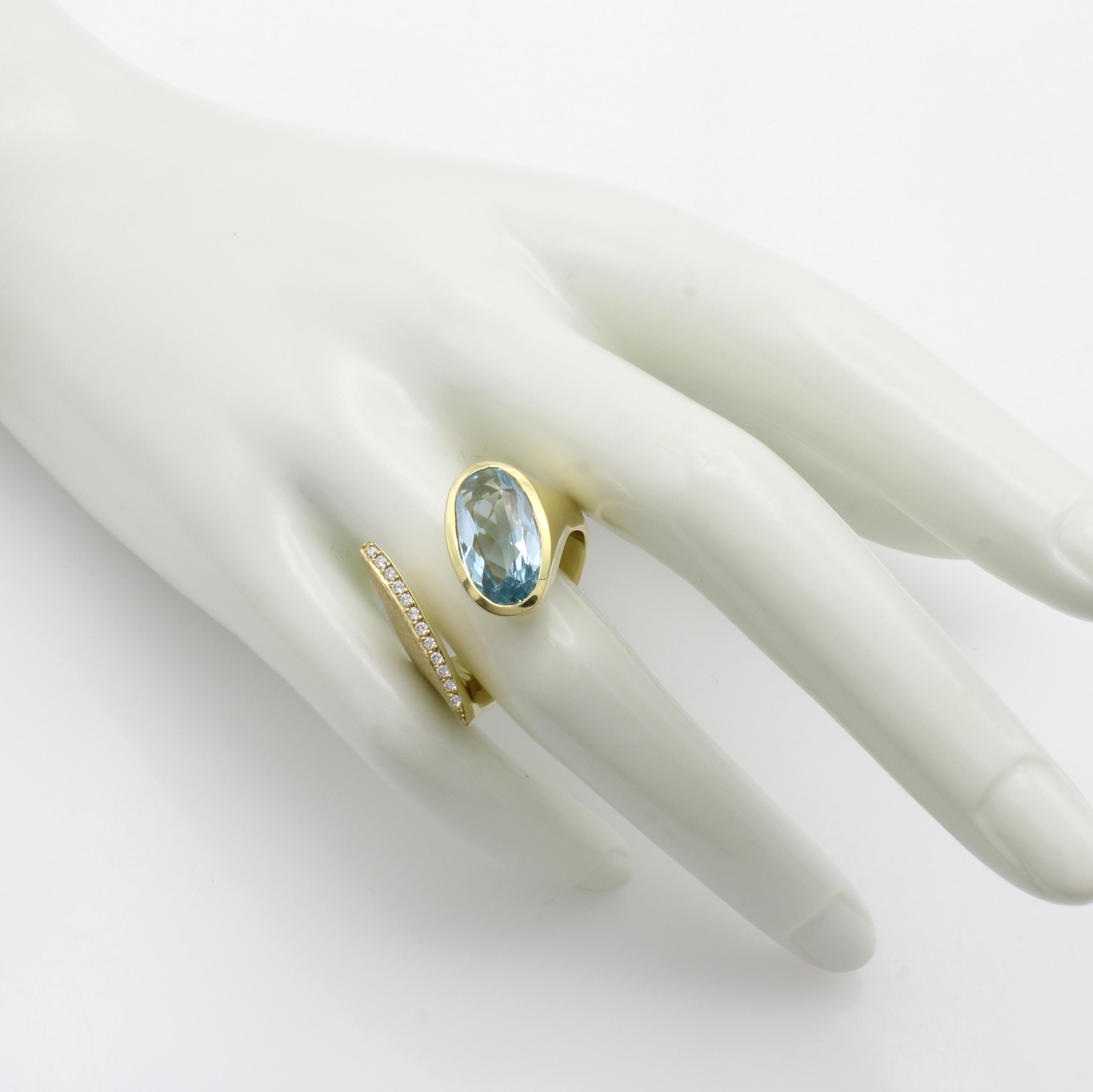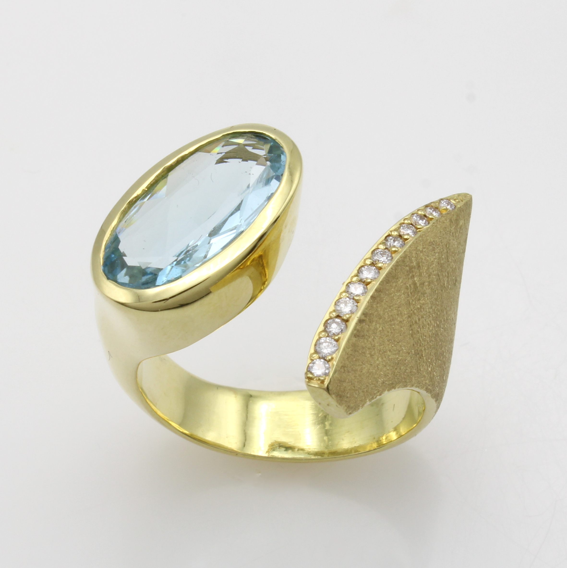 Ring mit Aquamarin und Brillanten, GG 585/ 000, offen gearb. u. z.T. strichmatt., ovaler Aquam. ca. 2.5 ct, Brill. zus. ca. 0.10 ct Feines Weiß/vs-si, RW ca. 59 Schätzpreis: 8200, - EUR