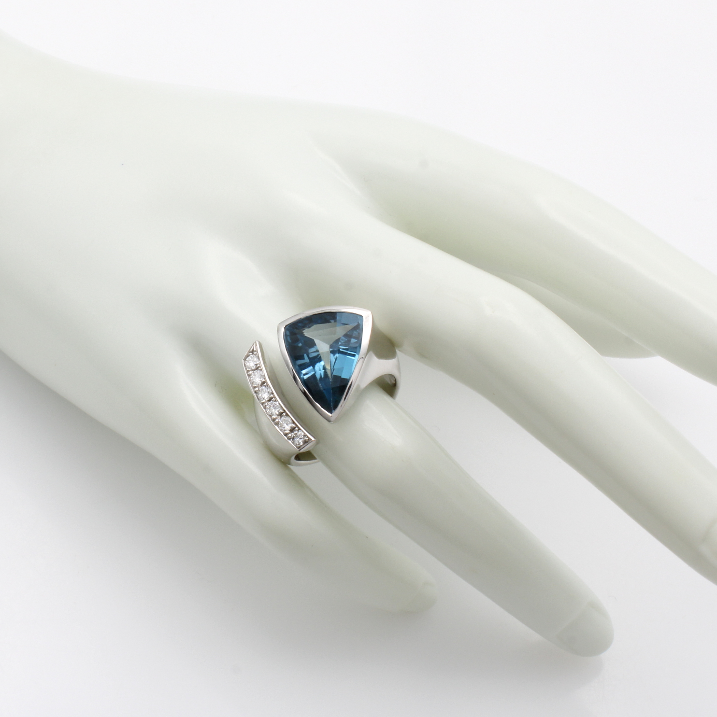 Ring mit Aquamarin und Brillanten, WG 750/ 000, dreieckiger Aquam. v. intensiver Farbe ca. 5.8 ct, Brill. zus. ca. 0.30 ct hochfeines Weiß-feines Weiß/lupenrein, Gesamtgew. ca. 17.3 g, RW ca. 58 Schätzpreis: 14800, - EUR
