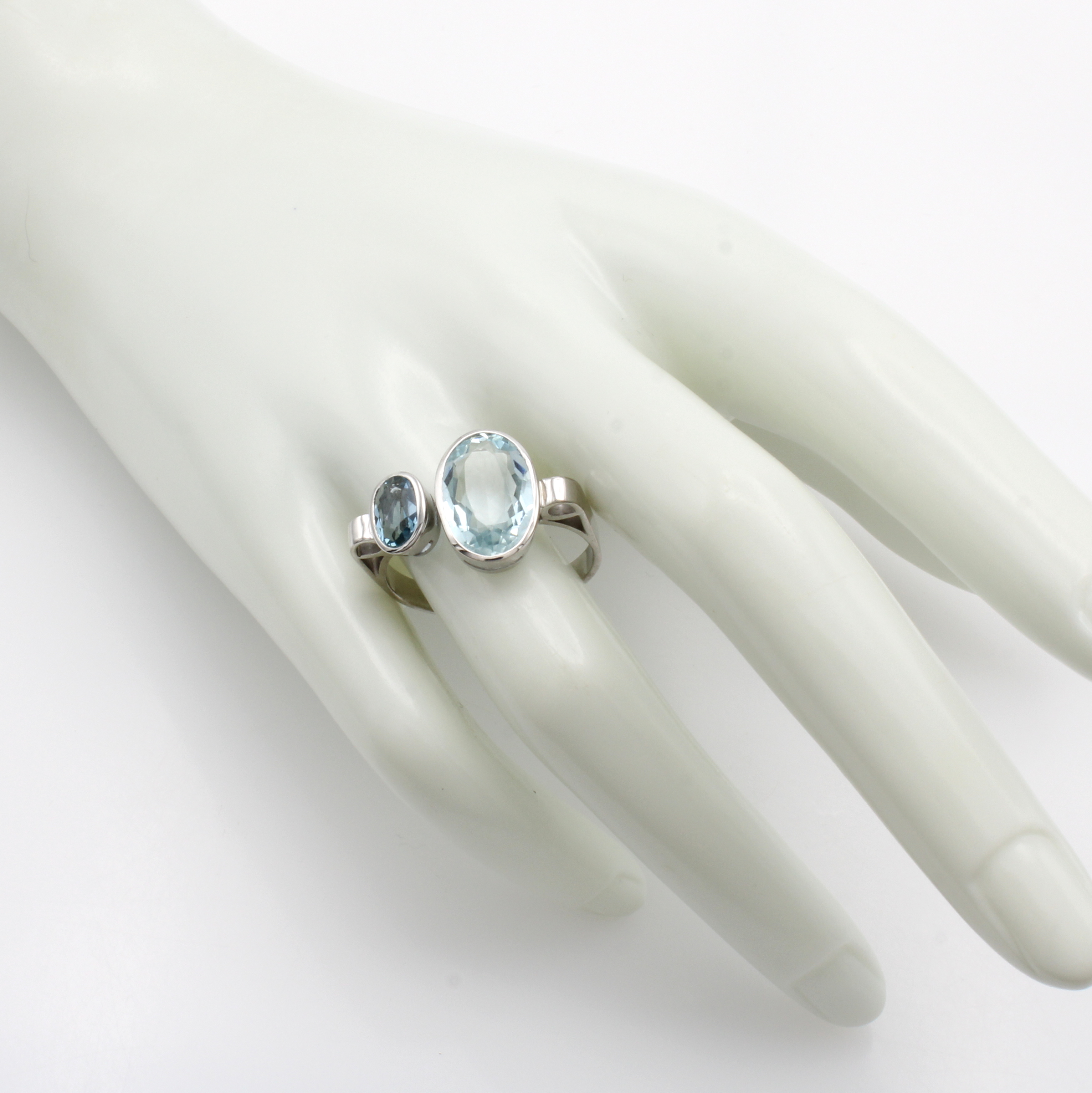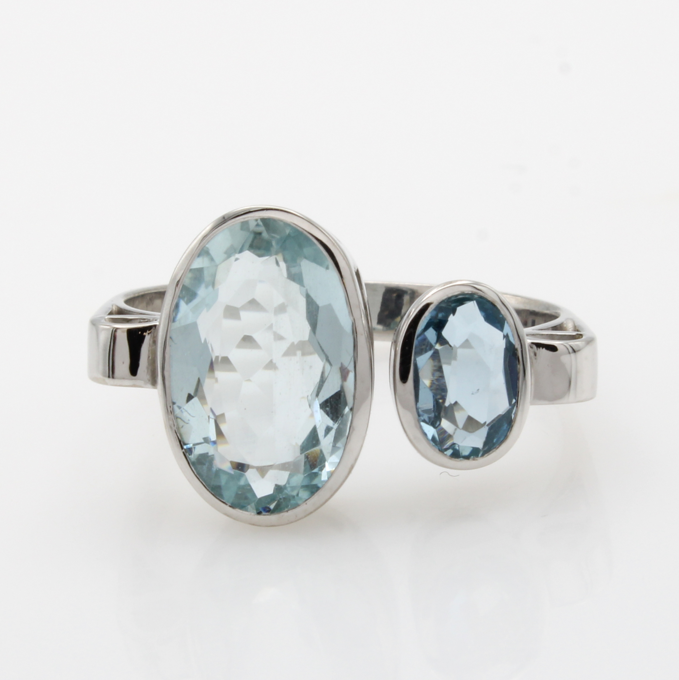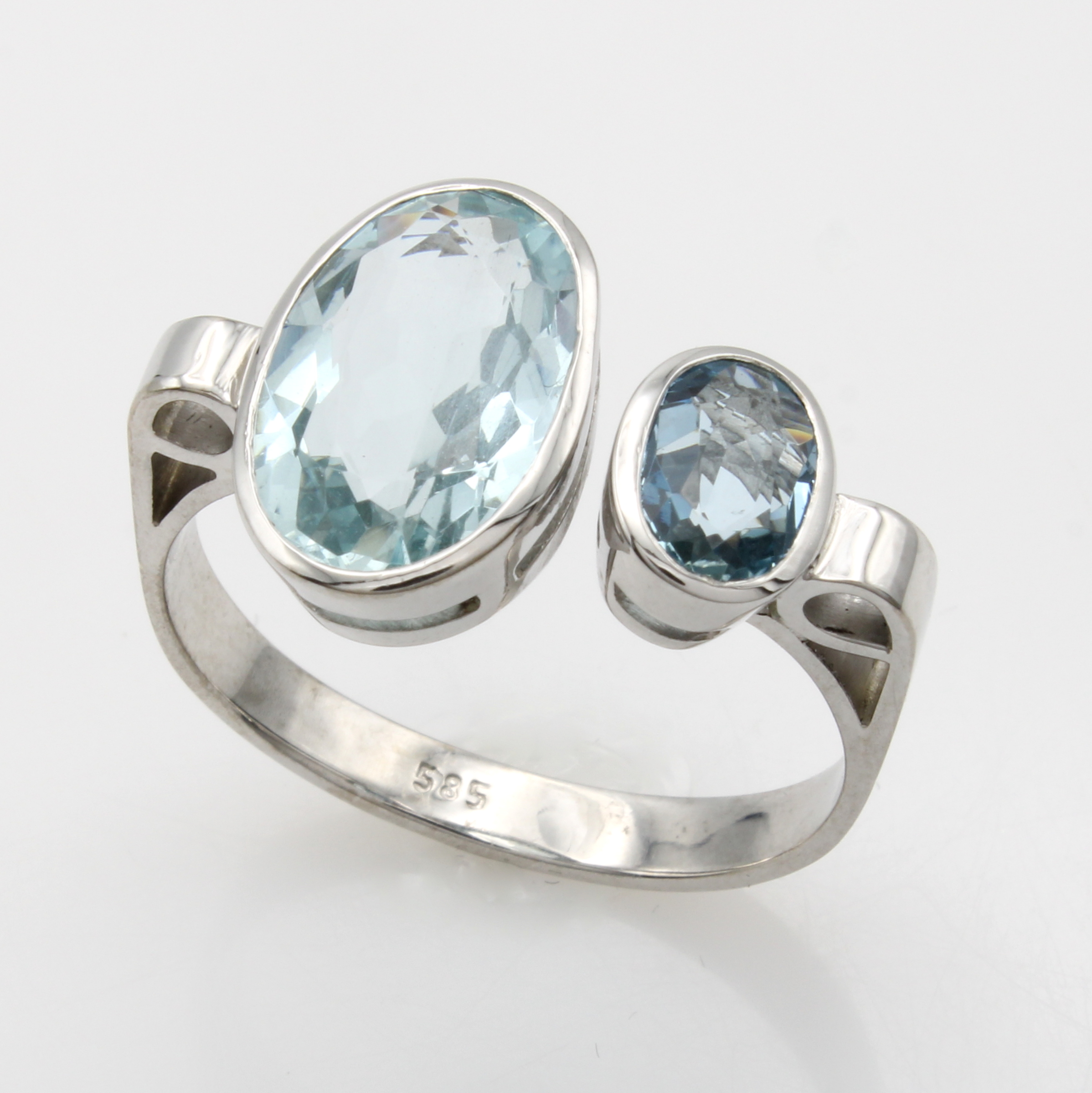 Ring mit Aquamarinen, WG 585/000, offen gearb., 2 ovale Aquam. zus. ca. 4.7 ct, RW ca. 59 Schätzpreis: 3200, - EUR