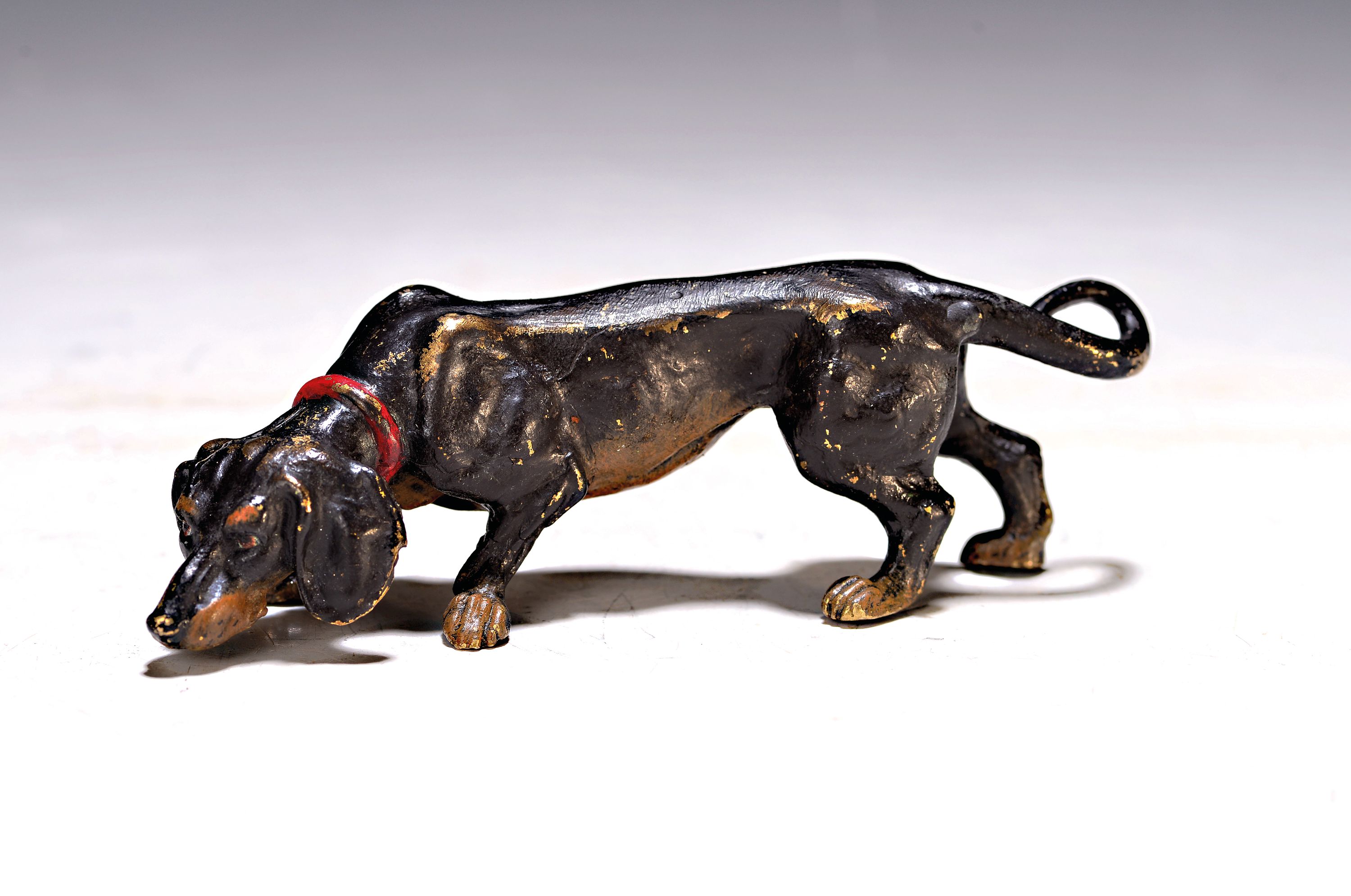 Große Wiener Bronze, sign. Bergmann, schnüffelnder Dackel, bunt staffiert, L.ca.