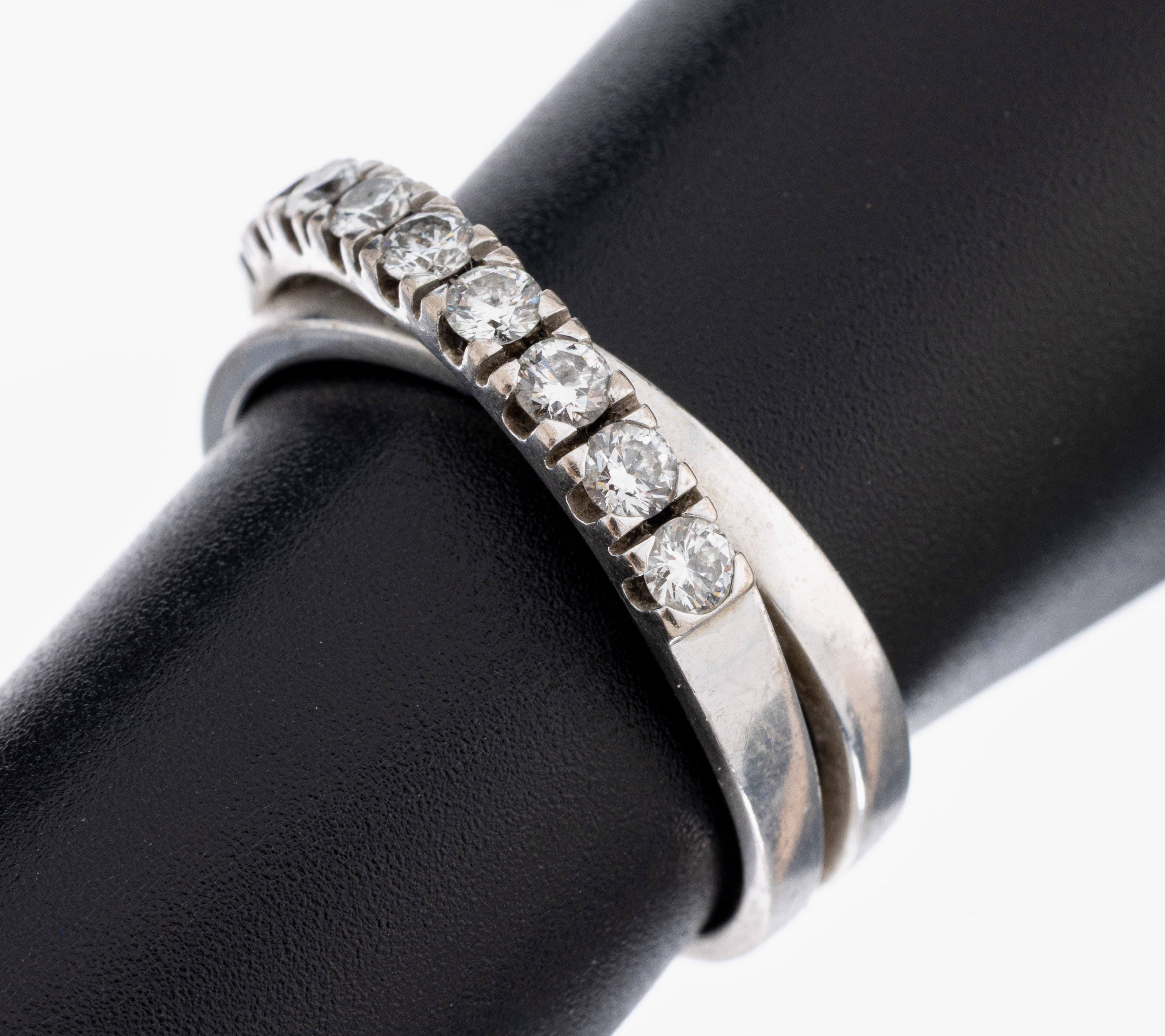 18 kt Gold Brillant-Ring, GG 750/000, gekreuzte Ringschiene, 9 Brillanten zus. ca.
