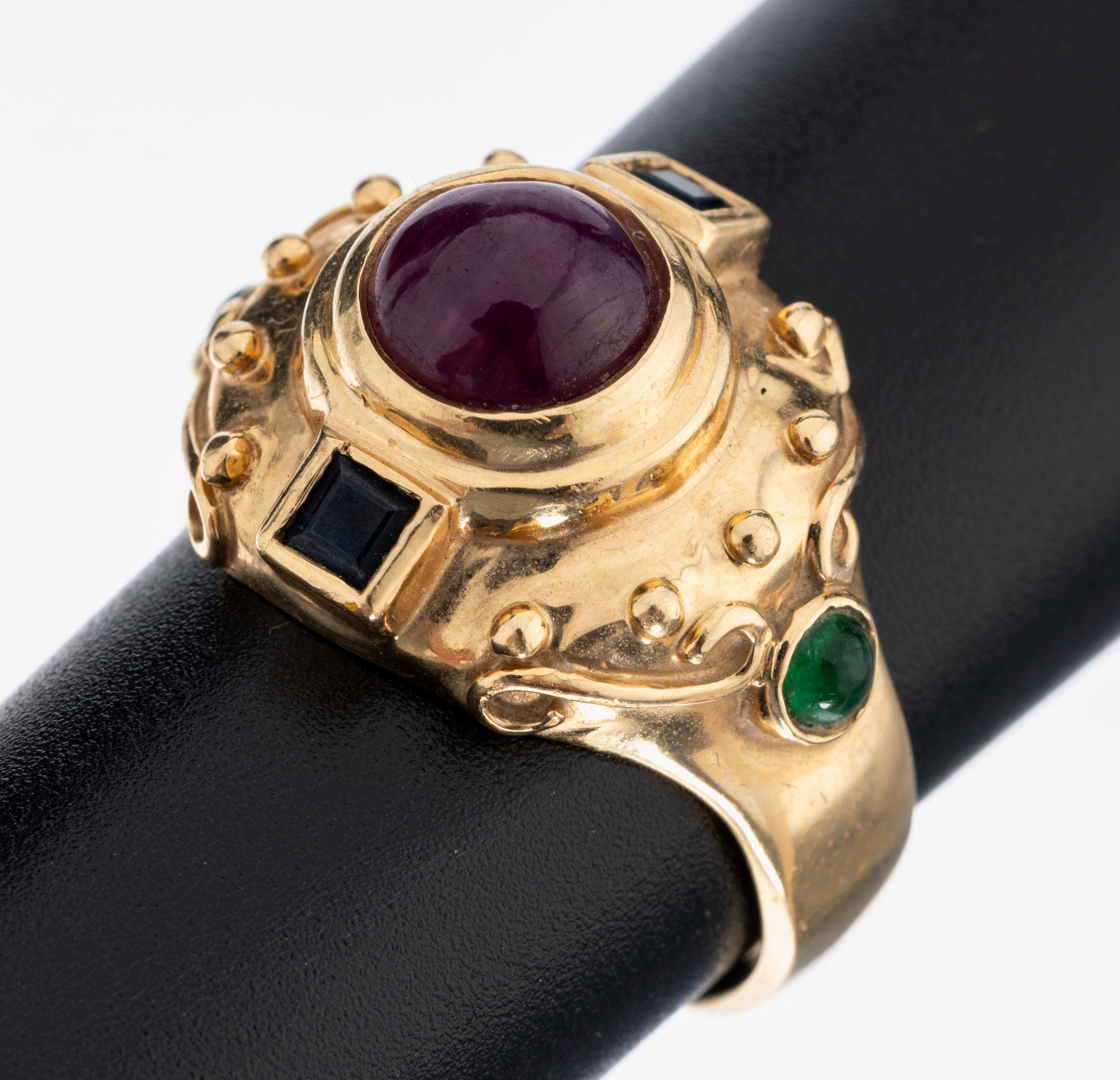 14 kt Gold Farbstein-Ring, GG 585/000, mittig runder Rubincabochon ca. 1.35 ct, 2