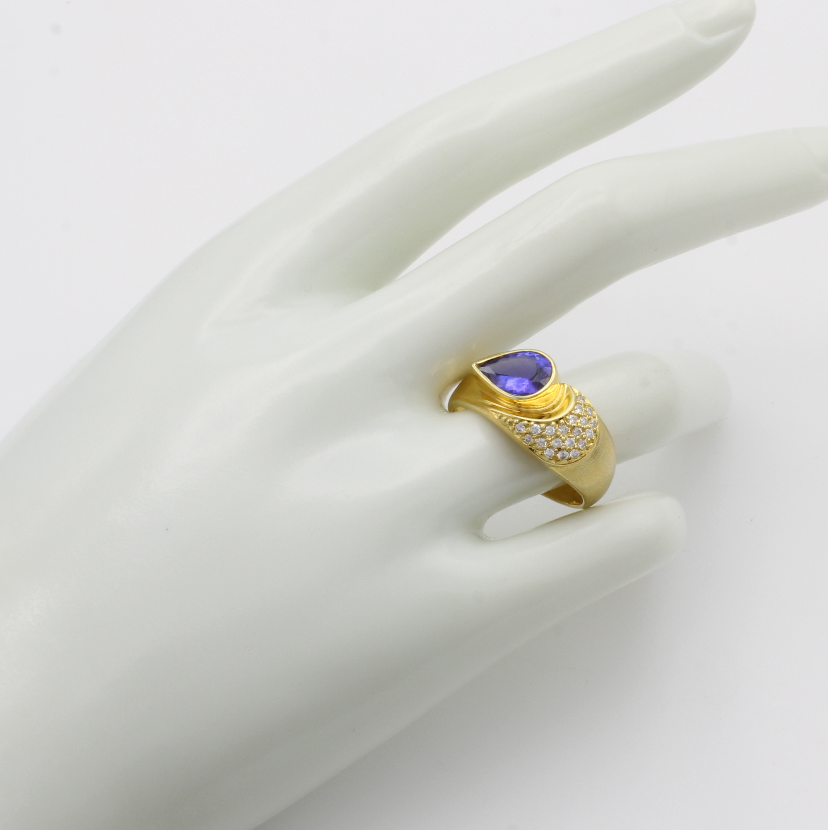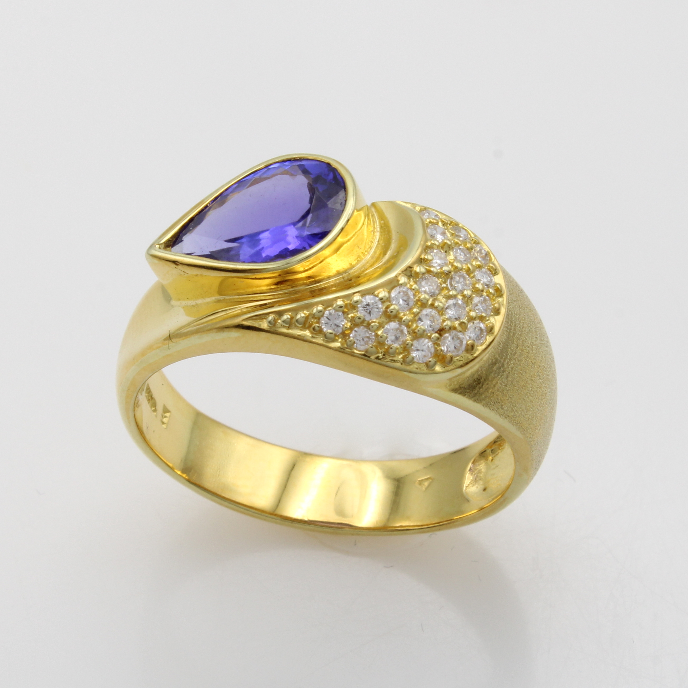 Ring mit Tansanit und Brillanten, GG 585/000, Tansanittropfen ca. 1.43 ct, Brill. zus. ca. 0.30 ct feines Weiß/si, RW ca. 64 Schätzpreis: 4400, - EUR