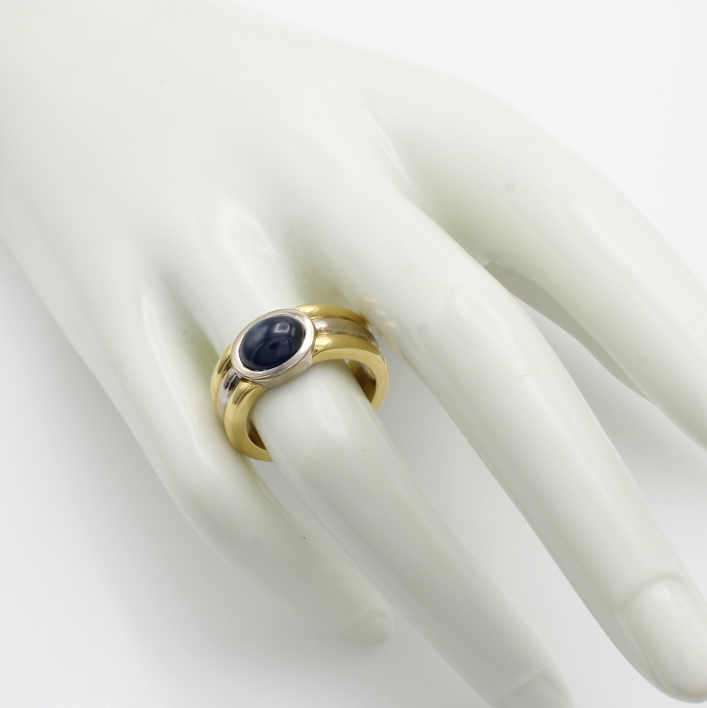 Ring mit Saphir, GG 750/000, z.T. rhod., geriefte Schiene, ovaler Saphircabochon ca. 2.8 ct, RW ca. 54 Schätzpreis: 6980, - EUR