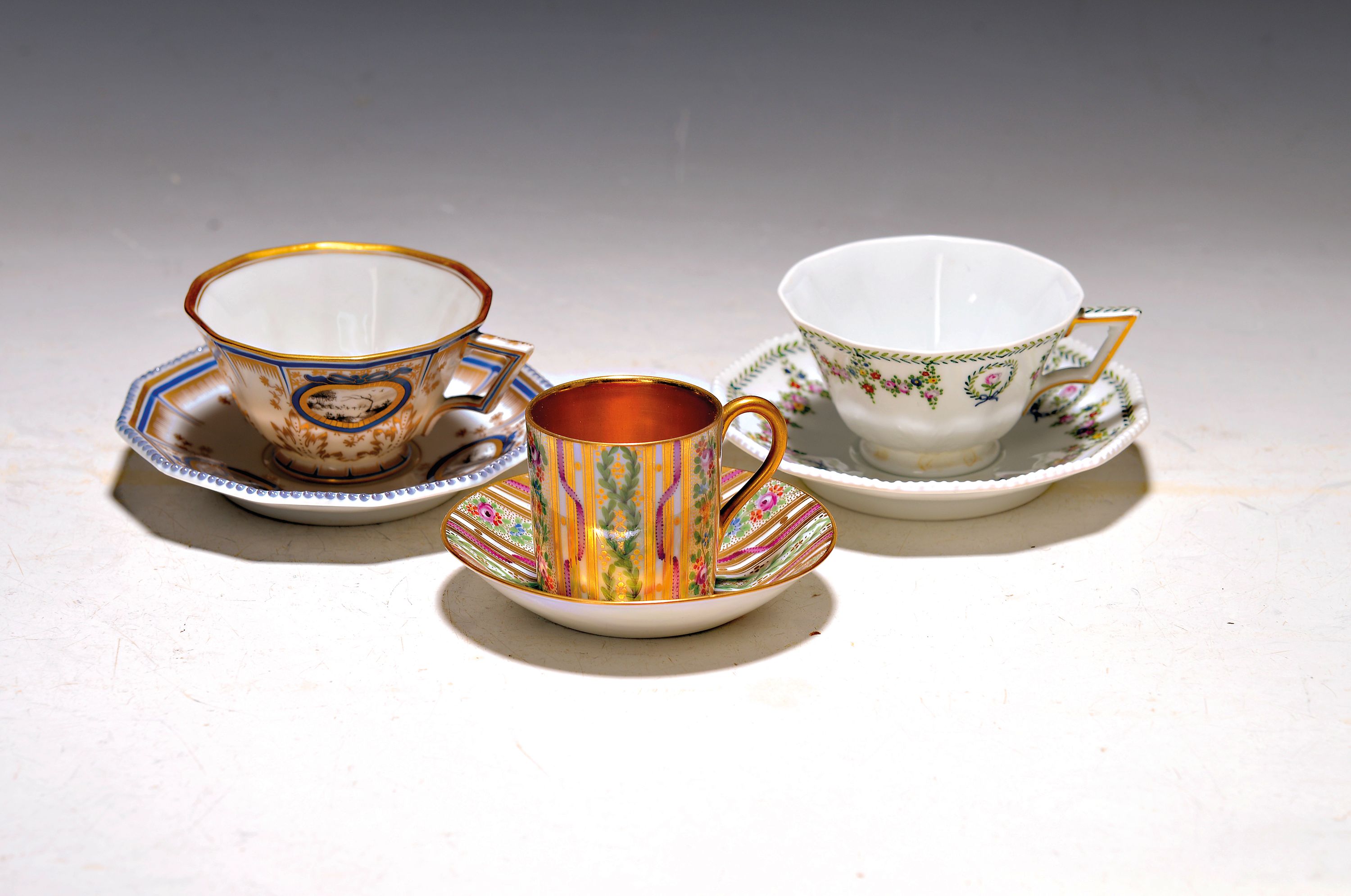 3 Mokkatassen, Nymphenburg, 20. Jh., a. zylinderförmig, Dekor in Stoff- bzw. Tapetenmuster
