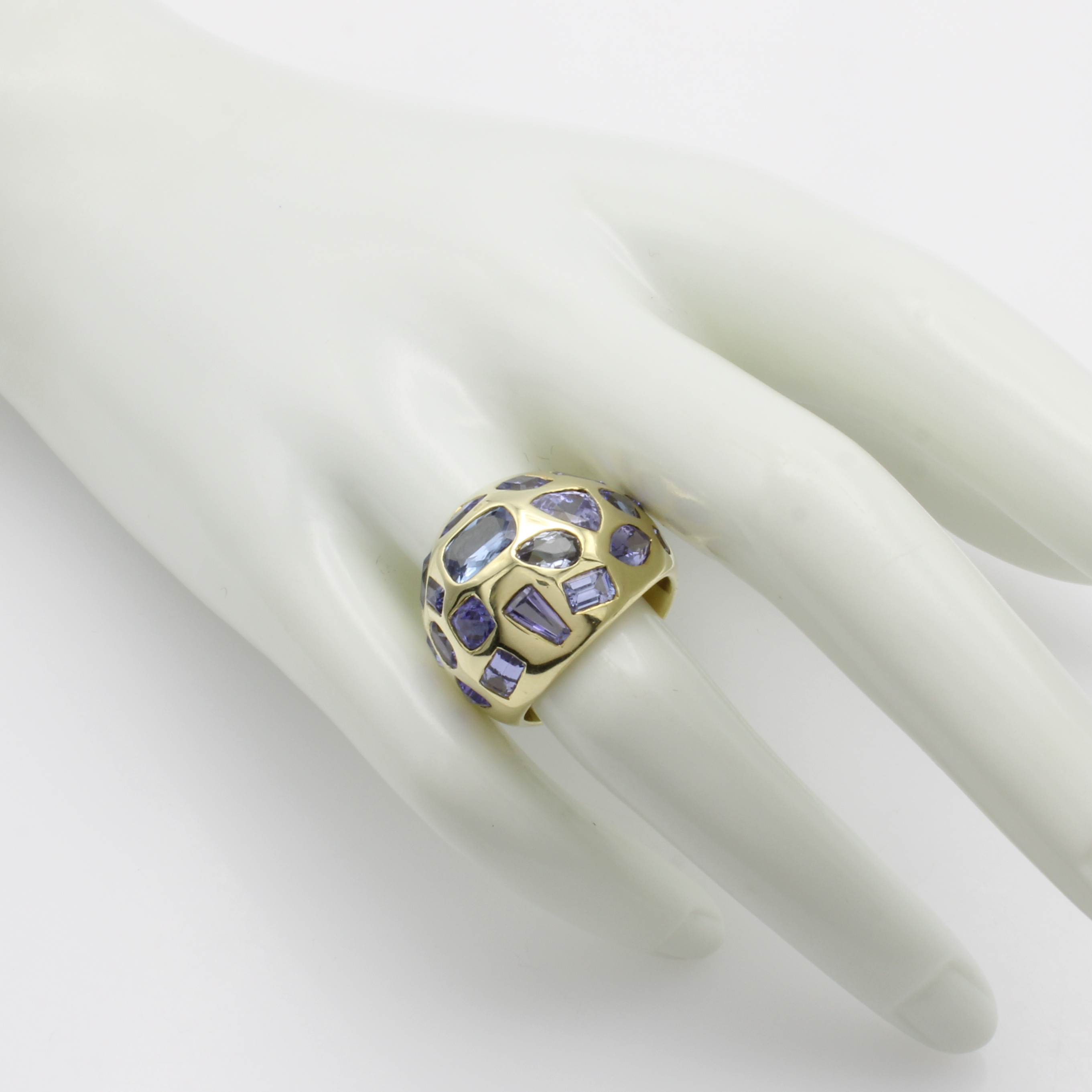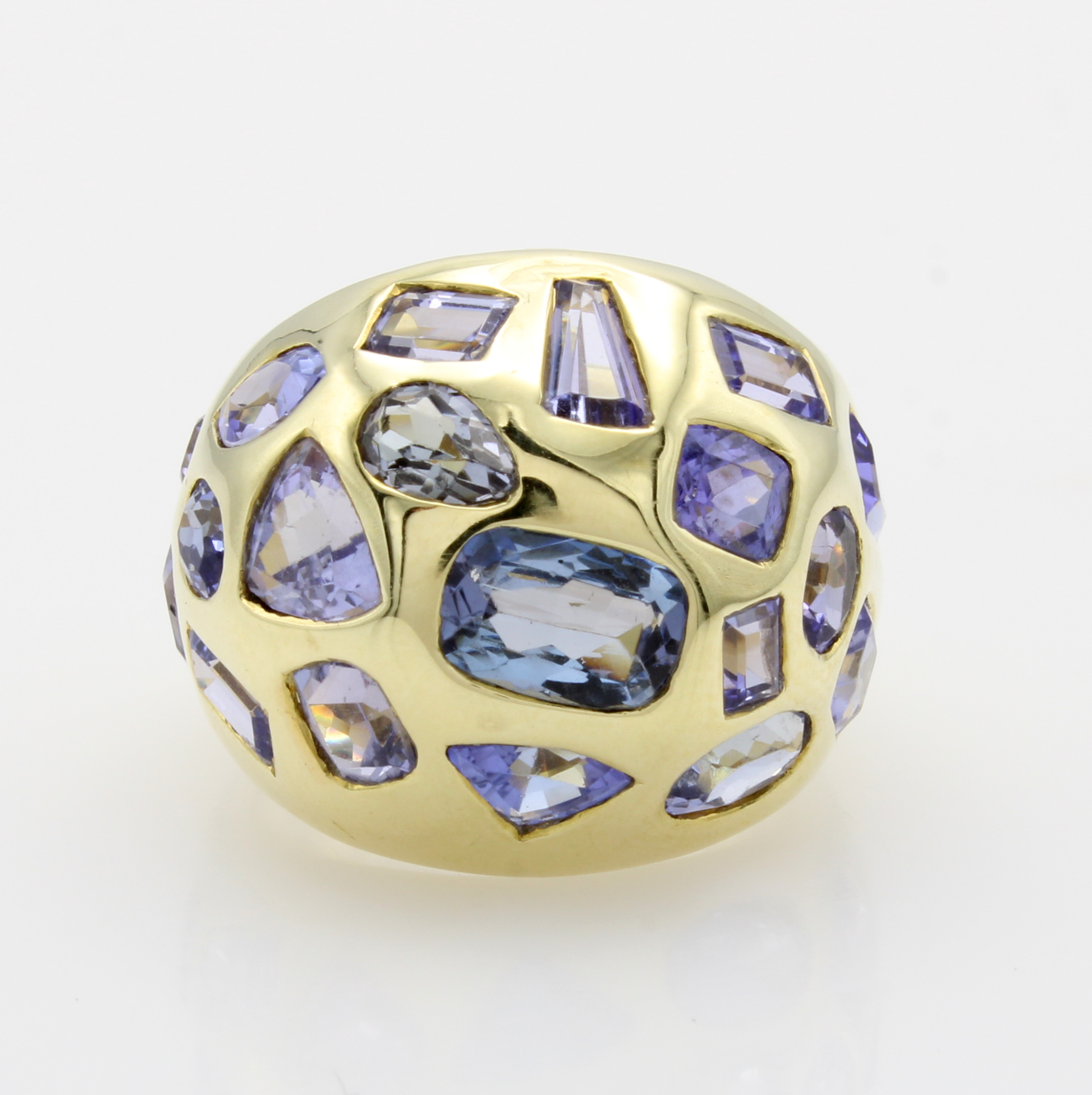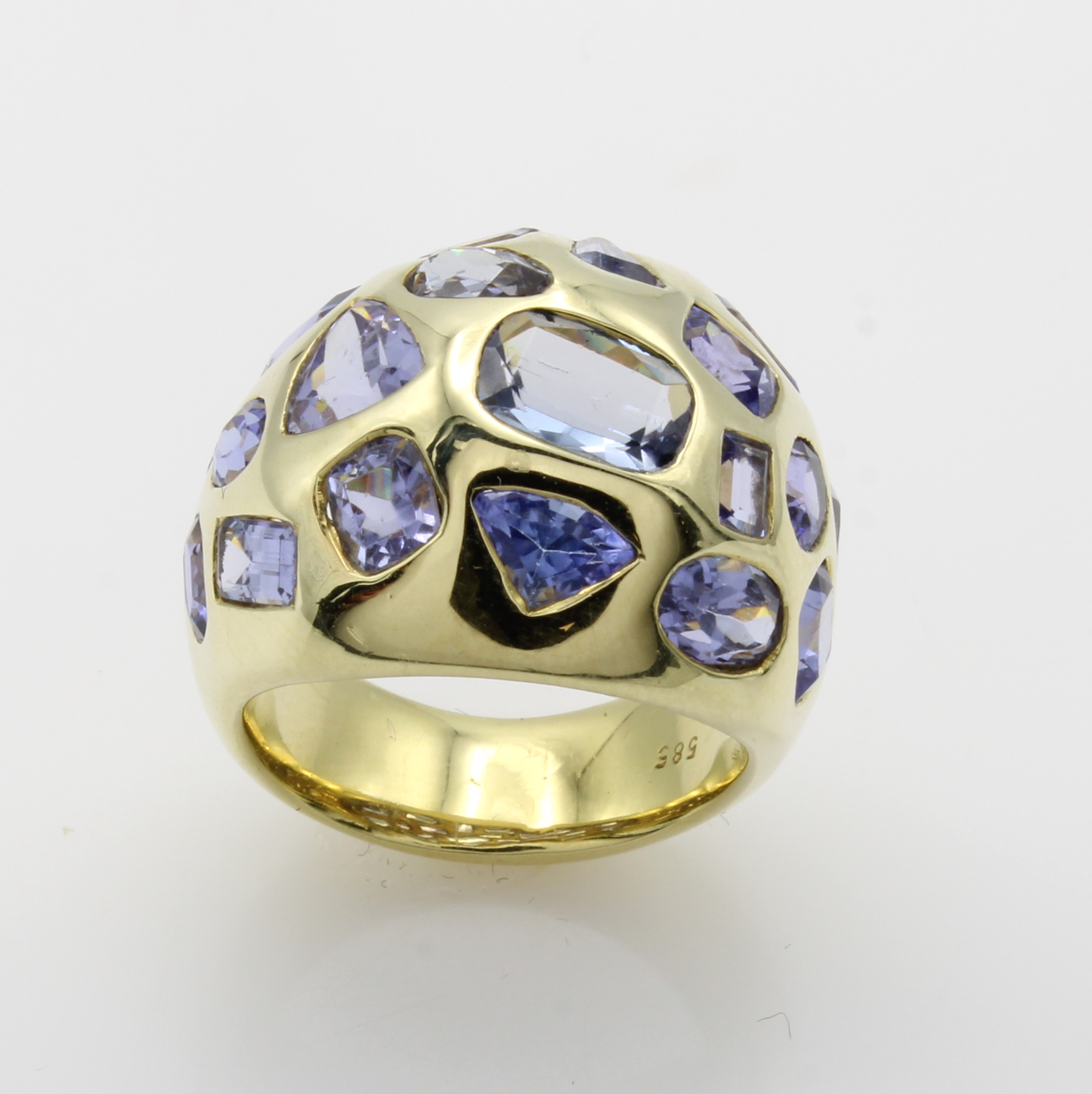 Ring mit Tansaniten, GG 585/000, Tansanite in versch. Schliffarten zus. ca. 7.6 ct, gewölbter Ringkopf, RW ca. 53 Schätzpreis: 6300, - EUR