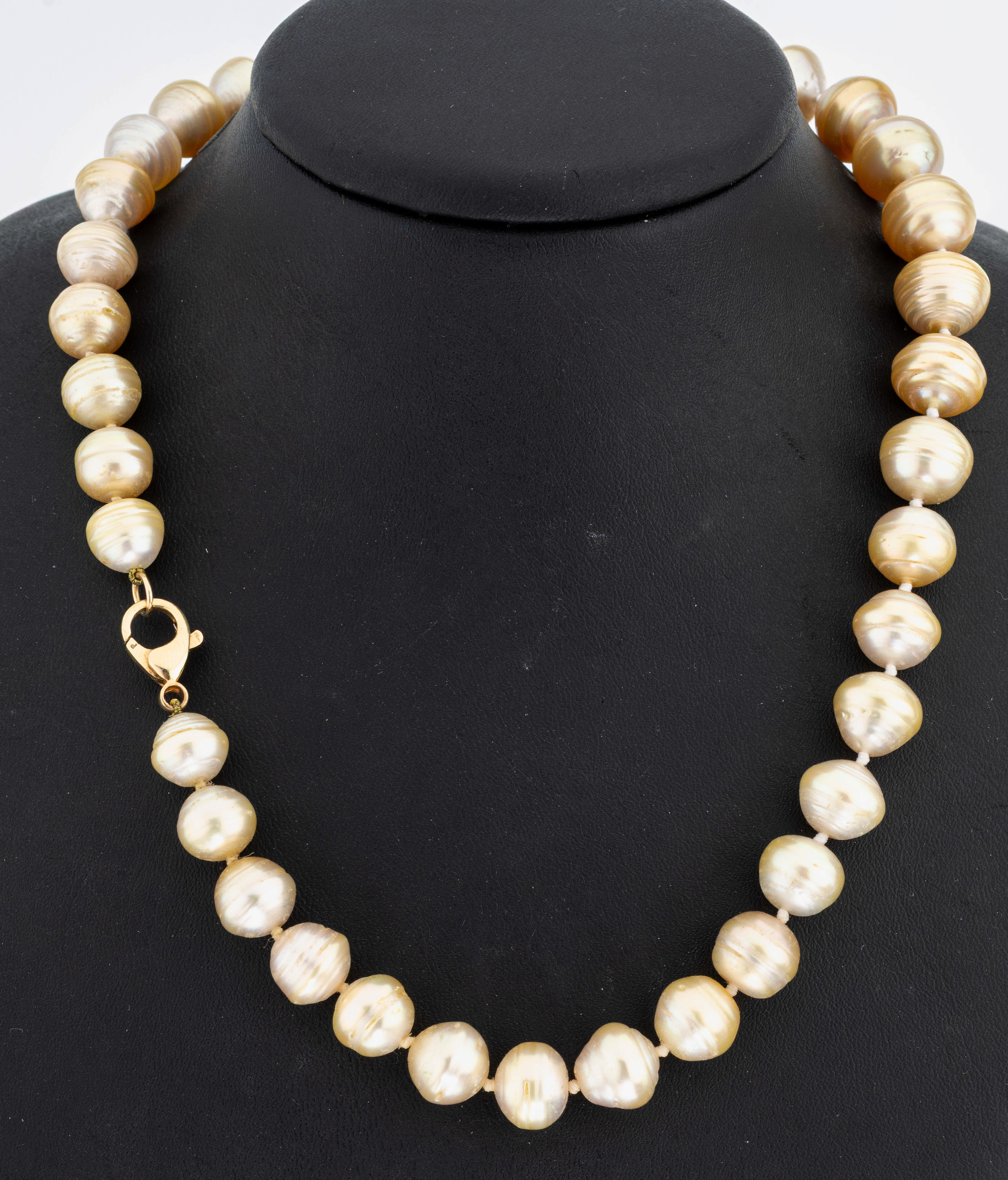 Perl-Collier, unrunde gelbliche Süßwasserzuchtperlen ca. 12 mm, nat. Wachstumsringe, L. ca. 44 cm, Karabinerschließe GG 585/000