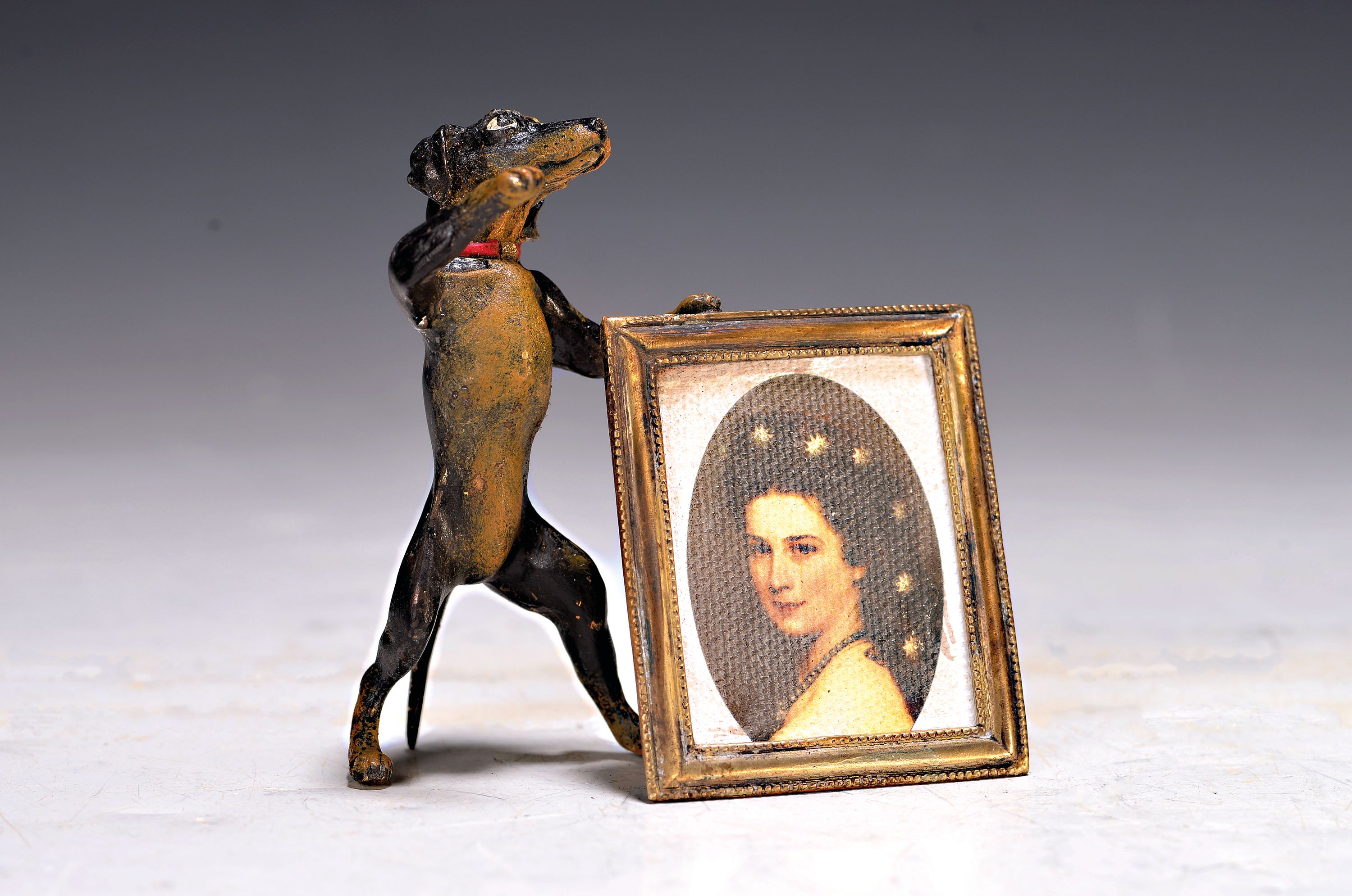 Wiener Bronze, sign. Bergmann, Dackel mit Portrait der Kaiserin Sissi, polychrom