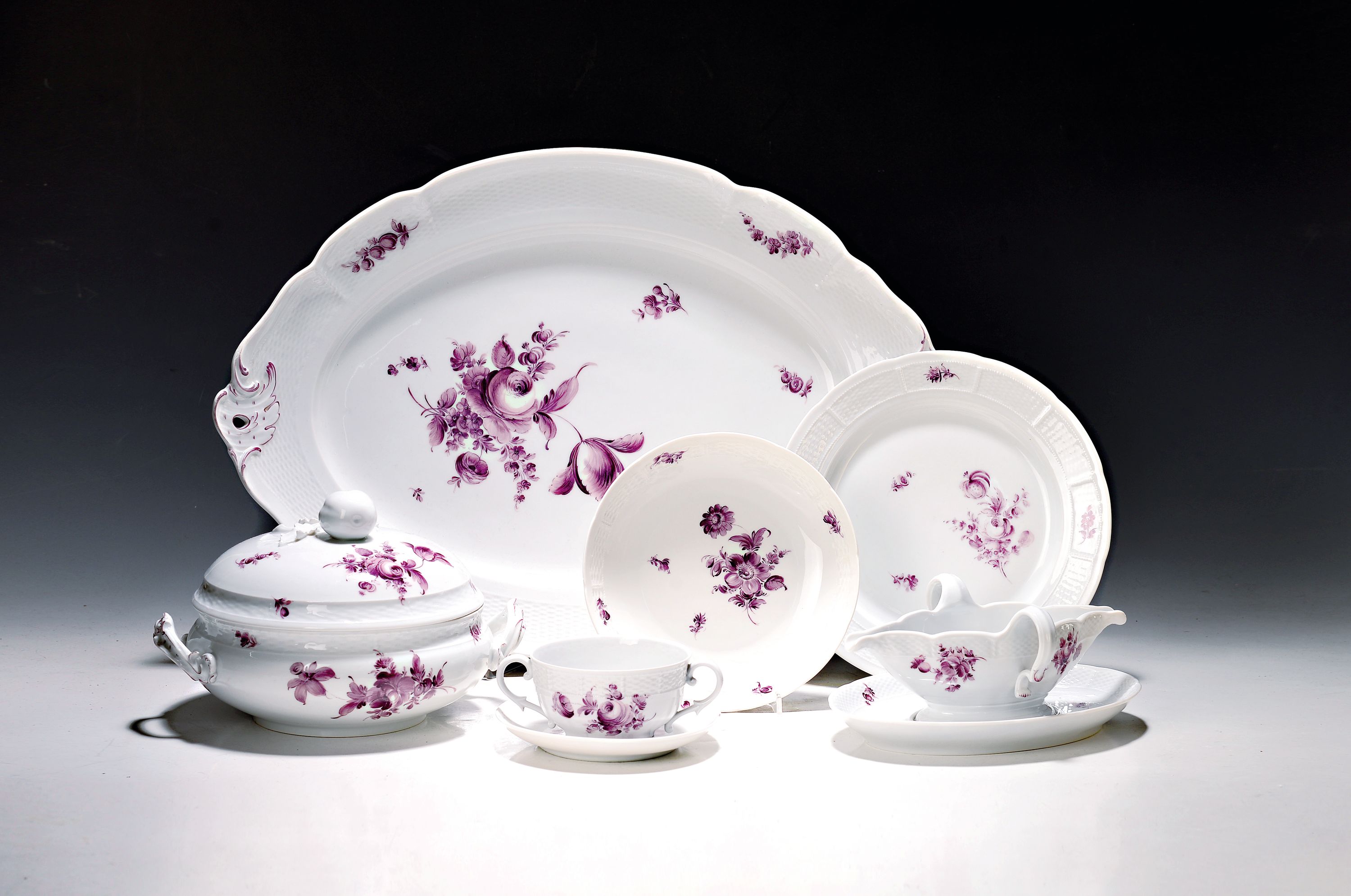 Umfangreiches Speiseservice, Nymphenburg, 20. Jh., purpurfarbene Bemalung, für 12