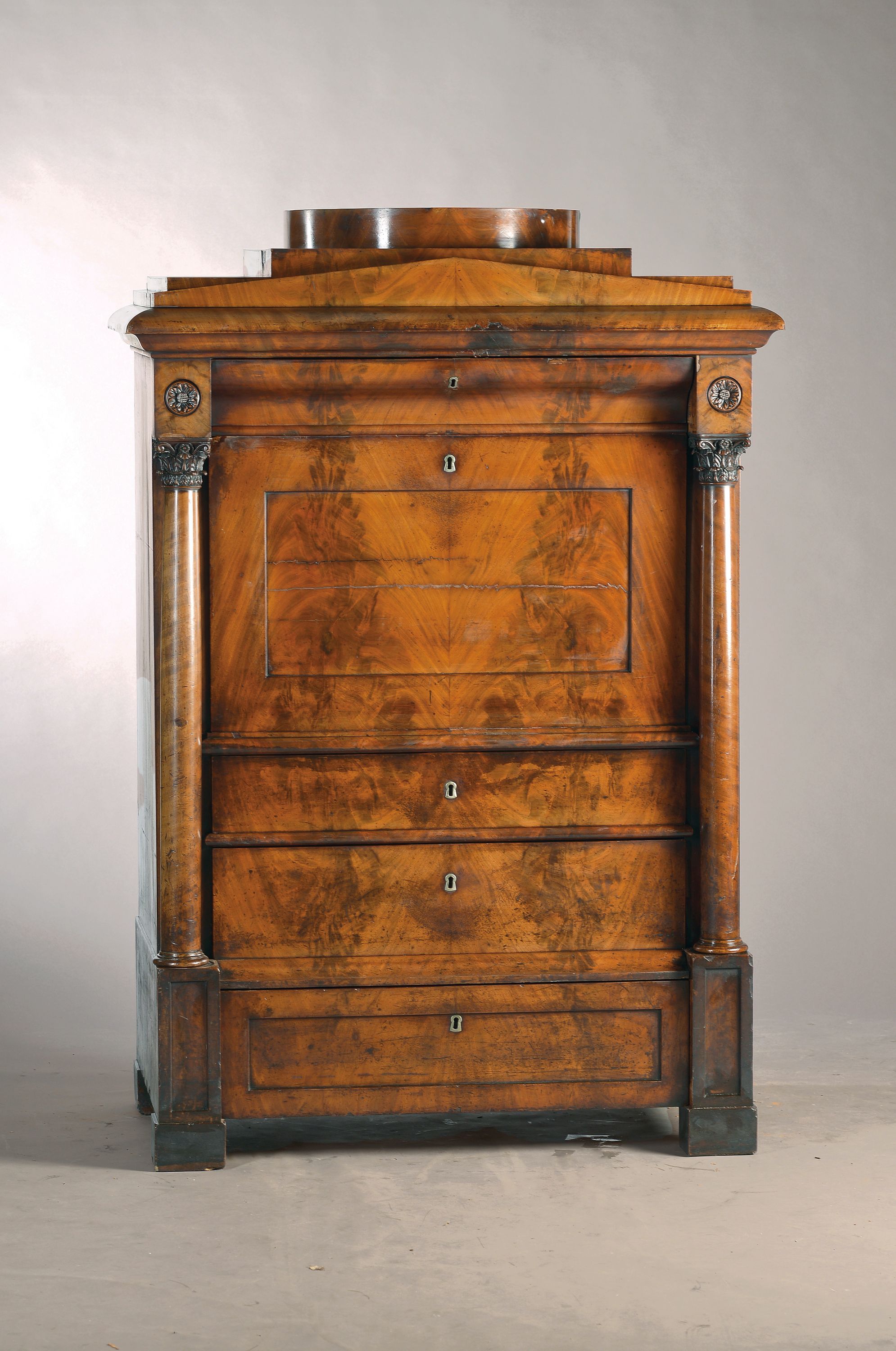 von Vollsäulen mit korinthischen Kapitellen, 4 große Schubladen, Innenleben mit