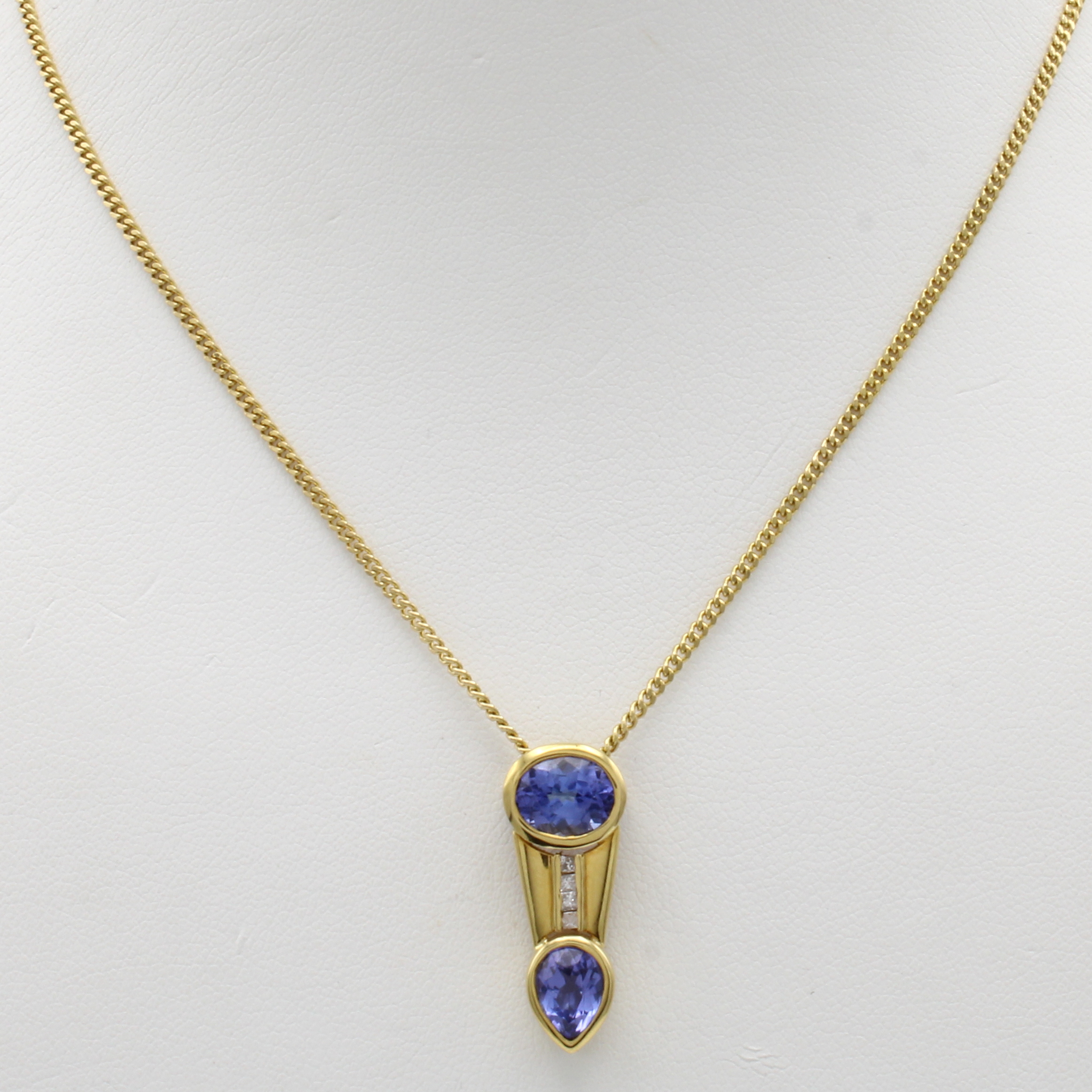 Anhänger mit Tansaniten und Diamanten an Kette, GG 750/000, 2 Tansanite zus. ca. 2.54 ct, Diam. im Carréeschliff zus. ca. 0.06 ct Weiß/p, L. ca. 51 cm Schätzpreis: 6100, - EUR
