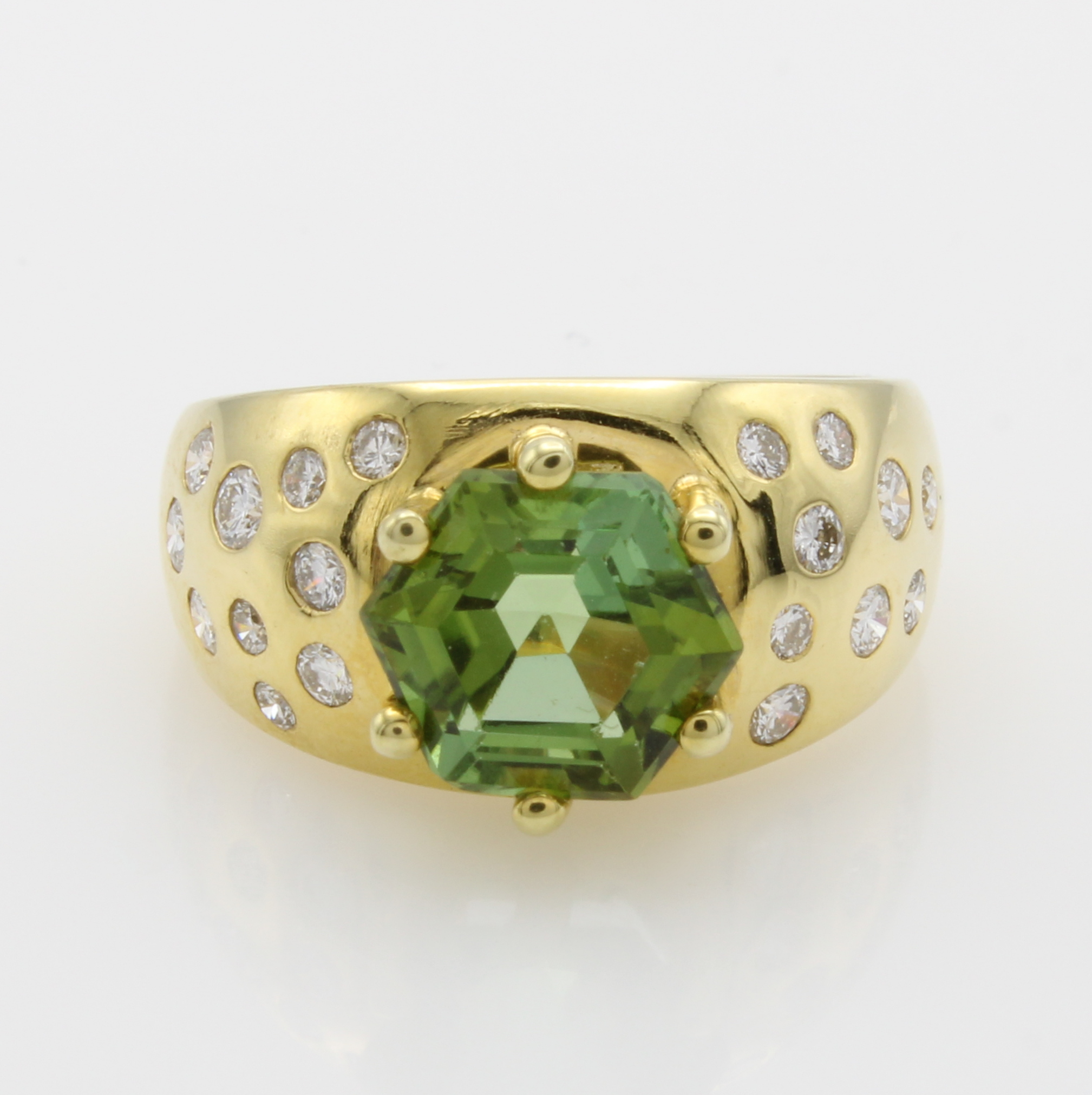 Ring mit Turmalin und Brillanten, GG 585/000, hexagonförm., grüner Turmalin in Krappen- fassung ca. 3.35 ct, Brill. in Ringschultern verstreut gefasst zus. ca. 0.53 ct Weiß/si, RWca. 57 Schätzpreis: 5800, - EUR
